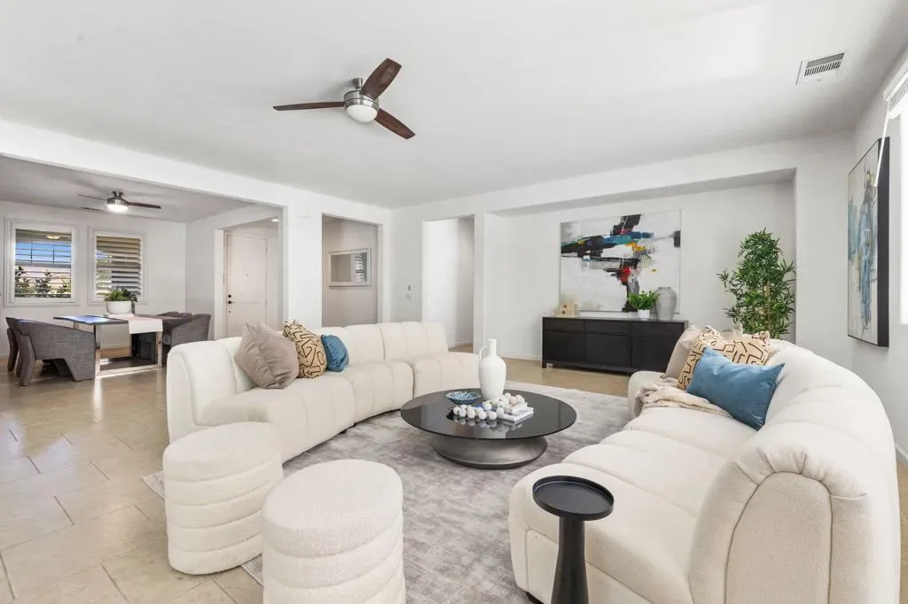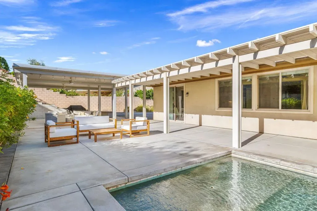 POINT OF VIEW – MORNING LIGHT, MOUNTAIN VIEWS AND A POOL THAT ACTUALLY GETS USED YEAR ROUND! SOLAR OWNED!This is what living in Palm Springs area looks like – not just vacationing here. Comfort, privacy, and style in this spacious single-family home located in the desirable gated community of The Gallery in Palm Desert. Second home? Investment OR 1031 Exchange? Price adjustment = value and versatility. 3 Bedrooms | PLUS Spacious Den/Office – or a 4th bedroom conversion. Totaling 2,620 Sq Ft. Large & private 17,000+ Sq Ft, Drought tolerant lot w/drip irrigation. Resort style Pool & Spa – with tanning ledge. Open Floorplan – great use of space between living, dining, and kitchen areas.Private gated Courtyard Entry – with mountain views. Expansive Backyard – covered gazebo structure with mist system & exterior lighting (patio furniture under structure remains w/house).Two-Car Garage w/ Tandem Parking – AND/AC for comfort and storage. The Gallery is a gated community w/low HOA dues and provides a serene desert escape with convenient access to El Paseo shopping, dining, golf courses & Grocery & coffee shops.