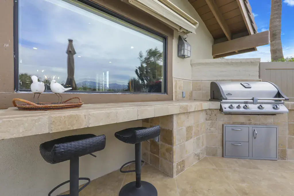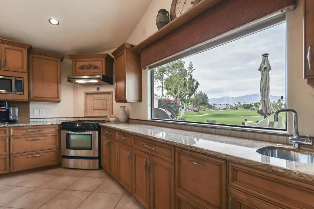 Wow! This reimagined Laredo plan has been opened into a stylish Great Room with newer kitchen, stainless steel appliances, and massive picture window. The living room features a new porcelain tile fireplace and opens to a rear patio with new tile, a built-in BBQ and a plumbed firepit. The dining area has a slider to the sideyard. A den provides additional family or flex space. Two bright bathrooms feature skylights, and the primary bedroom includes an added walk-in closet. The expanded laundry room adds convenience with direct access to the garage. Enjoy panoramic views of double fairways, lakes, and mountains from one of The Lakes’ premier view locations. An enormous private side yard offers fountains, lush landscaping, firepit, and night lighting–ideal for entertaining, relaxing, or pets. Common area pool next door. Attached 2-car garage. Located in The Lakes CC with 27 holes of golf, a fabulous clubhouse, a state of the art fitness center, Bocce Ball, Racquet Center, 44 pools and spas. Offered furnished. Move-in ready and priced to sell.