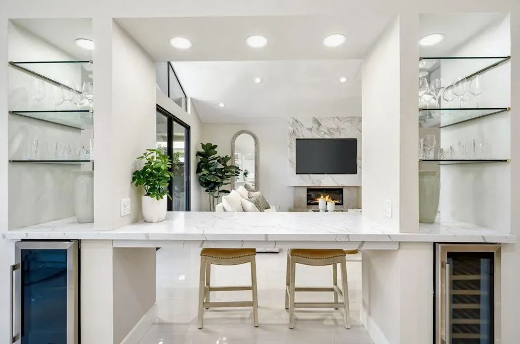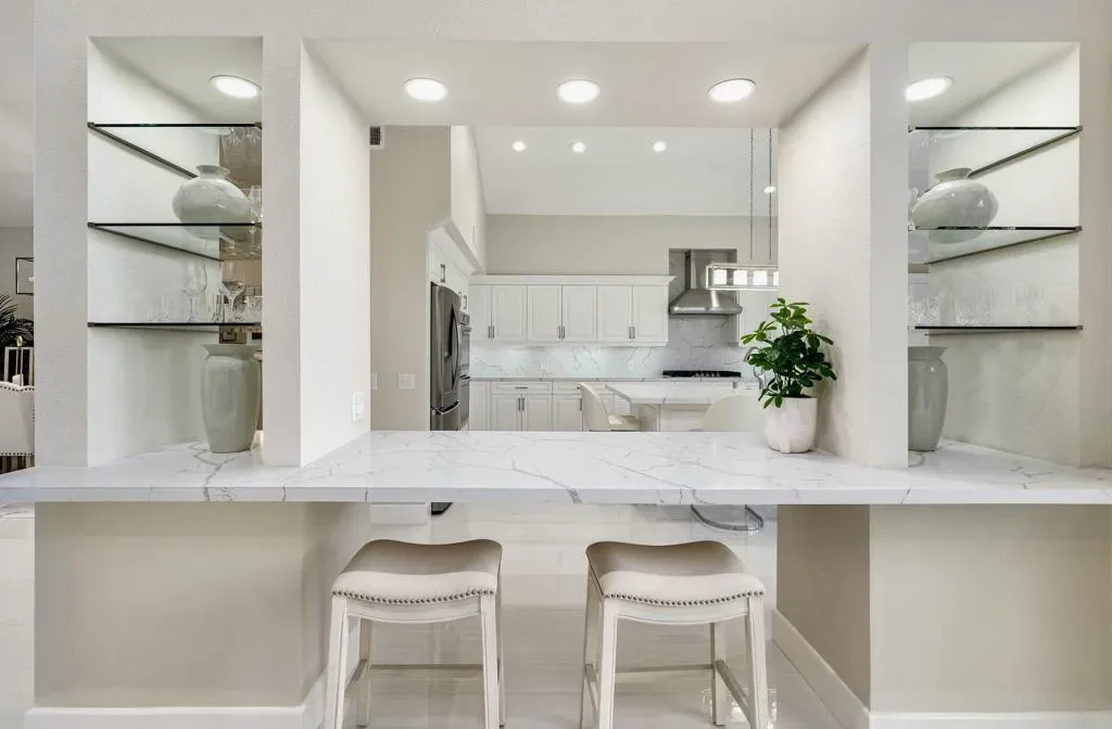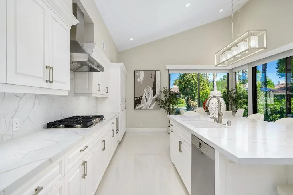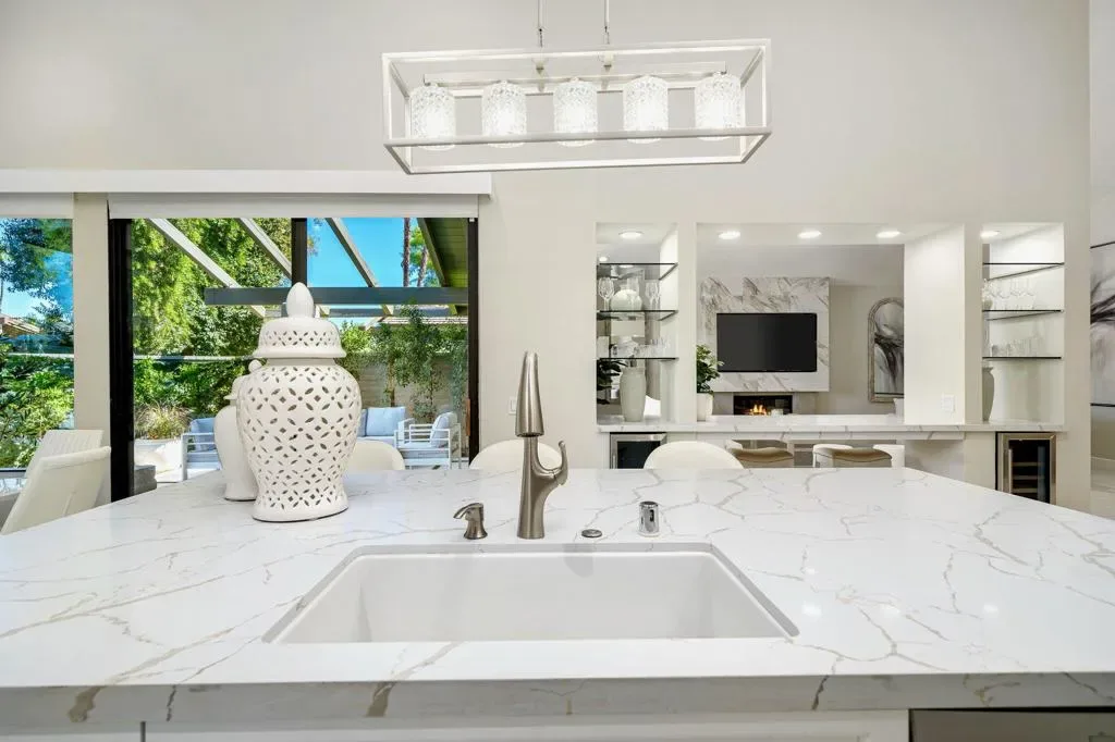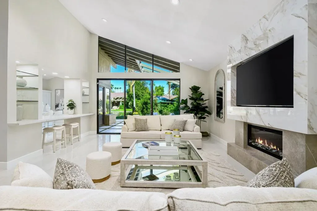 The Owner is selling to move back home. Every inch of this chic, contemporary Tucson model has been completely remodeled and thoughtfully redesigned for open, floor-plan living.The Spectacular Chef’s Kitchen is the heart of the home, featuring a massive 38-sq-ft quartz island, Bosch dishwasher, double ovens, wine and beverage coolers, stainless steel appliances, cooktop with custom hood, quartz backsplash, new cabinetry, and a spacious pantry–ideal for both entertaining and everyday living.Designer Finishes include 24” x 48” cream porcelain tile throughout, 5” baseboards, fresh interior paint, LED lighting. The dramatic living area is highlighted by a floor-to-ceiling porcelain fireplace wall showcasing a 75” flat-screen TV and sleek horizontal electric fireplace.All Bathrooms have been fully gutted and rebuilt with raised quartz countertops, custom mirrors, crystal lighting, frameless walk-in showers, new fixtures, and cabinetry. The oversized primary ensuite is a true retreat, featuring a freestanding soaking tub, dual sinks, a frameless shower, and elegant finishes throughout.Your Private Outdoor Living is equally impressive with a built-in BBQ, checkerboard faux-grass patio, and serene lake views accented by a water-fountain feature–perfect for relaxing or entertaining. No pesky golf-balls here!!Located in the quiet center of The Lakes Country Club, known for its beautifully remodeled clubhouse, full-service Lifestyle & Wellness Center, 27 holes of golf, and one of the most fun, friendly, and active communities in the valley. Just three doors from a community pool & spa. Offered turnkey–just bring your toothbrush and begin living the good life!
