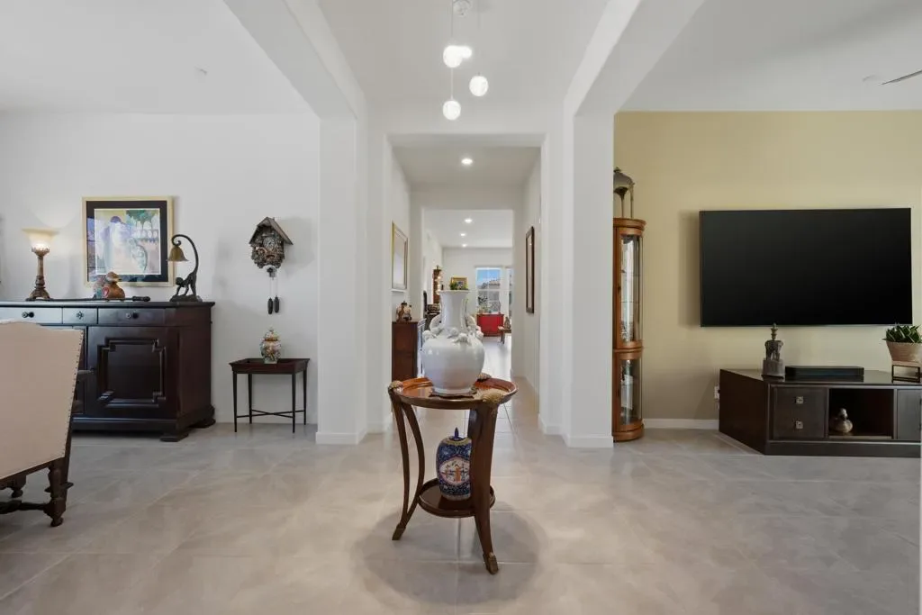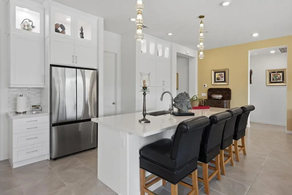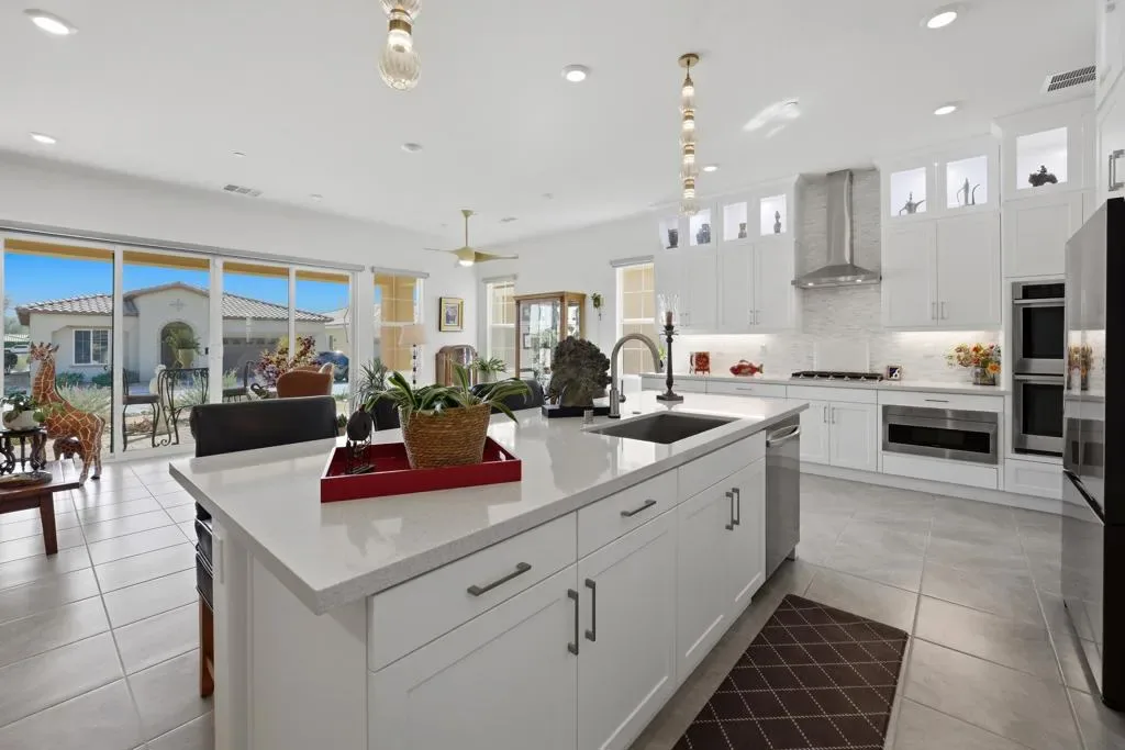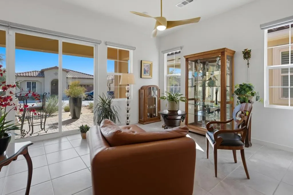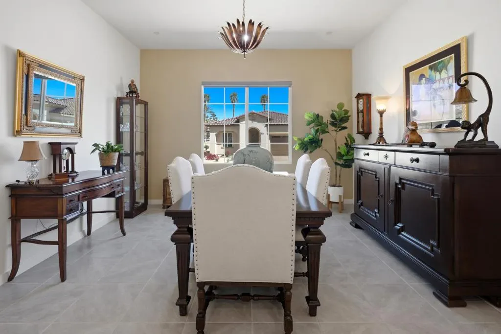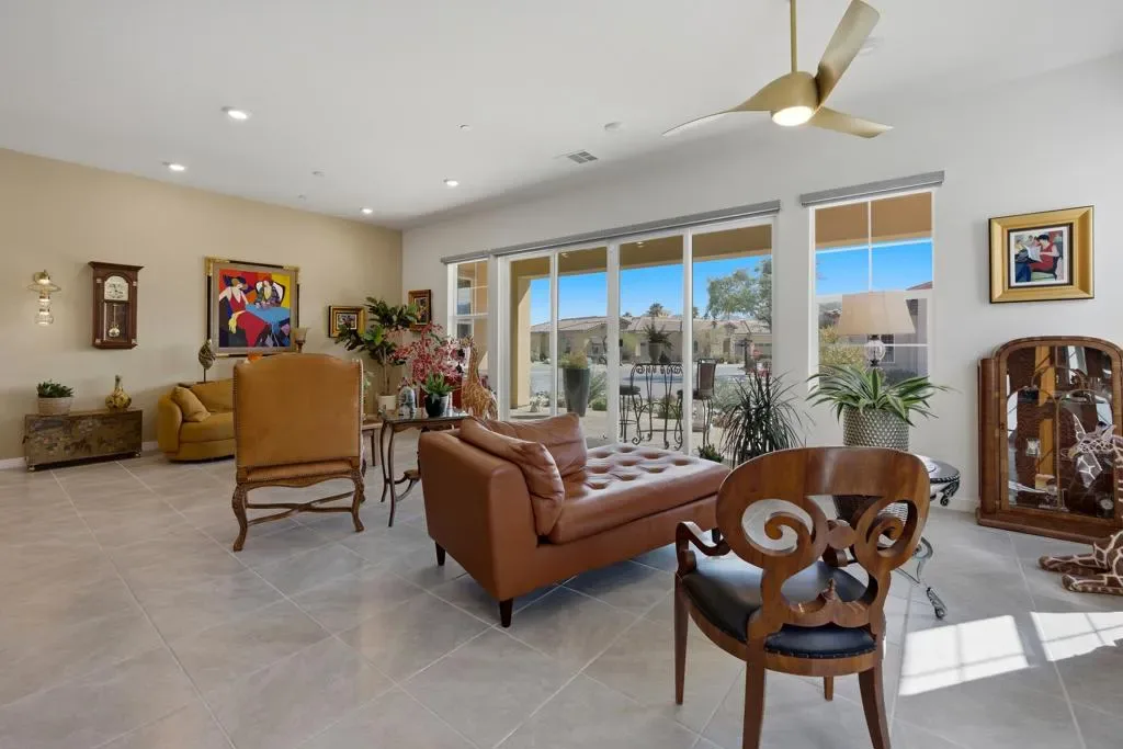 Welcome to Villa Portofino, the valley’s premier 55+ community. This highly sought after Milano floorplan boasts 2341 square feet with a VERY open design. Only 2 years old, this home has been upgraded throughout. The great room, with sliding glass doors to the rear patio with 2 ceiling fan/light fixtures, is open to the kitchen with beautiful mountain views and an abundance of natural light. The kitchen boasts a new drawer microwave oven, marble backsplash and custom cabinetry with illuminated glass uppers, soft close cabinet doors and drawers with pull-out shelves. The primary suite has more of those amazing mountain views with a large soaking tub and even larger, new dual walk in shower. The den and dining room spaces could be modified into possible third and fourth bedrooms if desired. Tile throughout this home keeps it cool year-round. There’s also a separate A/C split in the garage for year-round comfort. 15 Solar panels, owned, not leased, make this home extremely efficient to cool. The HOA fee covers Fire & Earthquake insurance on building, trash pick up, water for landscape, landscape maintenance and replacement, Cable TV including HBO and high speed internet. The 30,000 square foot Clubhouse offers 2 restaurants, a full gym, movie theater, billiards and game room, shuffleboard, bocce ball, pool and spa. Villa Portofino is located in the heart of the valley with El Paseo, The McCallum Theater, The Shops at Palm Desert and Eisenhower Medical Center just minutes away. Truly a Must-See. Make your appointment to tour this beautiful home today.