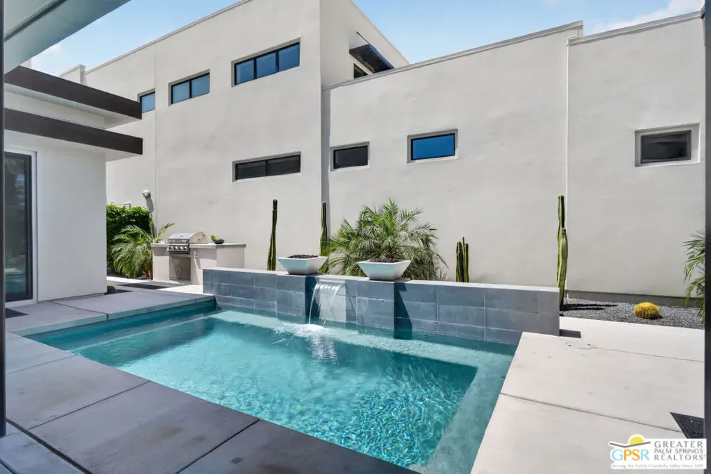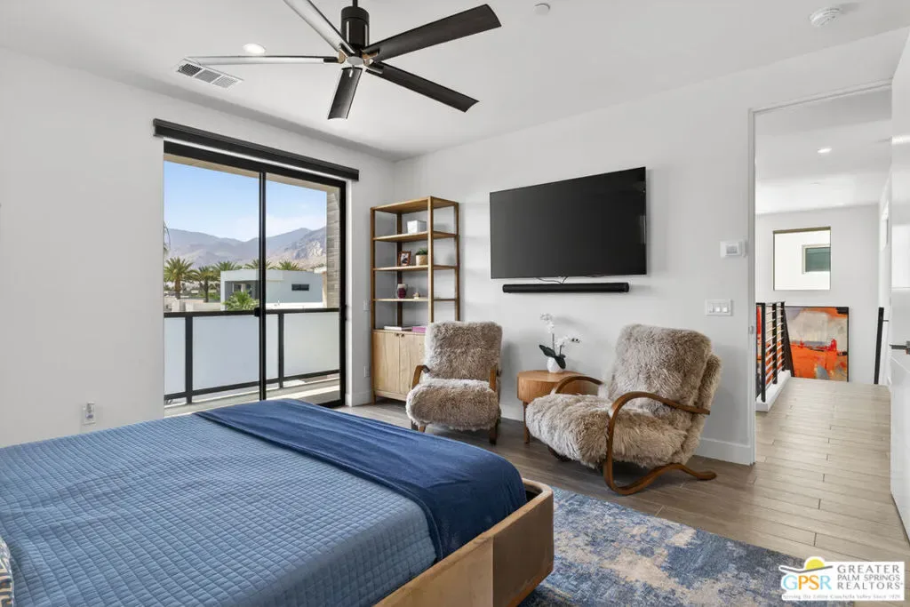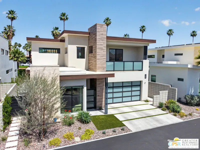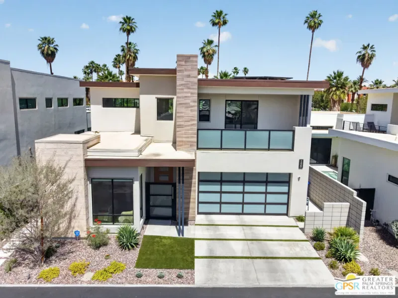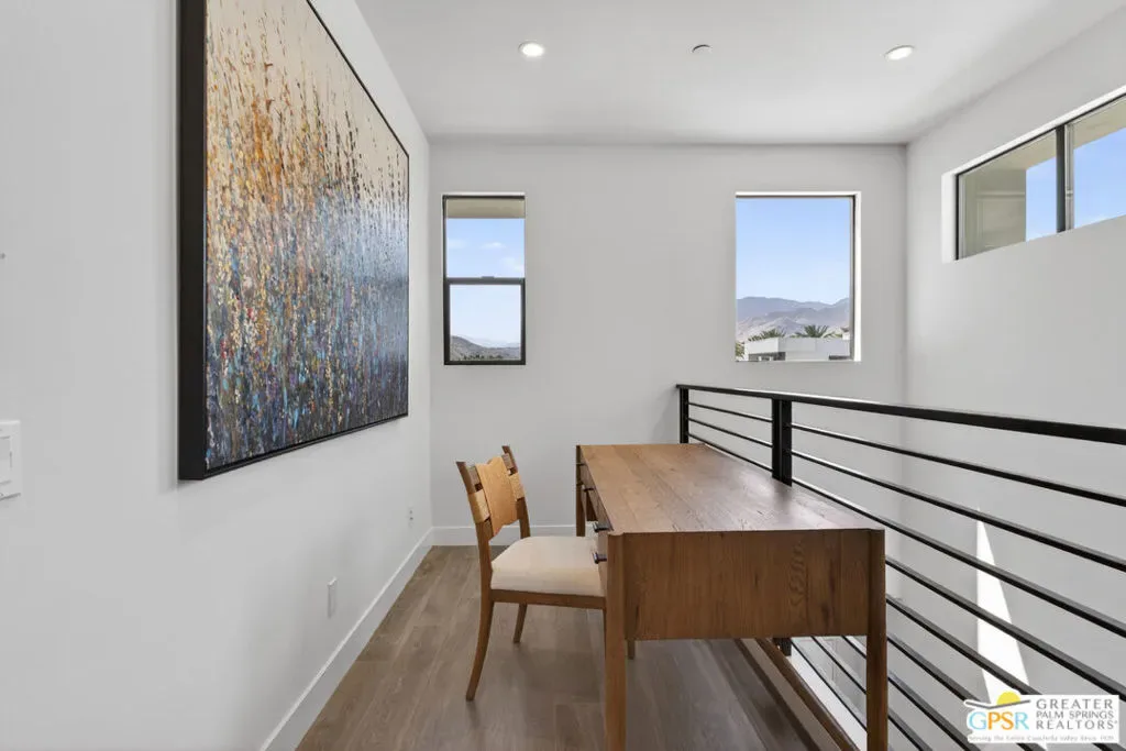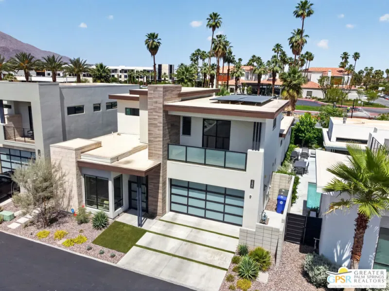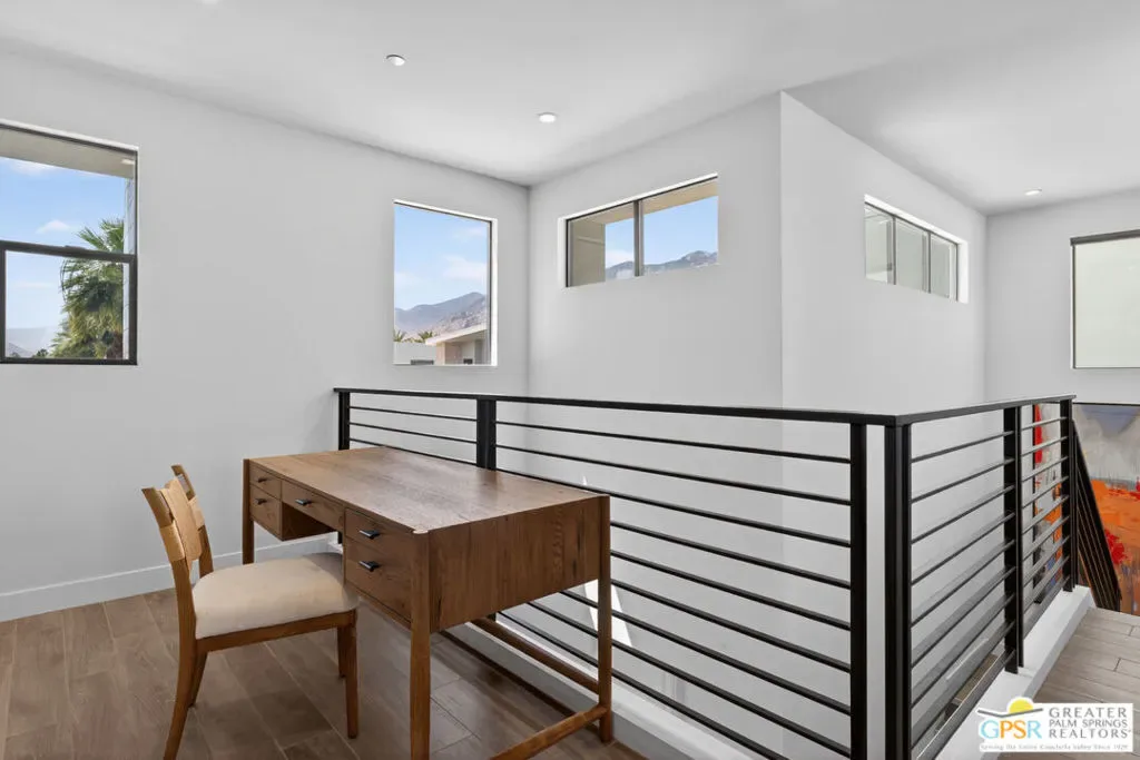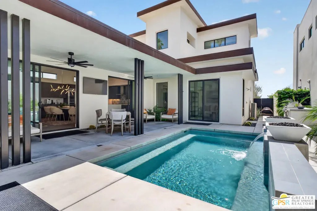 Welcome to 1320 Woodward at VUE, Where striking modern architecture pairs with laid-back desert living in one of Palm Springs’ most visually compelling neighborhoods. This is more than a home; it’s a statement of style, sophistication, and intentional design, where dramatic scale, clean lines, and walls of glass create a seamless connection between indoors and out. Offering the largest floor plan in VUE at an impressive 2,693 sq. ft., this 4-bedroom, 3.5-bath residence (with the 4th bedroom currently styled as a chic office/den) delivers both flexibility and privacy. A smart, modern layout places a guest retreat on the second level, ideal for visitors or multigenerational living. Every element has been thoughtfully elevated with designer finishes and premium upgrades, including a top-tier Thermador appliance suite with integrated wine refrigeration, EV charging, and an expanded OWNED solar system with 41 panels for optimal efficiency. Step outside to your own private resort. The reimagined pool is a showpiece, featuring a dramatic waterfall, fire bowls, outdoor shower, and built-in BBQ perfect for unforgettable evenings under the desert sky. Bold architecture, refined materials, and an unbeatable Palm Springs setting this is VUE living at its finest, crafted for those who demand exceptional design and elevated everyday living.