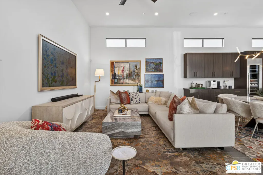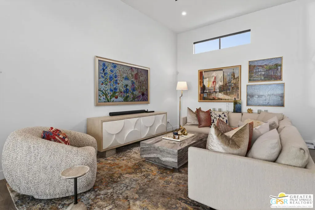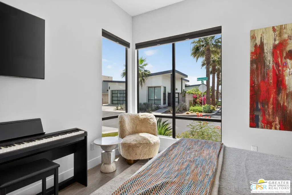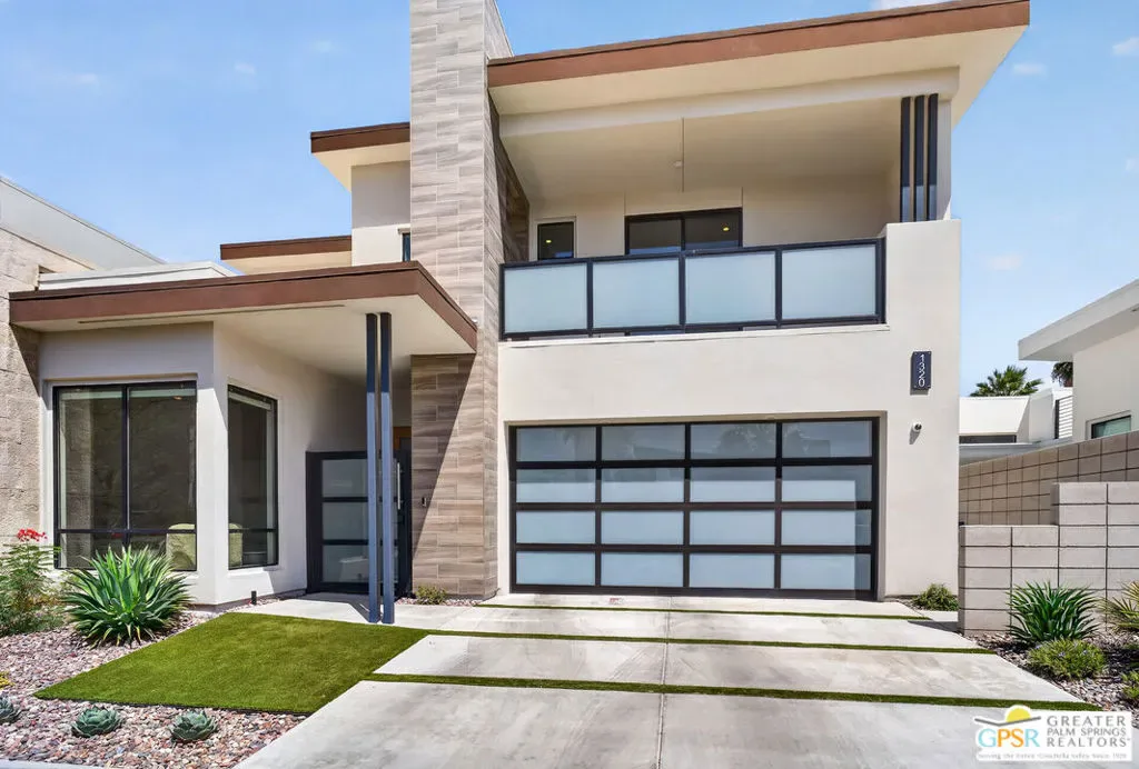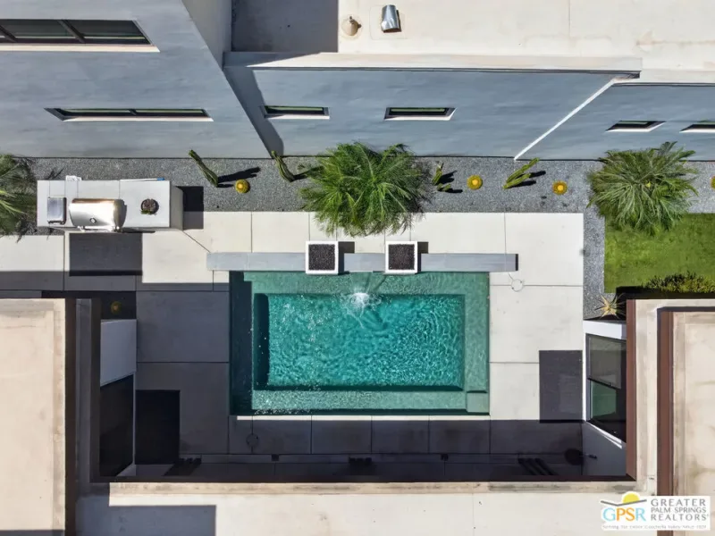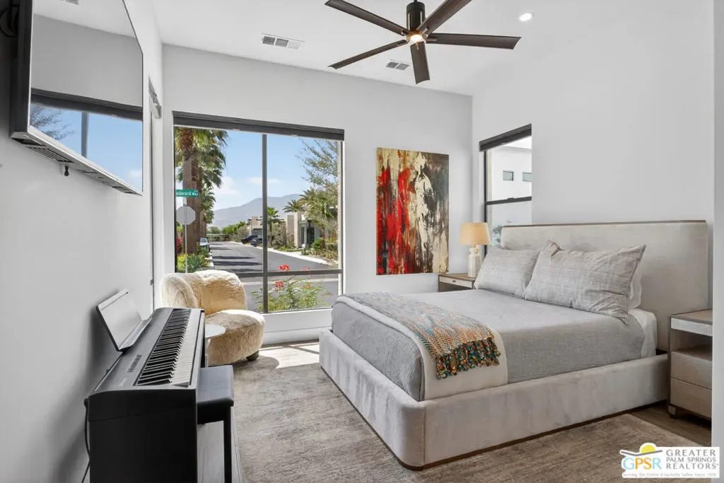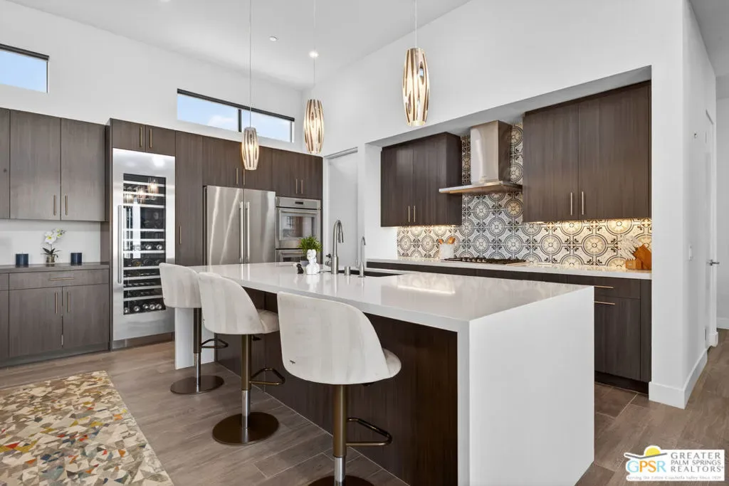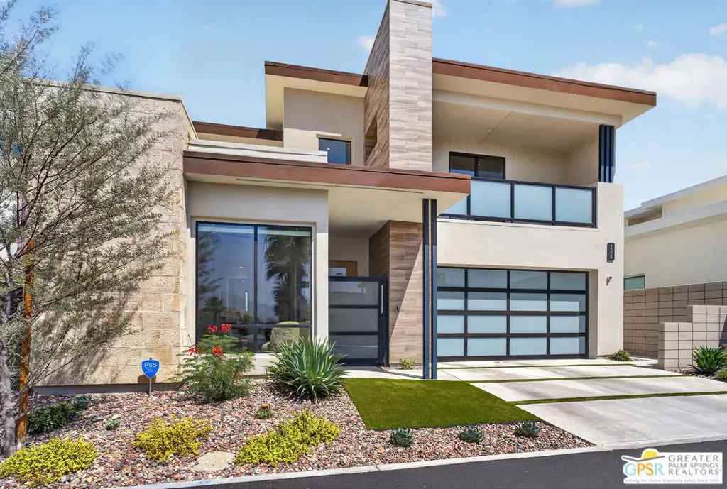 Welcome to 1320 Woodward at VUE, Where striking modern architecture pairs with laid-back desert living in one of Palm Springs’ most visually compelling neighborhoods. This is more than a home; it’s a statement of style, sophistication, and intentional design, where dramatic scale, clean lines, and walls of glass create a seamless connection between indoors and out. Offering the largest floor plan in VUE at an impressive 2,693 sq. ft., this 4-bedroom, 3.5-bath residence (with the 4th bedroom currently styled as a chic office/den) delivers both flexibility and privacy. A smart, modern layout places a guest retreat on the second level, ideal for visitors or multigenerational living. Every element has been thoughtfully elevated with designer finishes and premium upgrades, including a top-tier Thermador appliance suite with integrated wine refrigeration, EV charging, and an expanded OWNED solar system with 41 panels for optimal efficiency. Step outside to your own private resort. The reimagined pool is a showpiece, featuring a dramatic waterfall, fire bowls, outdoor shower, and built-in BBQ perfect for unforgettable evenings under the desert sky. Bold architecture, refined materials, and an unbeatable Palm Springs setting this is VUE living at its finest, crafted for those who demand exceptional design and elevated everyday living.