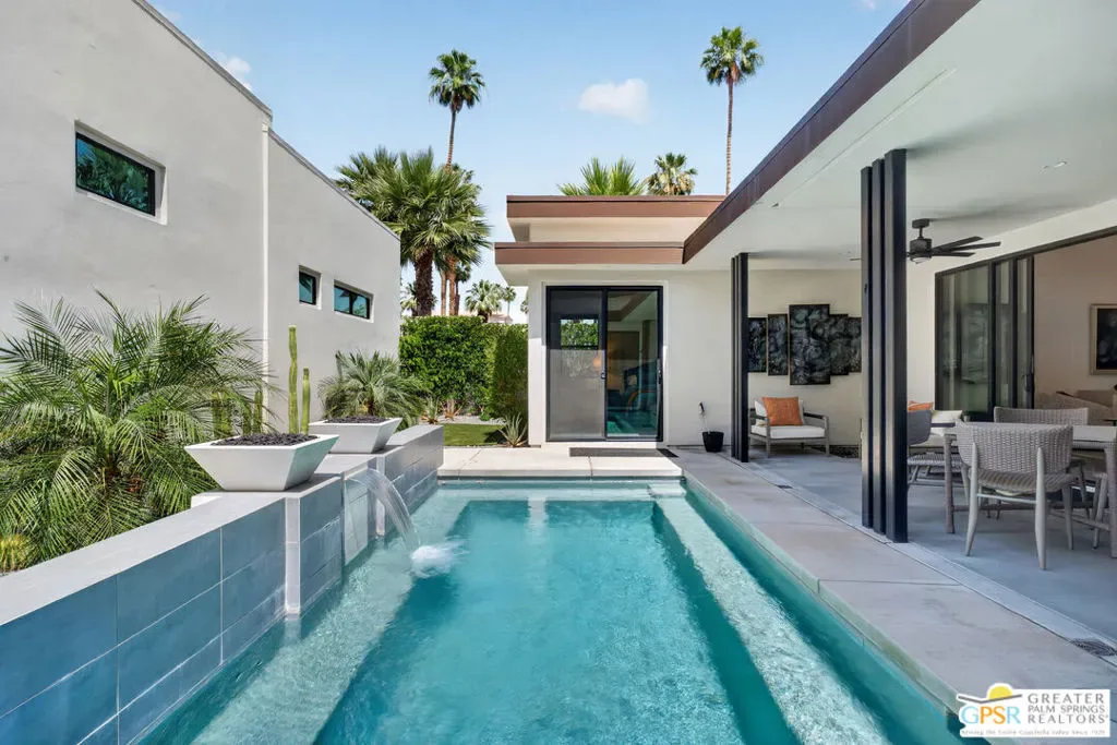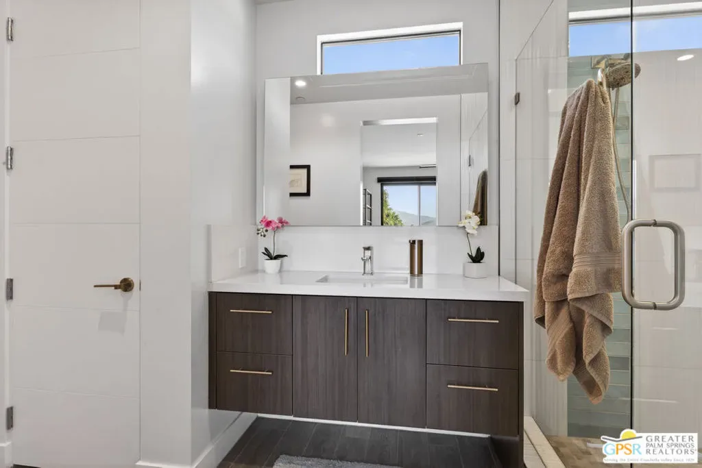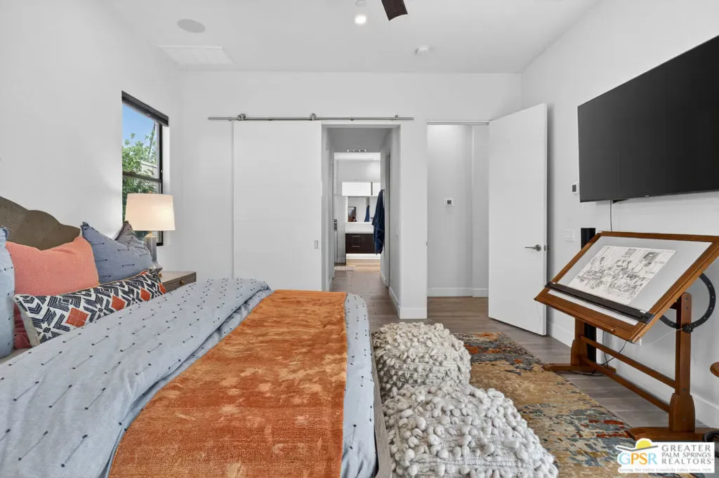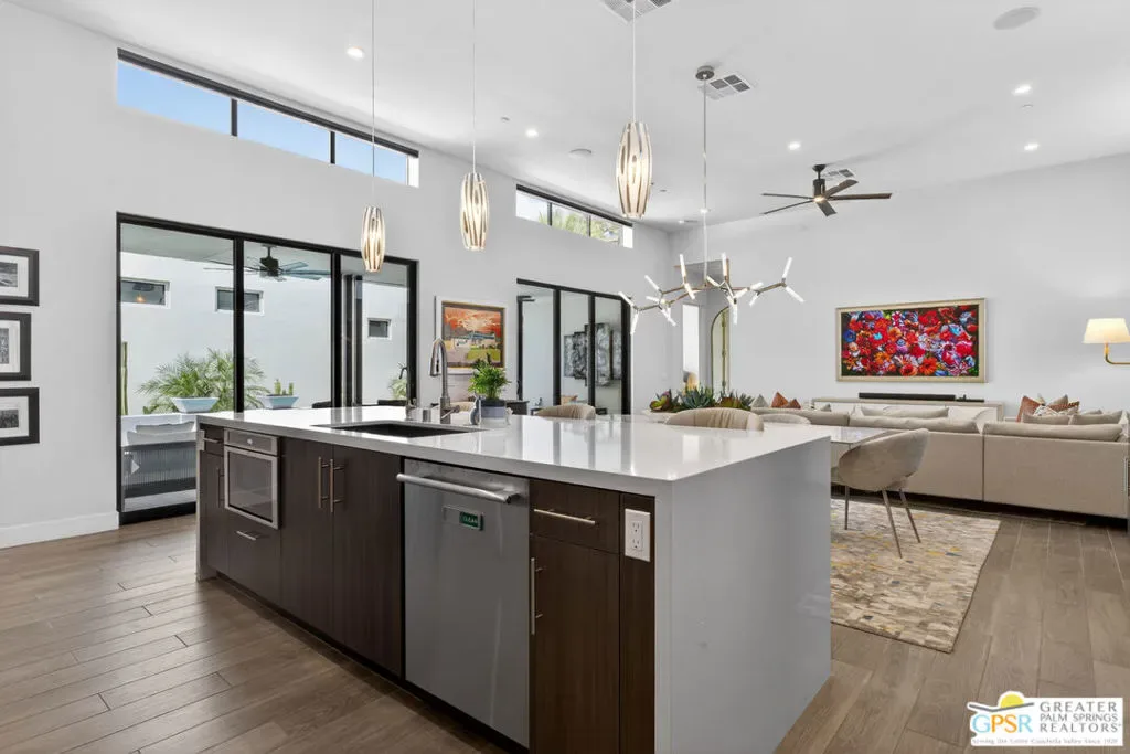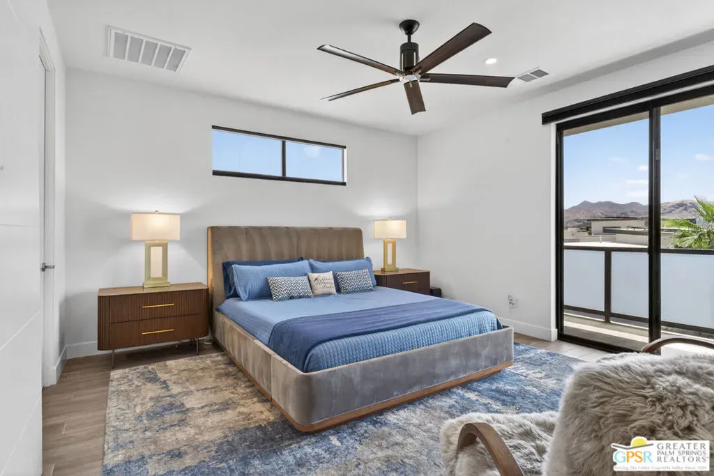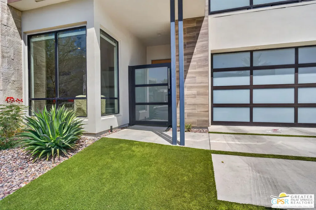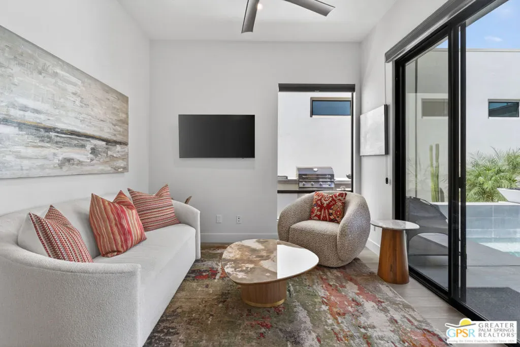 Welcome to 1320 Woodward at VUE, Where striking modern architecture pairs with laid-back desert living in one of Palm Springs’ most visually compelling neighborhoods. This is more than a home; it’s a statement of style, sophistication, and intentional design, where dramatic scale, clean lines, and walls of glass create a seamless connection between indoors and out. Offering the largest floor plan in VUE at an impressive 2,693 sq. ft., this 4-bedroom, 3.5-bath residence (with the 4th bedroom currently styled as a chic office/den) delivers both flexibility and privacy. A smart, modern layout places a guest retreat on the second level, ideal for visitors or multigenerational living. Every element has been thoughtfully elevated with designer finishes and premium upgrades, including a top-tier Thermador appliance suite with integrated wine refrigeration, EV charging, and an expanded OWNED solar system with 41 panels for optimal efficiency. Step outside to your own private resort. The reimagined pool is a showpiece, featuring a dramatic waterfall, fire bowls, outdoor shower, and built-in BBQ perfect for unforgettable evenings under the desert sky. Bold architecture, refined materials, and an unbeatable Palm Springs setting this is VUE living at its finest, crafted for those who demand exceptional design and elevated everyday living.