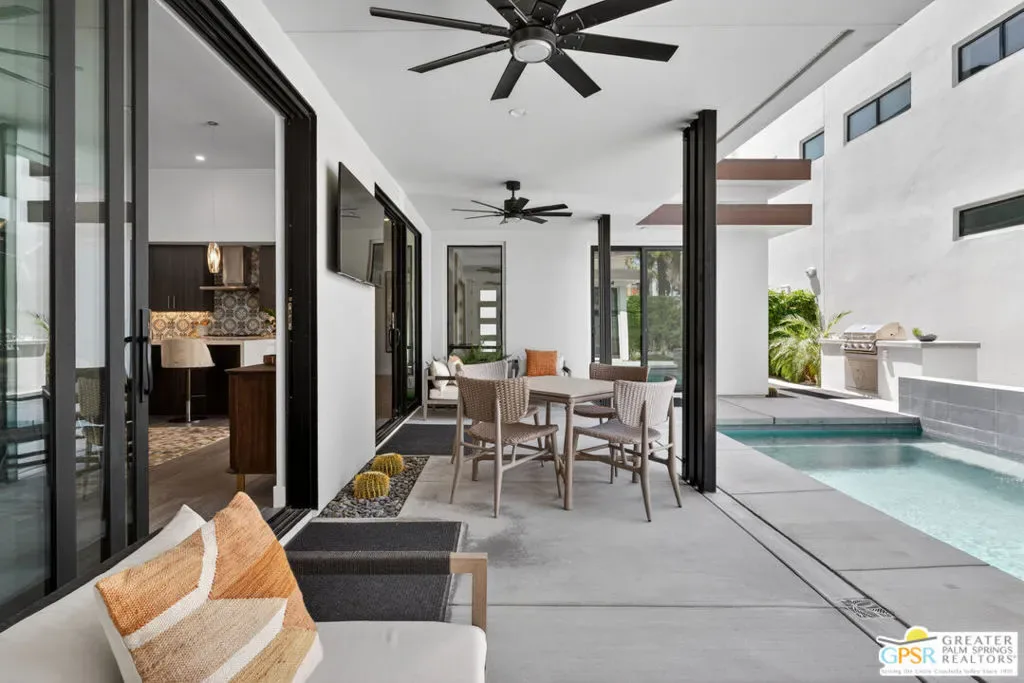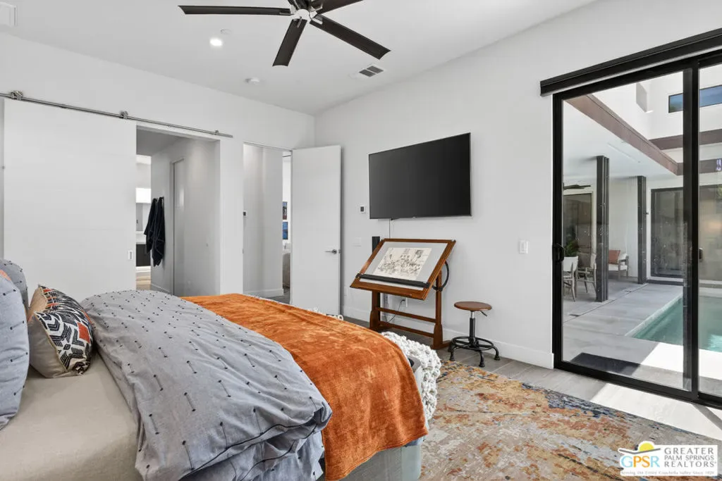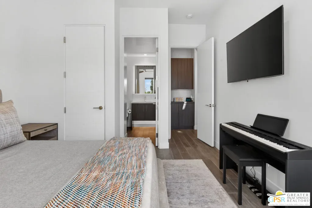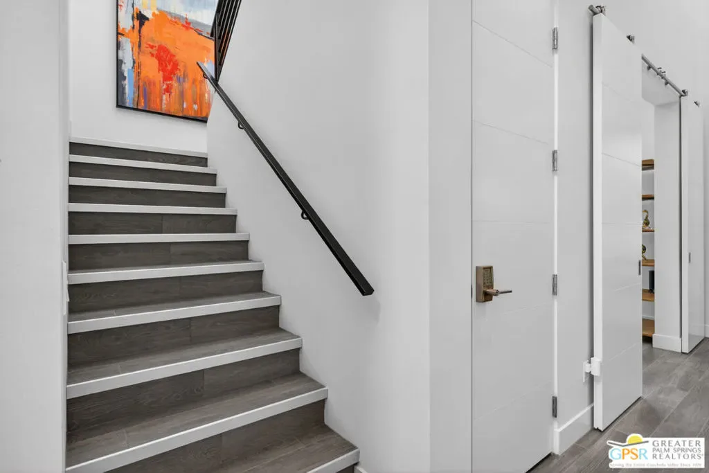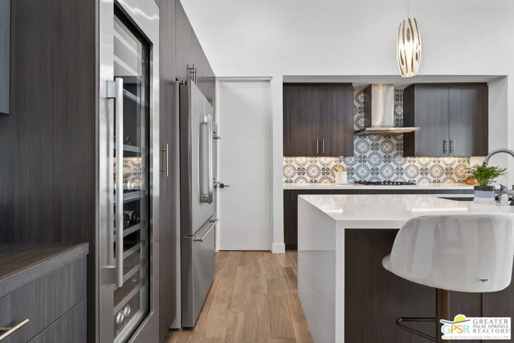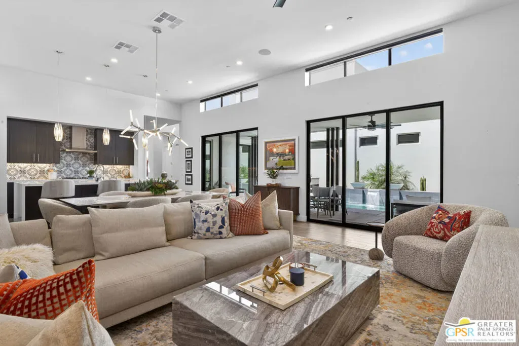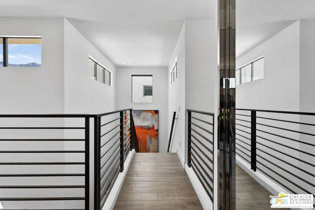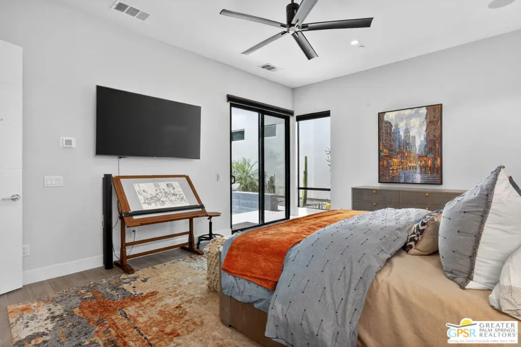 Welcome to 1320 Woodward at VUE, Where striking modern architecture pairs with laid-back desert living in one of Palm Springs’ most visually compelling neighborhoods. This is more than a home; it’s a statement of style, sophistication, and intentional design, where dramatic scale, clean lines, and walls of glass create a seamless connection between indoors and out. Offering the largest floor plan in VUE at an impressive 2,693 sq. ft., this 4-bedroom, 3.5-bath residence (with the 4th bedroom currently styled as a chic office/den) delivers both flexibility and privacy. A smart, modern layout places a guest retreat on the second level, ideal for visitors or multigenerational living. Every element has been thoughtfully elevated with designer finishes and premium upgrades, including a top-tier Thermador appliance suite with integrated wine refrigeration, EV charging, and an expanded OWNED solar system with 41 panels for optimal efficiency. Step outside to your own private resort. The reimagined pool is a showpiece, featuring a dramatic waterfall, fire bowls, outdoor shower, and built-in BBQ perfect for unforgettable evenings under the desert sky. Bold architecture, refined materials, and an unbeatable Palm Springs setting this is VUE living at its finest, crafted for those who demand exceptional design and elevated everyday living.
