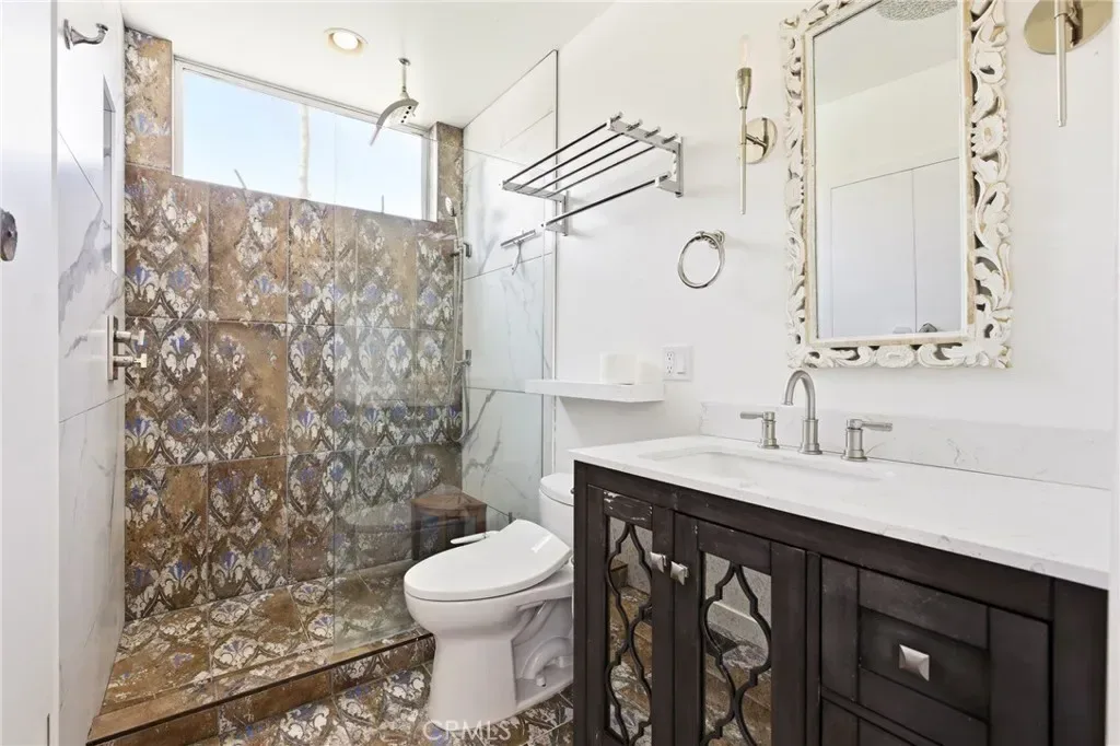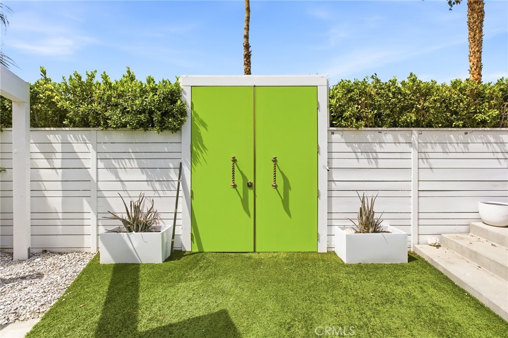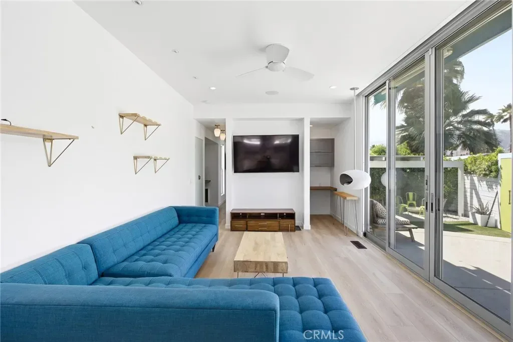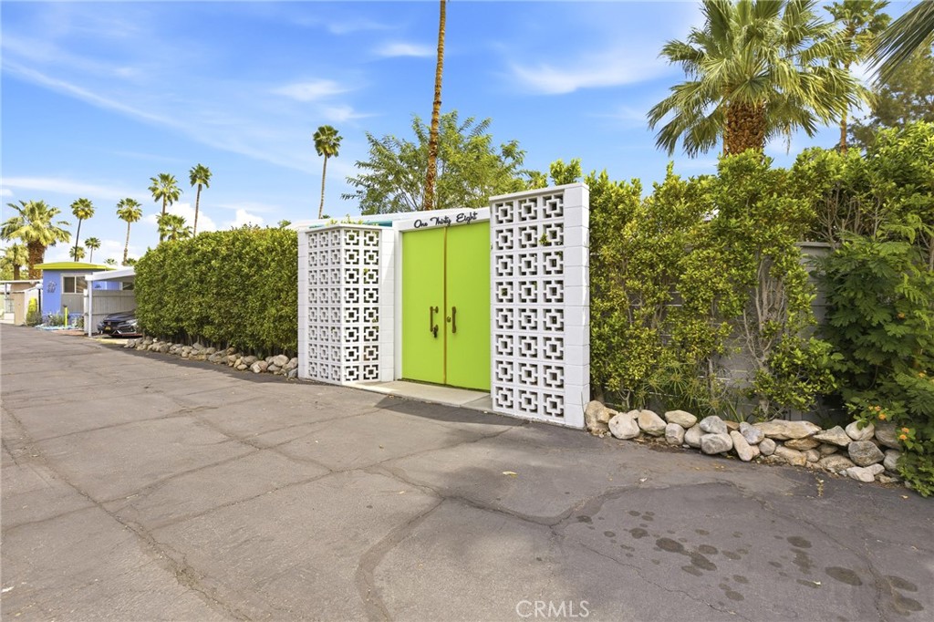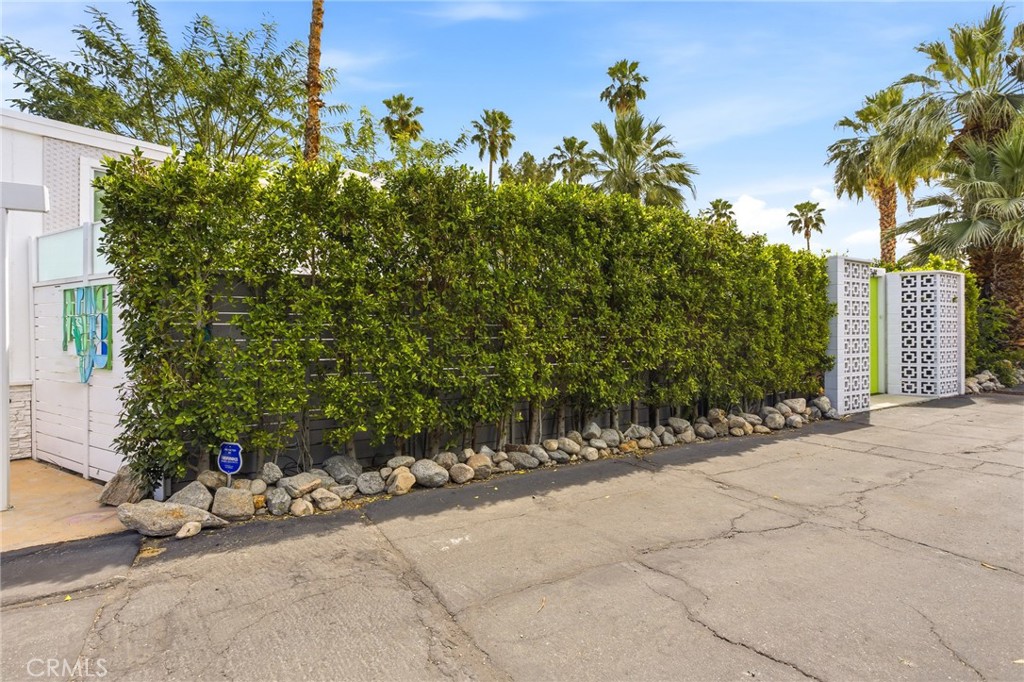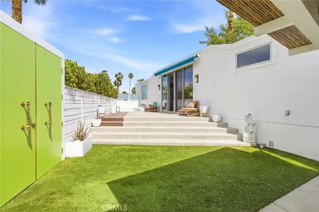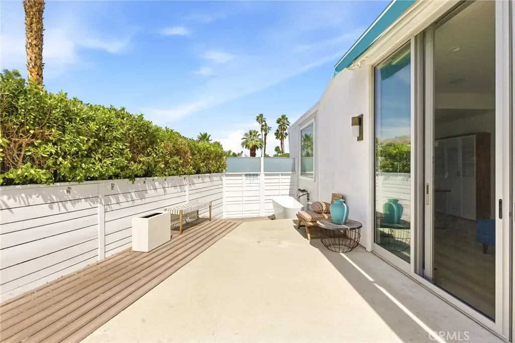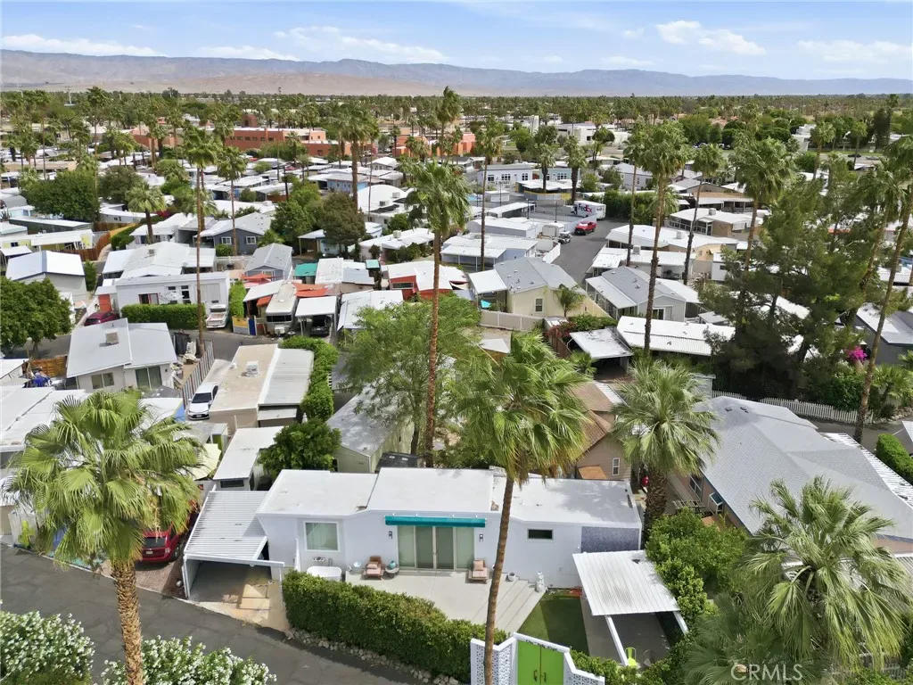 Wake up to sweeping mountain views from this charming DOUBLE-LOT RETREAT in the peaceful Warm Sands community. This thoughtfully designed home offers 690 sq ft of stylish living space with PLUS A DETACHED GUEST ROOM PERFECT FOR VISITORS, A STUDIO, OR PRIVATE WORKSPACE. The property welcomes you with a covered patio, spacious cement and wood deck, and a unique outdoor soaking tub—an inviting setting to relax and take in the desert sky. Inside, the home blends modern style with warmth, featuring hardwood laminate flooring, quartz and wood countertops, crisp white appliances with elegant gold accents, sleek cabinetry and fixtures, and ceiling fans throughout. The custom bathroom showcases beautiful inlaid tile and modern finishes that create a timeless look and feel. Ramon Mobile Home Community 55+ offers a peaceful, quiet setting with nearby grocery stores, restaurants, and cafés for everyday convenience, along with bike-friendly streets, nearby schools, and easy access to parks and green spaces—making this property not just a home, but a lifestyle.
