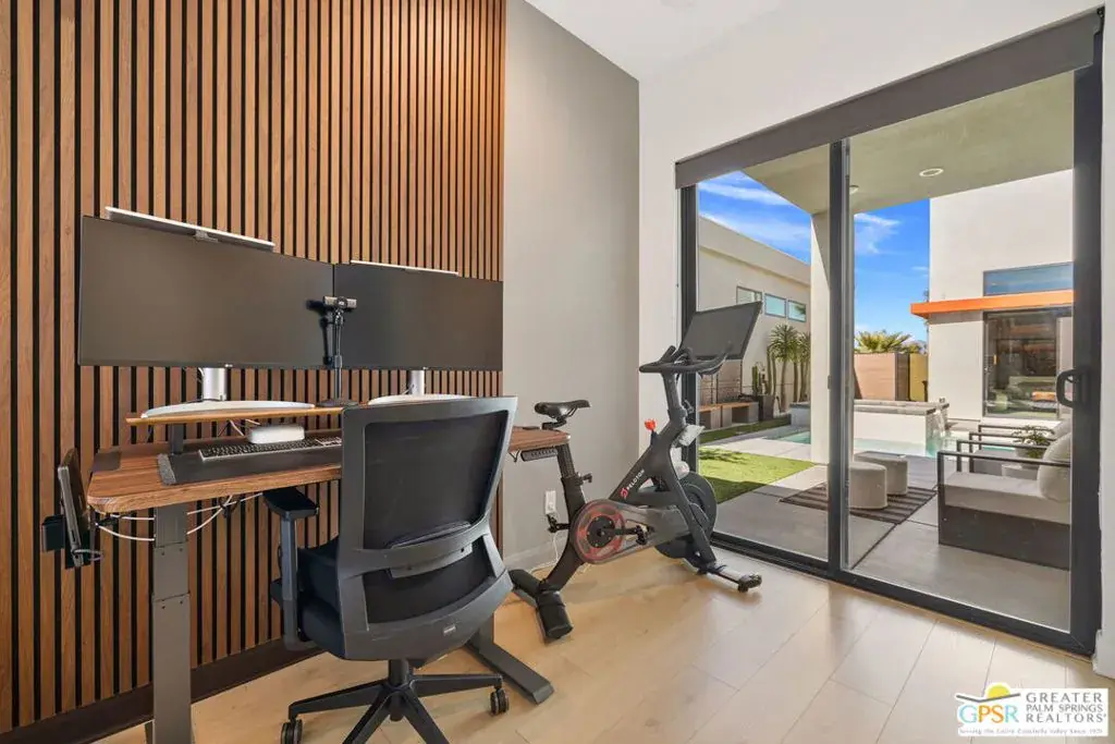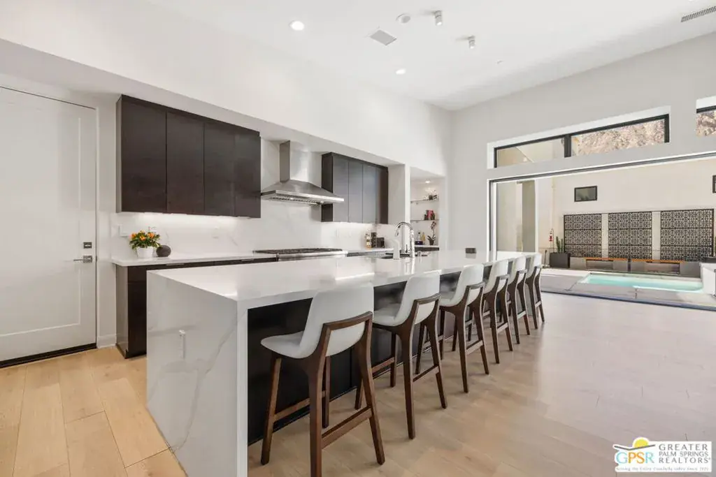 Light, volume, and mountain drama take center stage in this striking modern retreat just moments from downtown Palm Springs. Built for the Palm Springs good life and designed to entertain, thoughtful design and attention to detail shine throughout this highly upgraded 3 bedroom, 3.5 bath home. New construction circa 2022 on fee simple land with owned solar offers approximately 2,280 square feet of single level modern desert architecture. Mountain views steal the show through a dramatic series of clerestory windows, flooding the main living areas with natural light. Eighteen foot vaulted ceilings, a smartly designed floor plan with excellent bedroom separation, and expansive multi slide glass doors create seamless indoor outdoor flow to the patio. The solar heated pool and spa with waterfall set the scene, while a sleek fireplace anchors the living room for cozy desert nights. The chef’s kitchen brings the wow factor with Thermador appliances and an oversized waterfall edge quartz island seating six and made for gathering. The primary suite is a true retreat, framed by glass sliders opening directly to the pool and finished with a striking wood tile accent wall, while the light filled ensuite bath features dual vanities with illuminated mirrors, an oversized shower, and a generous walk in closet. Guest bedroom two is ensuite and enjoys its own private tiled patio with mountain views, and an attached casita with full bath overlooks the pool and offers direct access to the poolside sitting area, perfect for guests, a home office, or weekend visitors. Extras include a powder bath, utility room, direct access two car garage, exterior solar shades, automated window treatments, Alexa controlled dimmer switches, EV charging, a mini split system in the garage, and a side yard and garden with turf underfoot. Elan is a boutique community of modern homes featuring a community pool and spa, dog park, bocce court, and exceptional walkability to downtown Palm Springs dining, shopping, and nightlife. Easy, stylish, and unmistakably Palm Springs.