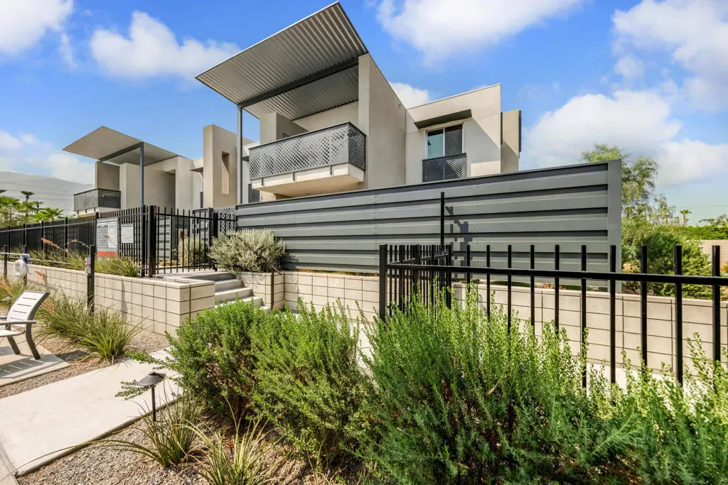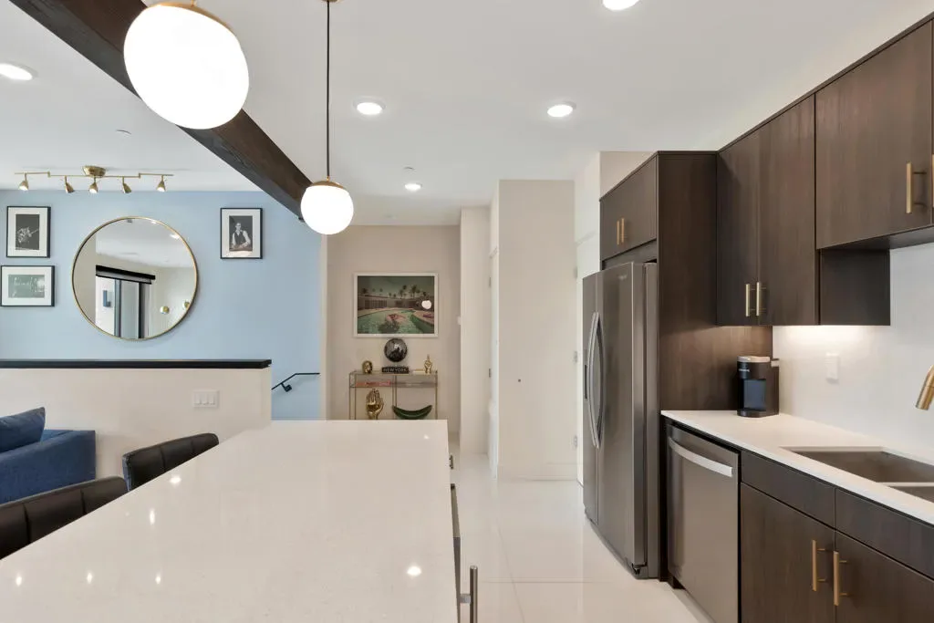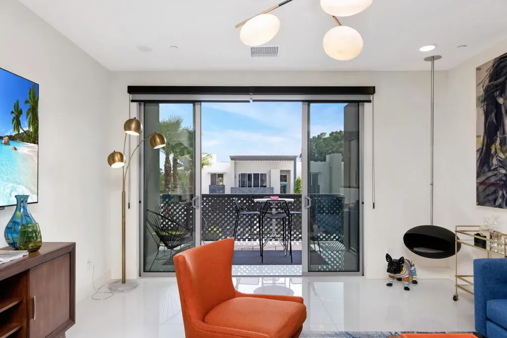 LONG TERM LEASE ONLY. Beautiful 2 bed 2 bath condo right in the center of Palm Springs! One of the best locations within the community, this upper level FULLY FURNISHED poolside condo is filled with custom details, including a cool Jetson style suspended fireplace, a wine fridge, custom gold hardware and tremendous mountain views to the south and west from every room and the balcony! Also includes full solar for super low electric bills. 64@The Riv is a gated community located in the Uptown Design District of Palm Springs, and close to tons of cool restaurants and shops. Some additional features are open concept living area, 9′ ceilings with exposed beam, 8′ tall sliders onto patio, clerestory windows, quartz countertops and backsplash, custom cabinetry, private community dog park, community electric car charging stations, and a 60′ resort stye pool and fireside seating area. Small dog allowed upon approval and with a $500 deposit. Landlord pays gas, electric, water, and cable too!