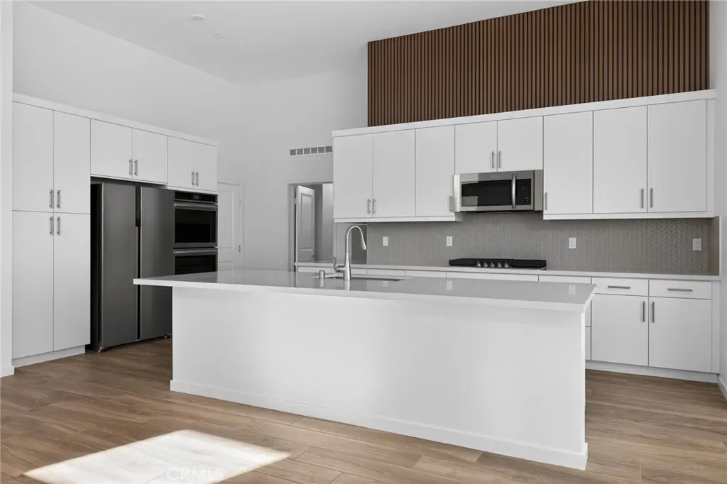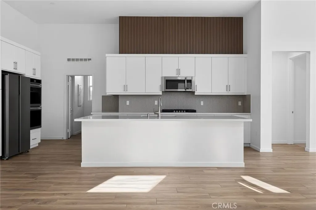 Spacious Layout: Open-concept design featuring a gourmet kitchen with double ovens and a microwave, flowing into expansive living and dining areas.