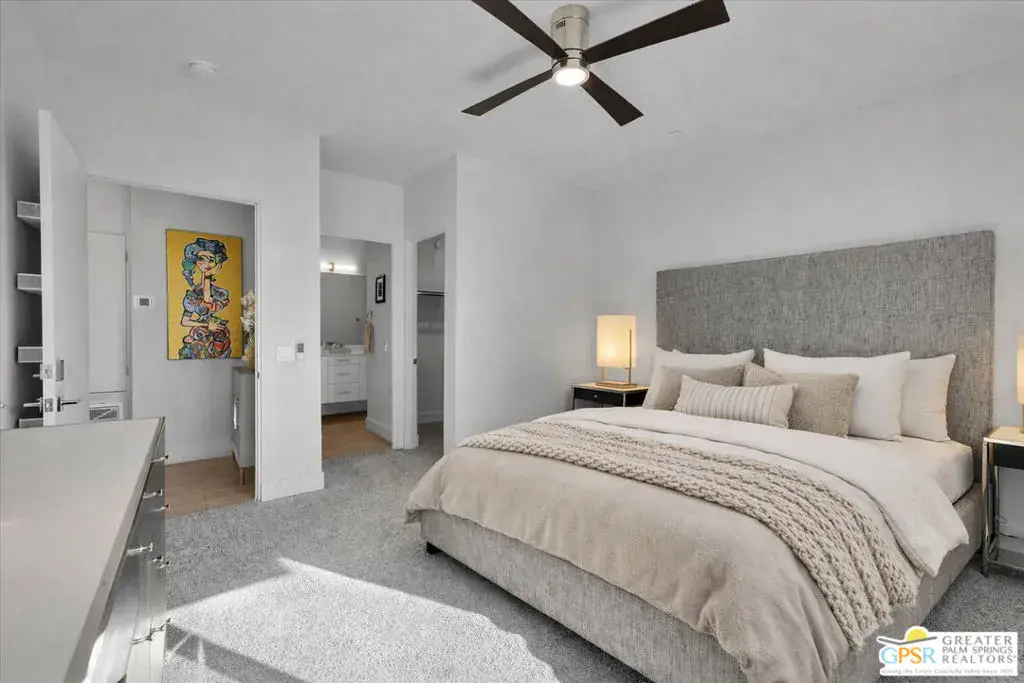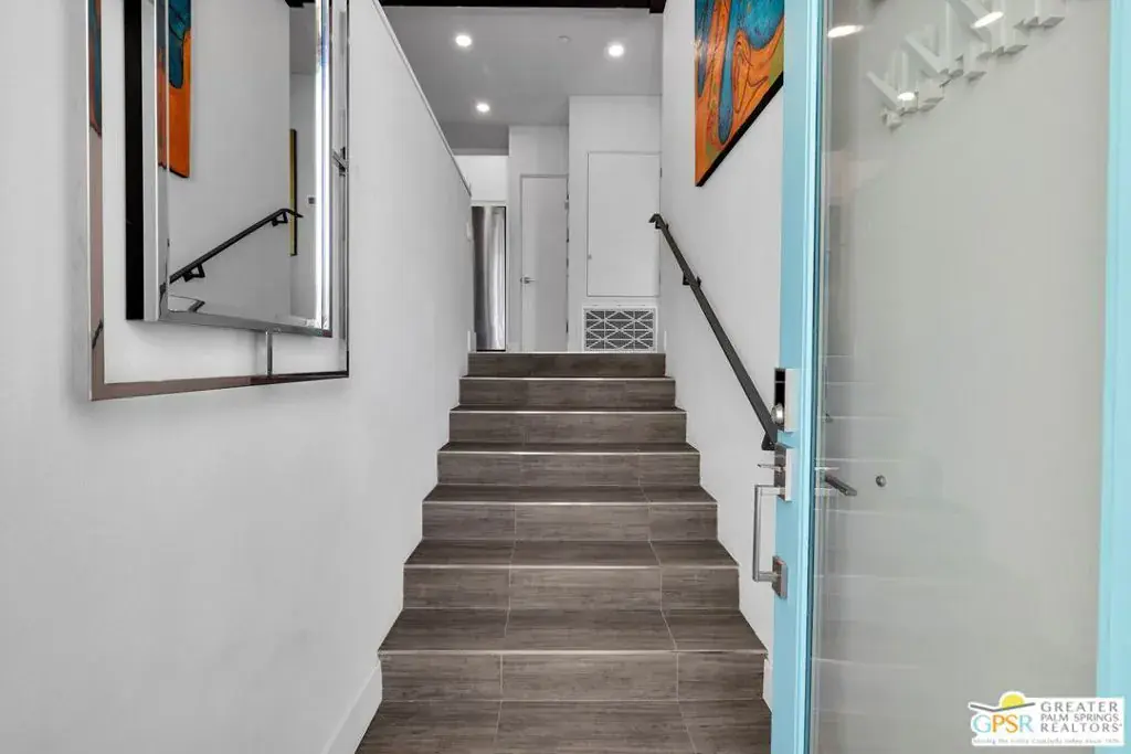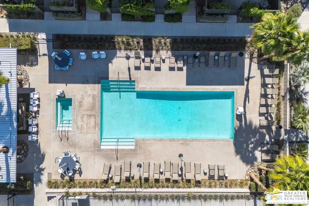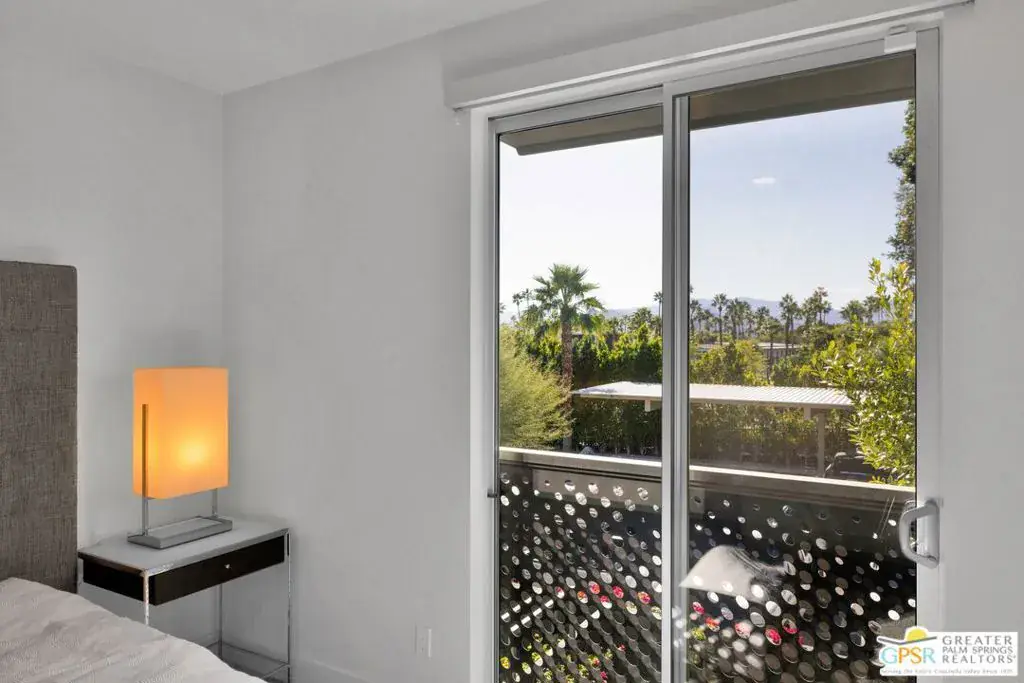Priced to sell and a deal not to pass up, this modern newer-construction condo in the gated 64@TheRiv community is positioned well below market, offering an exceptional opportunity to enjoy the Palm Springs lifestyle just minutes from the Uptown Design District. This south-facing upper-level residence features tree-top and mountain views, an open-concept layout with 9-foot ceilings, exposed beams, and floor-to-ceiling low-E windows. The kitchen is appointed with quartz countertops, stainless steel appliances, and designer lighting, flowing seamlessly into the living and dining areas and out to a private covered balcony ideal for outdoor entertaining. Additional highlights include owned solar (10-panel, 2.9 kW), tankless water heater, and in-unit washer and dryer. Community amenities include a resort-style pool and spa, fire features, BBQ areas, landscaped grounds, and a dog park, along with covered carport parking, guest parking, and EV charging. Smart home features include lighting, motorized shades, thermostat, alarm, locks, and doorbell camera. Fee simple land and low HOA dues make this an amazing opportunity.