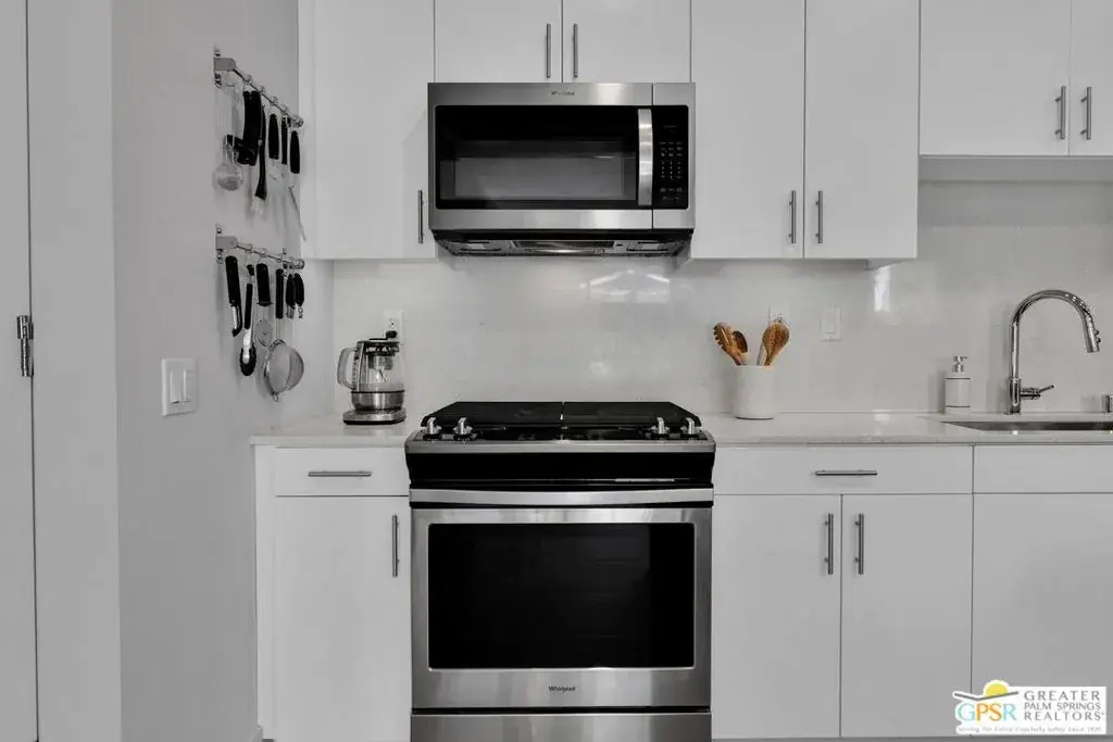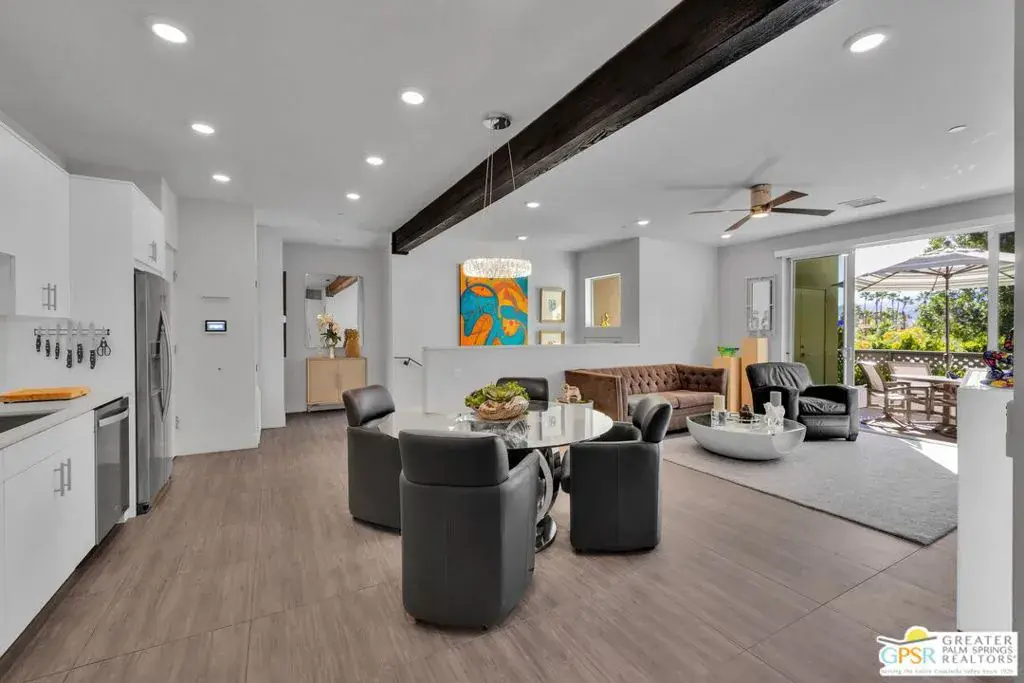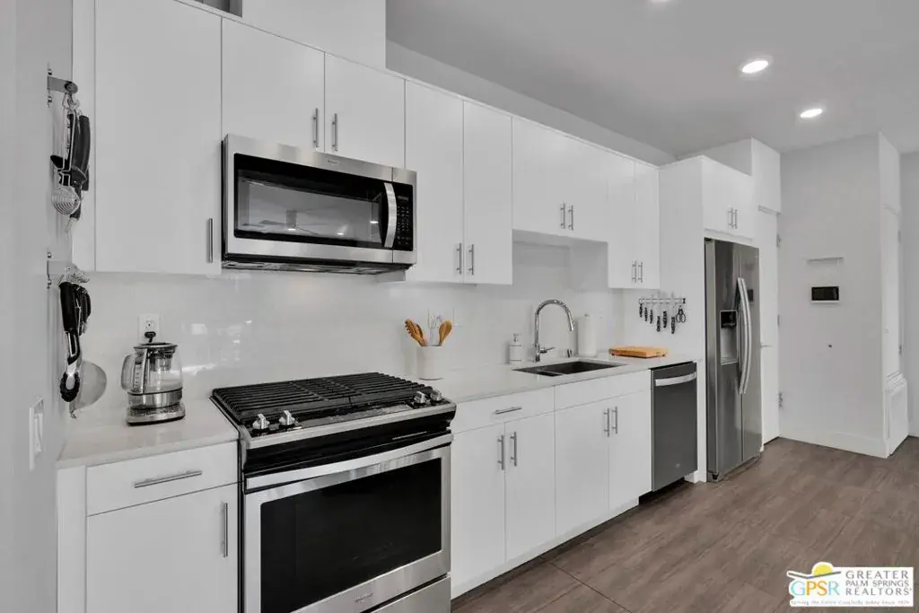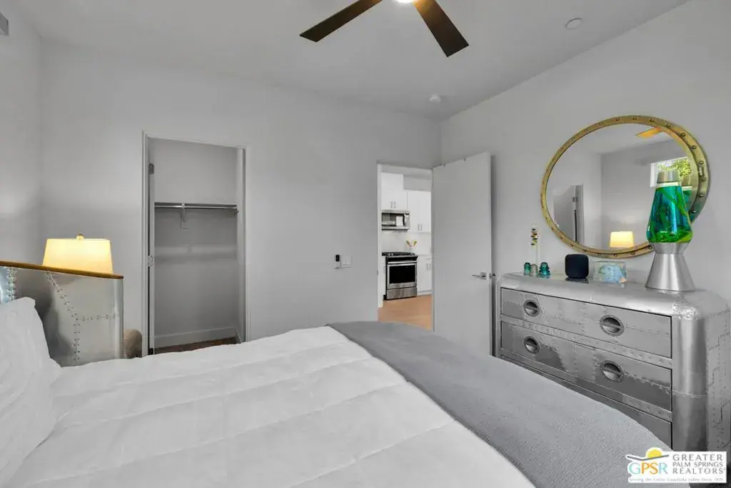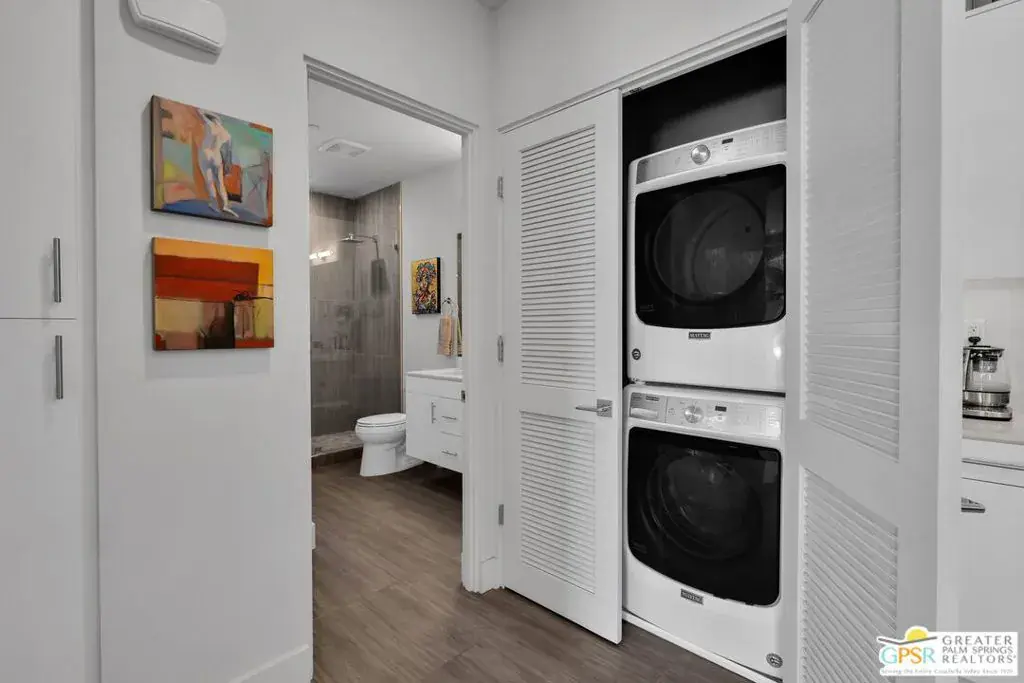Priced to sell and a deal not to pass up, this modern newer-construction condo in the gated 64@TheRiv community is positioned well below market, offering an exceptional opportunity to enjoy the Palm Springs lifestyle just minutes from the Uptown Design District. This south-facing upper-level residence features tree-top and mountain views, an open-concept layout with 9-foot ceilings, exposed beams, and floor-to-ceiling low-E windows. The kitchen is appointed with quartz countertops, stainless steel appliances, and designer lighting, flowing seamlessly into the living and dining areas and out to a private covered balcony ideal for outdoor entertaining. Additional highlights include owned solar (10-panel, 2.9 kW), tankless water heater, and in-unit washer and dryer. Community amenities include a resort-style pool and spa, fire features, BBQ areas, landscaped grounds, and a dog park, along with covered carport parking, guest parking, and EV charging. Smart home features include lighting, motorized shades, thermostat, alarm, locks, and doorbell camera. Fee simple land and low HOA dues make this an amazing opportunity.