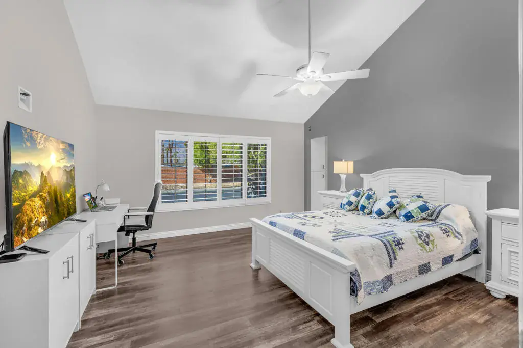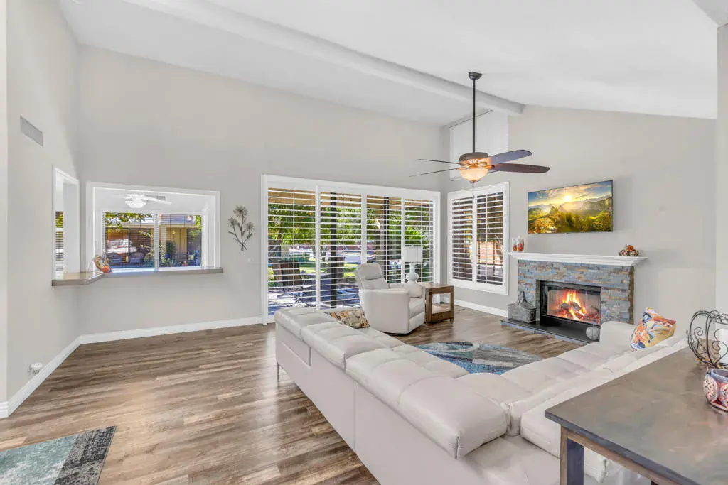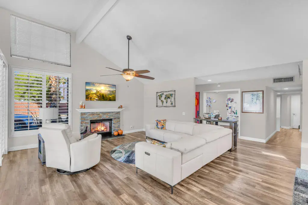Discover this exceptional 3 bedroom, 2-bathroom residence, perfectly situated in the desirable West Gate community of Cathedral Canyon Country Club which features one of the largest floorplans. Quietly located at the back of the community, this well-appointed home offers privacy, convenience, and a desirable resort-style setting. This meticulously maintained home offers a blend of modern upgrades and timeless style, providing a turnkey experience for its next owner. As you step through the front door, you’ll be greeted by soaring ceilings in the living room, which create an open and airy atmosphere. The custom fireplace serves as a stunning focal point, ideal for relaxing evenings. Durable and stylish dyno laminate flooring flows throughout the home, leading you to a fully upgraded kitchen. Here, you will find custom cabinetry with convenient slide-out drawers and a classic farmhouse sink. The home’s thoughtful updates continue into the bathrooms. The primary suite offers vaulted ceilings, a walk-in closet, and a spectacular walk in shower. A guest bedroom with dual skylights connects to an updated bathroom with walk in shower and hallway access. Additional features include a separate laundry room and both bathrooms are equipped with modern bidet toilets for added comfort. Additional recent improvements include a new HVAC system for year-round comfort, an epoxy-finished garage floor, and new double sliding screens that invite in the desert breeze. The garage is exceptionally functional, featuring abundant built-in storage cabinetry along with a spacious ”attic” area for even more storage options. There is nothing left to do but move in and enjoy the wonderful lifestyle this home and community offer. Don’t miss the opportunity to make this beautiful property your own. Contact us today to schedule a private viewing and explore all that this Palm Springs gem has to offer. HOA includes landscaping, exterior maintenance, controlled access, and cable TV/internet. Ideal for full-time living, seasonal use, weekend golfers or an easy lock-and-leave lifestyle.