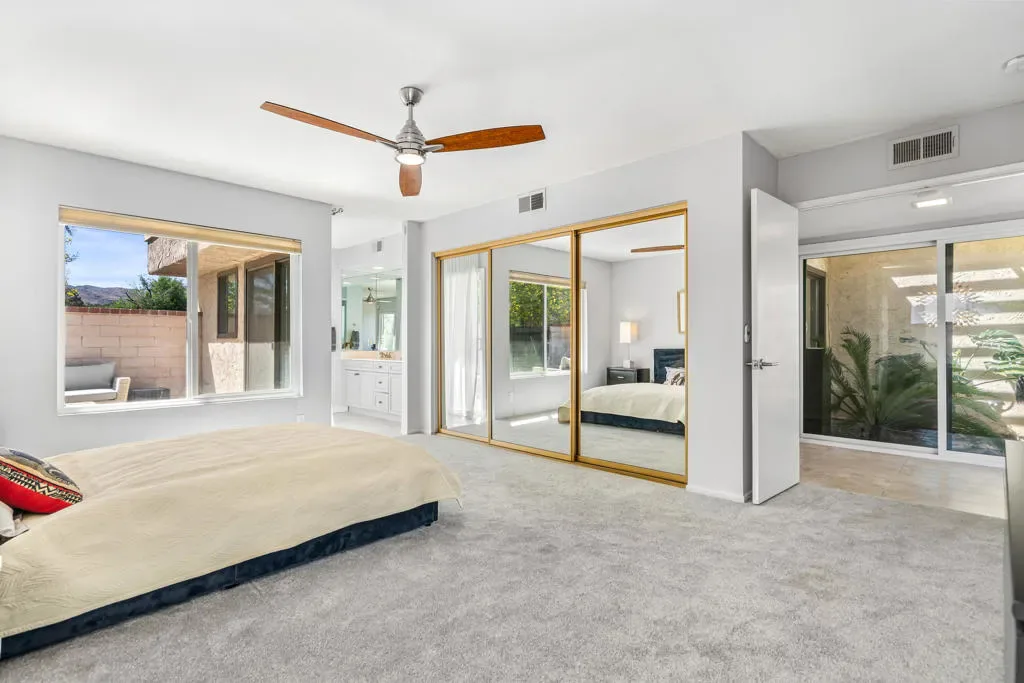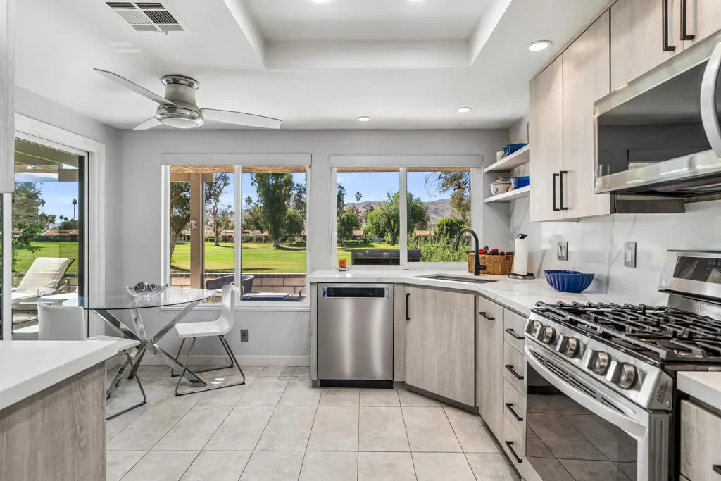 Beautifully Remodeled End-Unit Condo with Golf Course & Mountain ViewsLocated in the desirable Palm Springs / West Gate section of Cathedral Canyon Country Club, this beautifully remodeled end-unit condo offers style, privacy, and exceptional indoor-outdoor living.This 3 Bedroom and 2 Bath condo has been remodeled in contemporary finishes. (note: tax records show 2 bedrooms, this unit has 3 bedrooms, per seller) The spacious living room features a cozy fireplace and sliding glass doors that open to a serene patio with panoramic views. It flows seamlessly into the open dining area, with both spaces enhanced by vaulted ceilings that create a bright, airy feel.The upgraded kitchen is a standout, showcasing stainless steel appliances, abundant natural light, and a charming breakfast area surrounded by glass, with direct access to the rear patio–perfect for morning coffee or casual dining.An interior atrium adds architectural interest and brings natural light into the heart of the home, creating a unique indoor-outdoor ambiance.Outside, enjoy a spacious walled front courtyard and a private side yard with a tiled patio. The seller has expanded the rear patio (with HOA approval) and added an Alumawood cover, creating an ideal setting to relax and take in the stunning golf course and mountain views.Additional upgrades include:Newer windows and sliding glass doorsBeautifully updated bathrooms with modern showersThis home combines thoughtful upgrades, prime location, and effortless desert living–ideal as a full-time residence or seasonal retreat.