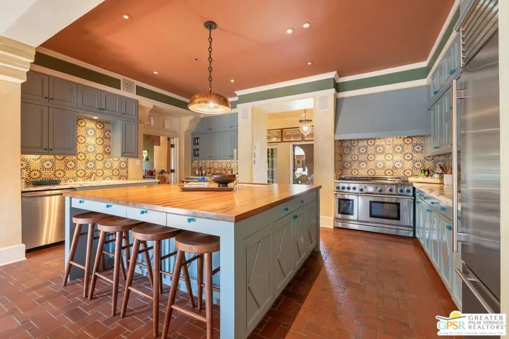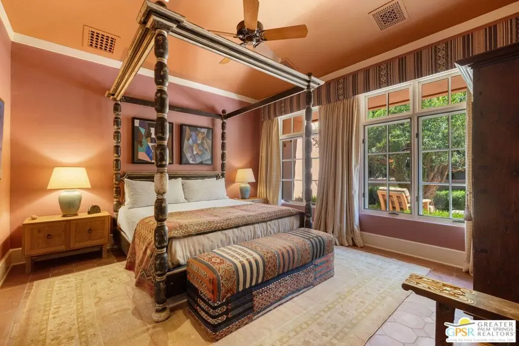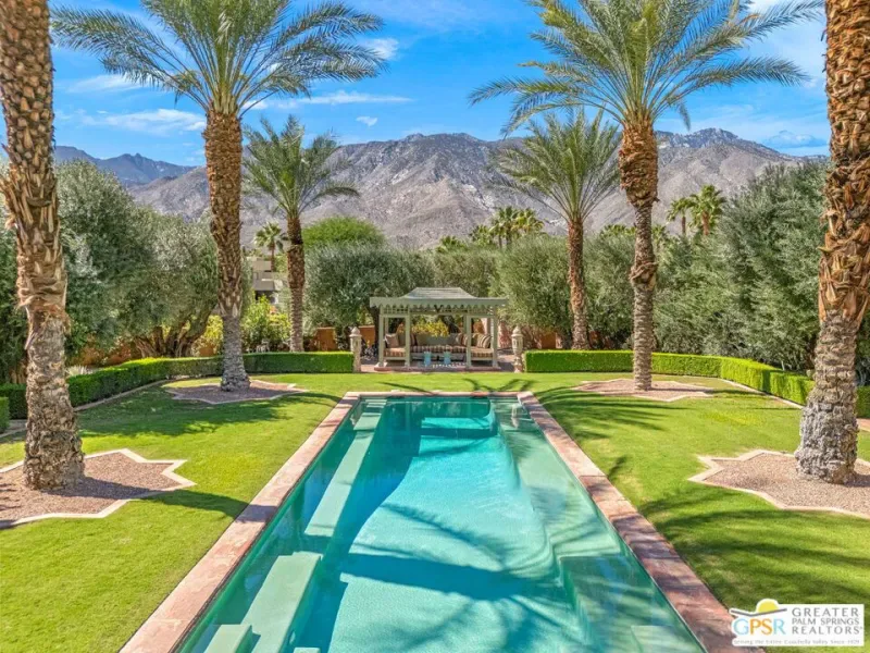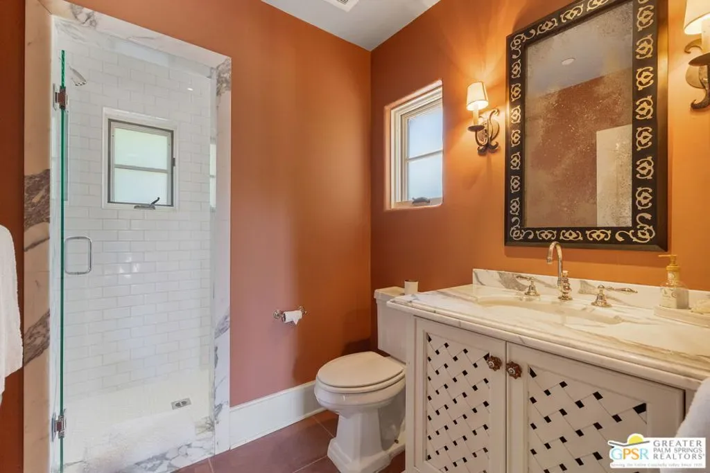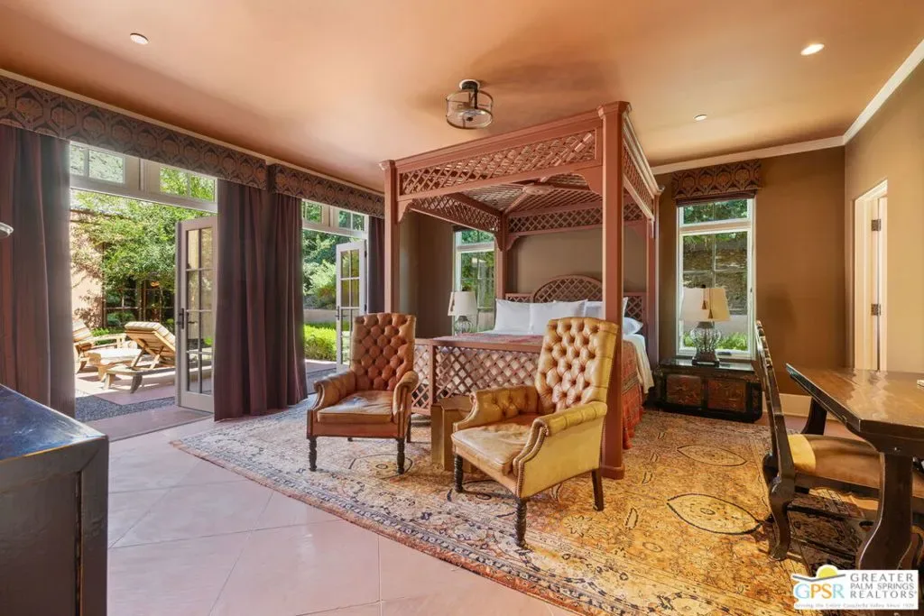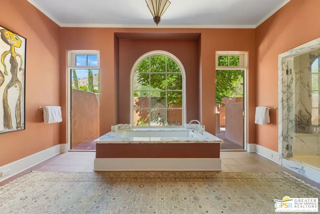 A cinematic interplay of architecture, landscape, and light defines this South Palm Springs estate that reimagines modern desert luxury. Nestled in the exclusive Andreas Hills enclave, the residence offers a rare harmony of artistry, comfort, and absolute privacy. Originally envisioned by the acclaimed firm Tichenor & Thorp, this Moorish-inspired masterpiece has been thoughtfully reimagined for contemporary living. Spanning nearly one third of an acre, the estate features 5 bedrooms, 5.5 baths, and over 4,800 square feet of refined living space including a private guest house and exceptional bedroom separation for privacy and flow. Every detail reflects the designers’ celebrated eye for form, proportion, and garden composition. Grand scale meets serene restraint with high ceilings, tall Venetian plaster walls, and graceful arched passageways that frame curated views of courtyards and lush gardens. Carrara marble surfaces, broad skylights, and French doors bring balance and light, while the formal living room’s commanding fireplace provides a striking architectural centerpiece. The chef’s kitchen is both functional and inviting, blending custom cabinetry, an oversized marble island, and generous workspace that opens seamlessly to the family room. Designed for connection, it accommodates everything from morning coffee to large scale entertaining with effortless sophistication. Outdoors, the home’s series of covered and open air patios dissolve boundaries between structure and nature. A fireplace warmed loggia, alfresco dining area, and intimate garden vignettes encourage lingering under the desert sky. Mature 100 year old olive trees, towering date palms, and lush layered plantings form a tranquil backdrop to the dramatic pool and secluded spa, enhanced by outdoor showers and complete privacy. With owned solar, a gated motor court, and every modern refinement, this Andreas Hills estate is both a timeless architectural statement and a deeply livable sanctuary, a rare composition of light, texture, and soul.