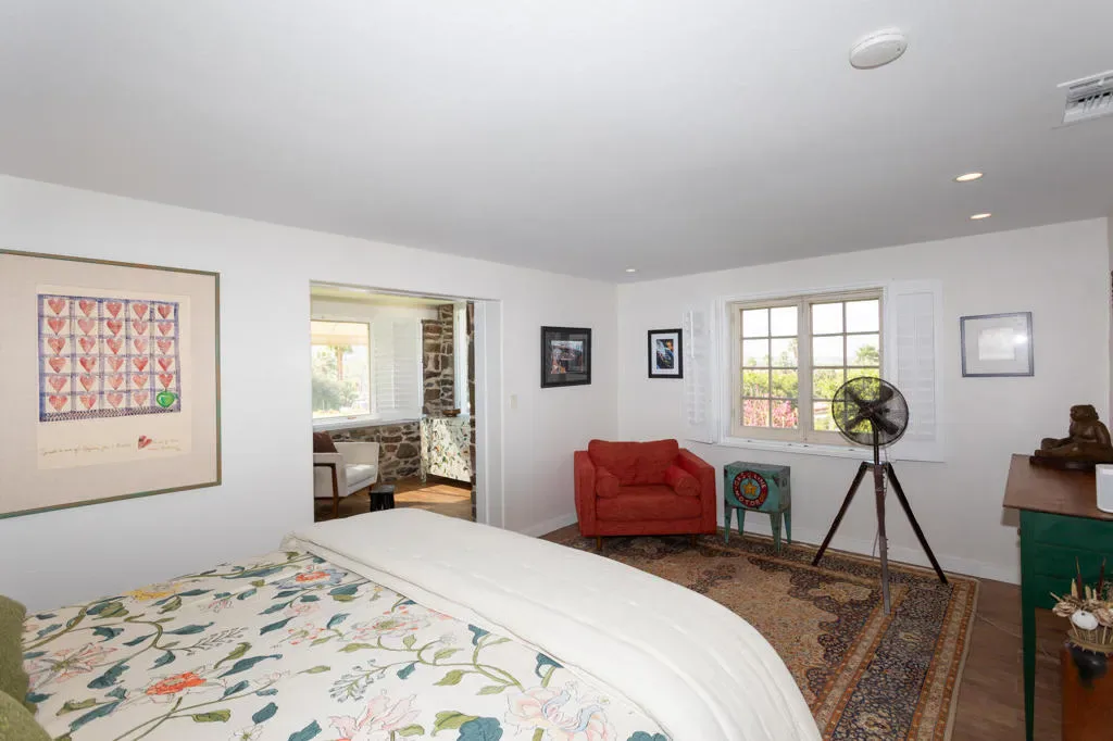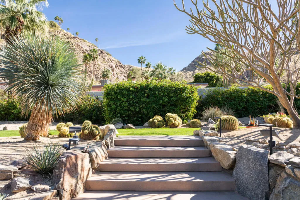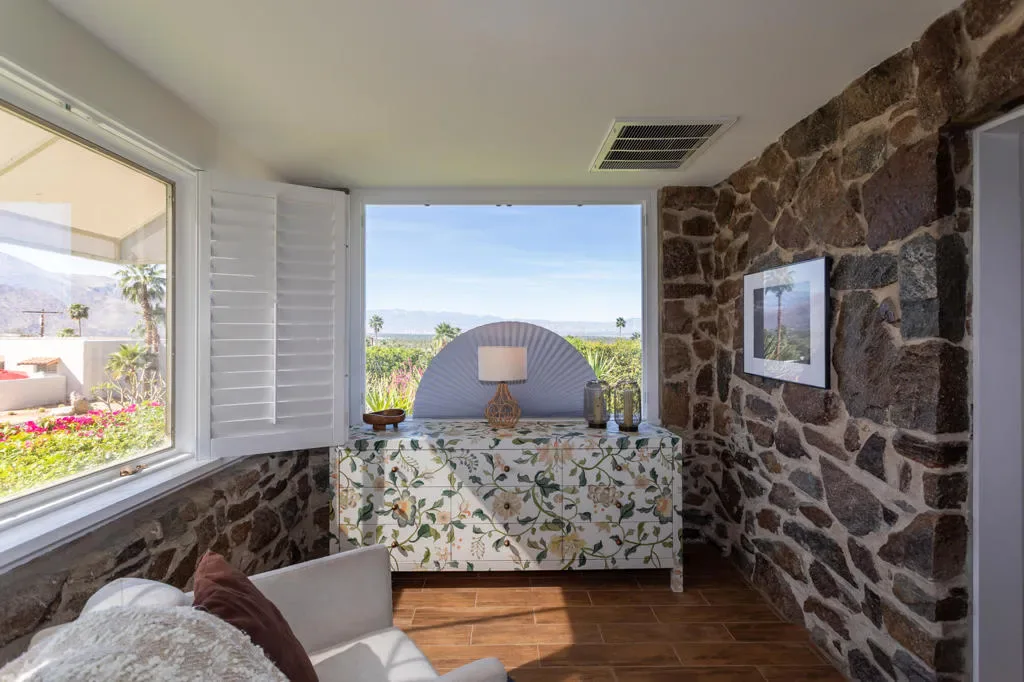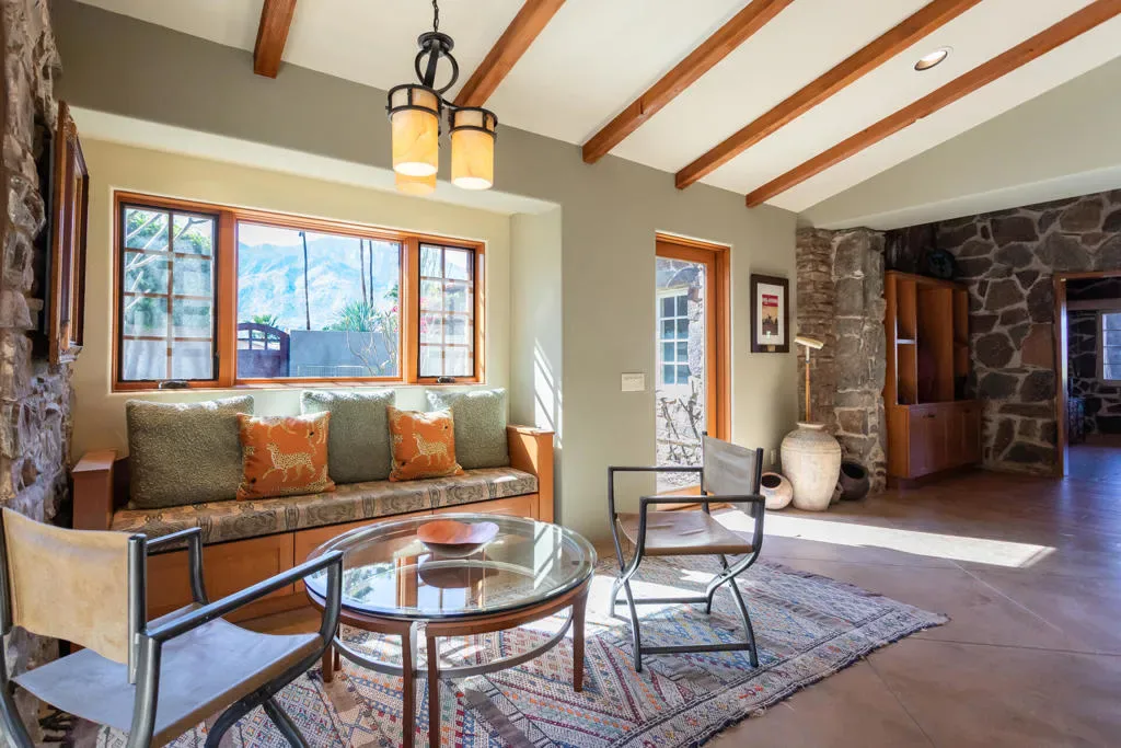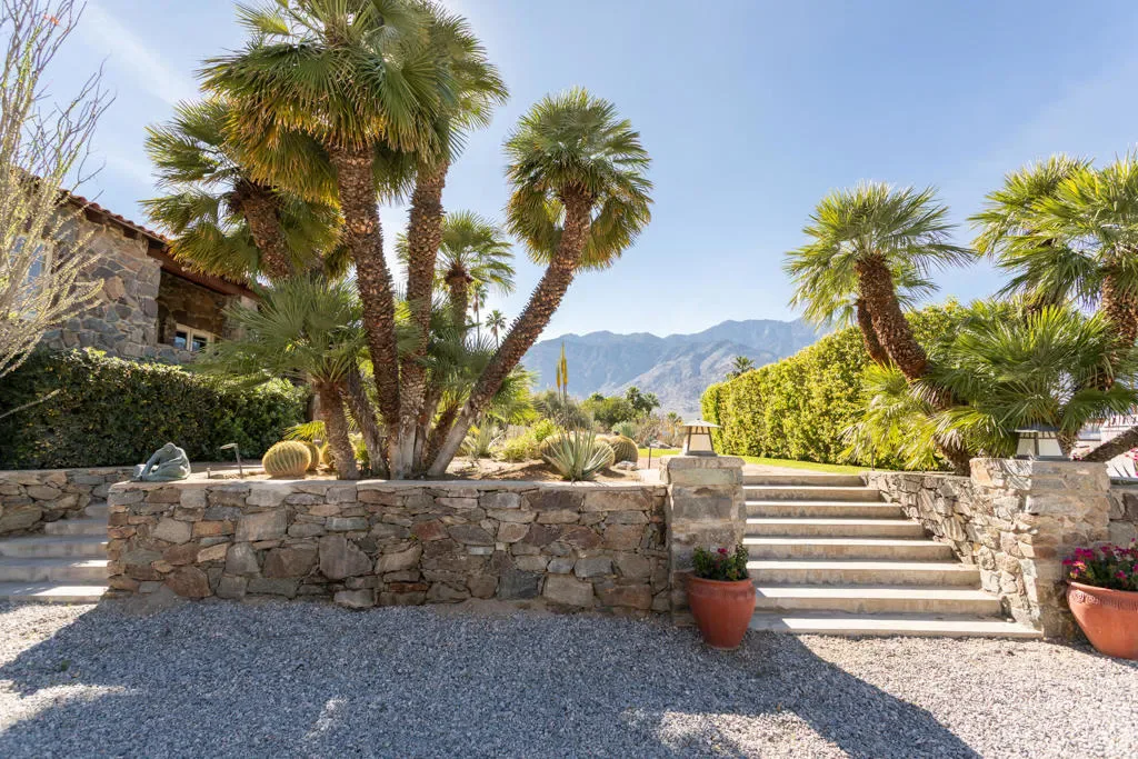 If you are looking to own a piece of history without sacrificing modern amenities look now further. This iconic desert retreat has a class one historical designation. Know as the Giannini residence, the original owners and founders of Bank of America made this their desert retreat nestled higher up in Araby Cove. Araby cove is one of the first and oldest subdivisions in South Palm Springs. The home was constructed with board formed , poured in place concrete and finely cut locally quarried stone over the concrete walls which is reminiscent of the craftsmanship from the 1880s-1930s era. The property also features a basement and bank type vault which could be a nice wine cellar. The basement stays at a cool temperature naturally through the year and has added AC in case you would like it even cooler. A large Albert Frey deck serves as a star and view gazing platform as well as a shade for the cars underneath. This could be a huge party space as well! Enter up a grand stair way to a stone porch! The porch is naturally cool being surrounded by rock and the orientation from the sun. The views from the front of the home are incredible and expansive. Enter the home thru old French doors and you are greeted with a huge original rock fireplace. The living room flows nicely into an office nook, then into a gourmet kitchen, butler pantry and coffee bar and breakfast nook. This all opens up to the lovely outdoor space surrounded by patios, a kidney shaped pool, spa and top of the line desert scape. There are outstanding views from each of the homes outside and inside viewing areas. Back inside the home we will find a large formal dining room to accompany your chefs kitchen. There is one guest bedroom and a den serviced by a jack and jill bath. The second bath on that side also able to serve the entertaining and dining areas. The other side of the home offers the primary suite with a large bath and sitting area. Also on that side is the second guest bedroom. This home has changed hands less than a handful of time in a 100 years. This is a a once in a lifetime opportunity to own a piece of history. The current owner has installed a very expensive and extensive HVAC system, added a whole house water softening system ,added new insulation, updated appliances, serviced the septic system , updated wiring and so much more. The home is ready for your upmost enjoyment and trouble free living!