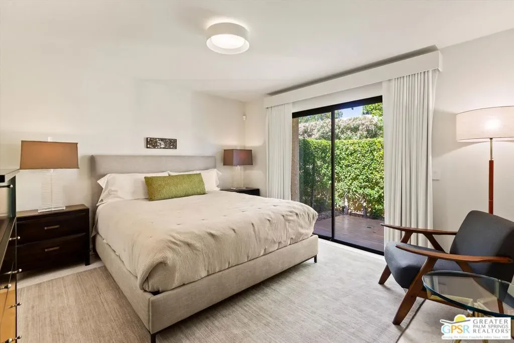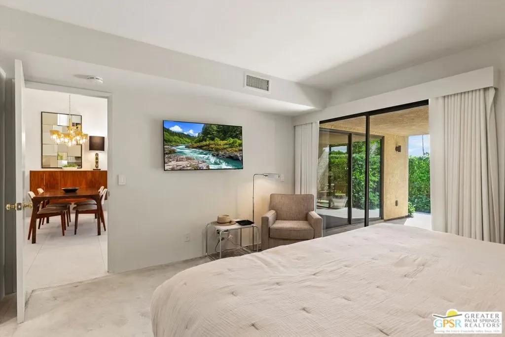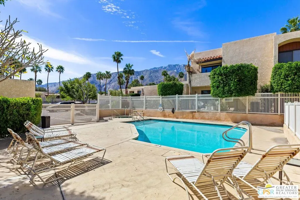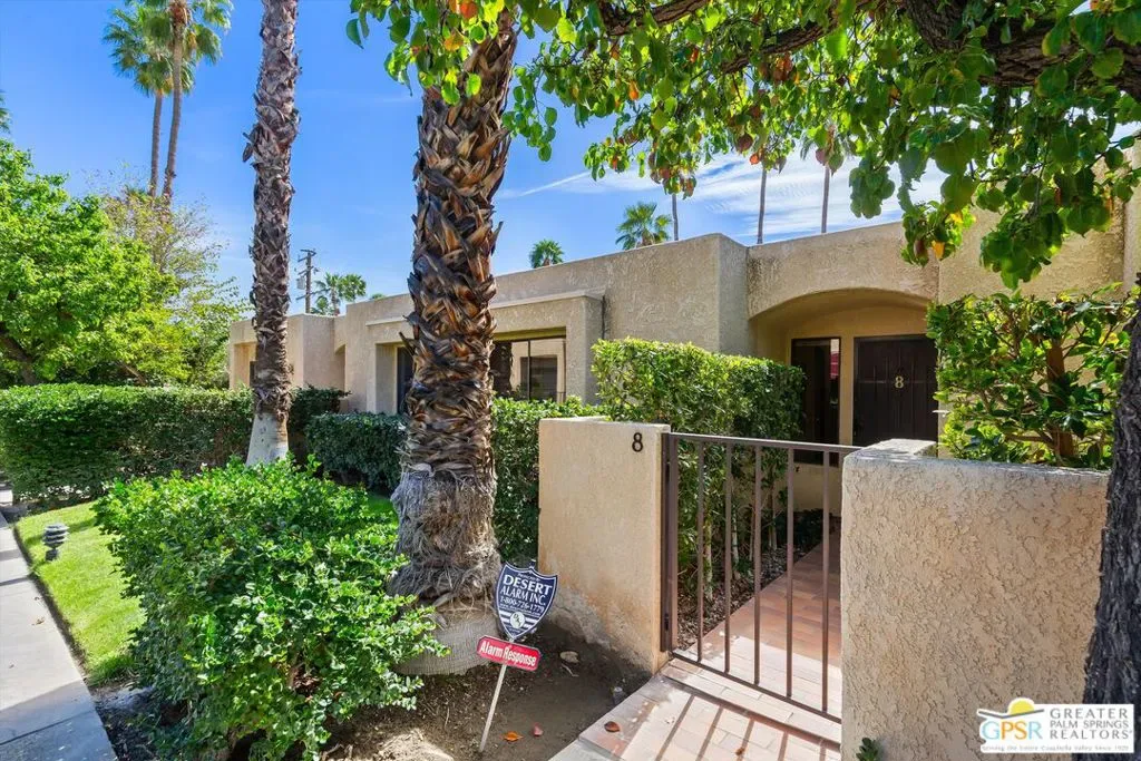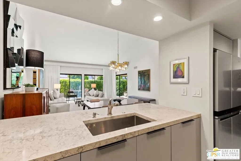 Welcome to this spacious single-level condo located in the desirable Camino Del Sol community. Offering 1,537 square feet of living space, this sophisticated, well-designed home features three bedrooms and two bathrooms with an open, light-filled layout perfect for relaxed desert living. Sleek and contemporary, the generous living area flows seamlessly to multiple patios- hedged for privacy, creating wonderful indoor-outdoor living spaces ideal for entertaining, enjoying quiet desert mornings or sunset cocktails. The open-concept kitchen with bar seating, stainless appliances and efficient design is perfect for entertaining. The primary and guest suite also include patio access, adding to the home’s sense of solitude and comfort. The third bedroom is currently configured as a sleek den space with adjacent office for functional living. The thoughtful floor plan provides both space and flexibility for hosting guests or creating your own peaceful retreat. Practical features add to the home’s everyday livability, including in-unit laundry and garage parking, giving the condo a more functional home feel while maintaining the ease of condo living. Additional features include stylish cabinetry and quartz counters, tile flooring throughout, custom drapes, smooth vaulted ceilings, motorized patio covering, and a new water heater. Located on fee simple land (you own the land), Camino Del Sol offers beautifully maintained grounds with resort-style amenities including two pools, spas, and tennis courts, with low HOAs including cable, water and trash. The community is ideally situated just minutes from the vibrant Uptown Design District with an abundance of shopping and dining. Whether you’re looking for a full-time residence, seasonal retreat, or investment opportunity, this home offers comfort, space, and an ideal Palm Springs lifestyle.