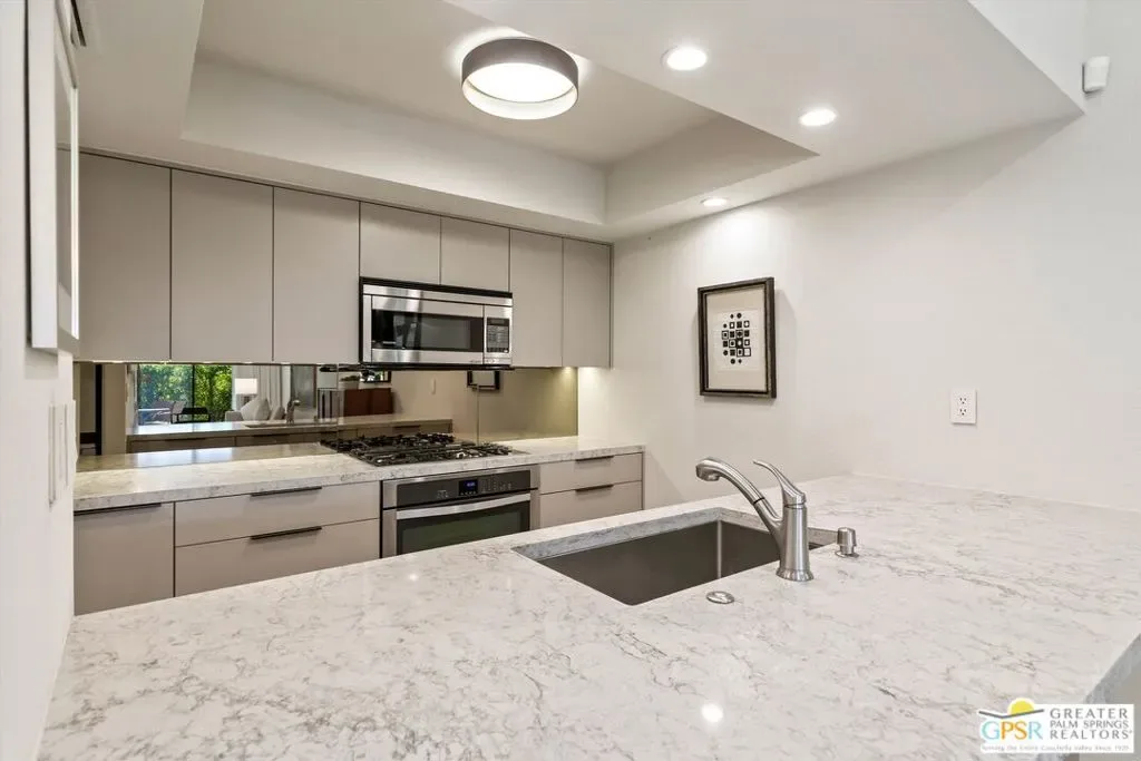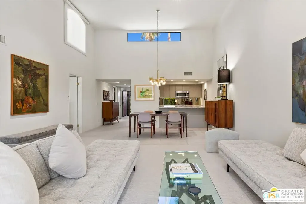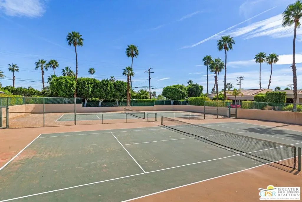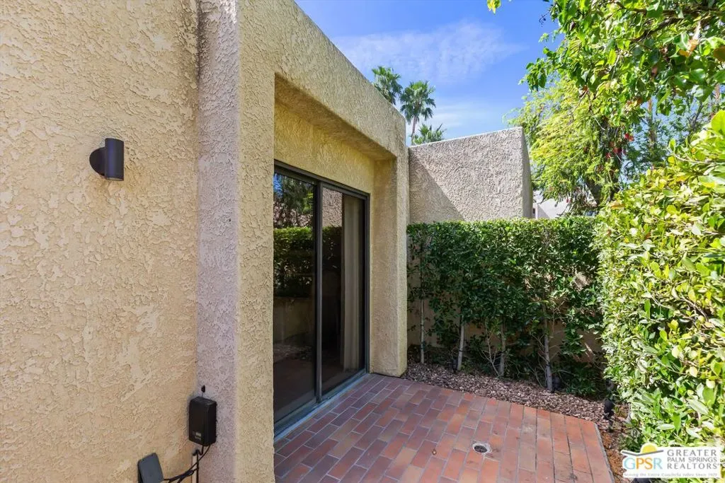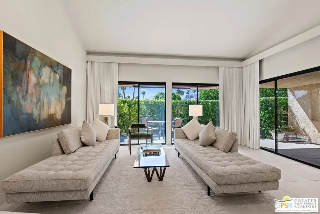 Welcome to this spacious single-level condo located in the desirable Camino Del Sol community. Offering 1,537 square feet of living space, this sophisticated, well-designed home features three bedrooms and two bathrooms with an open, light-filled layout perfect for relaxed desert living. Sleek and contemporary, the generous living area flows seamlessly to multiple patios- hedged for privacy, creating wonderful indoor-outdoor living spaces ideal for entertaining, enjoying quiet desert mornings or sunset cocktails. The open-concept kitchen with bar seating, stainless appliances and efficient design is perfect for entertaining. The primary and guest suite also include patio access, adding to the home’s sense of solitude and comfort. The third bedroom is currently configured as a sleek den space with adjacent office for functional living. The thoughtful floor plan provides both space and flexibility for hosting guests or creating your own peaceful retreat. Practical features add to the home’s everyday livability, including in-unit laundry and garage parking, giving the condo a more functional home feel while maintaining the ease of condo living. Additional features include stylish cabinetry and quartz counters, tile flooring throughout, custom drapes, smooth vaulted ceilings, motorized patio covering, and a new water heater. Located on fee simple land (you own the land), Camino Del Sol offers beautifully maintained grounds with resort-style amenities including two pools, spas, and tennis courts, with low HOAs including cable, water and trash. The community is ideally situated just minutes from the vibrant Uptown Design District with an abundance of shopping and dining. Whether you’re looking for a full-time residence, seasonal retreat, or investment opportunity, this home offers comfort, space, and an ideal Palm Springs lifestyle.