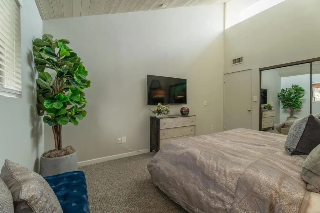 Turnkey move-in ready with excellent income potential! This beautifully remodeled top-floor condo boasts a strong Airbnb track record, commanding up to $4,400 per month in season. Located in the gated Canyon Granada community in the desirable South Palm Springs area, this light-filled 2-bed, 2-bath home offers single-level living with vaulted wood ceilings, clerestory windows, and an open layout that opens to a newly updated private deck overlooking the pool and mountains. Enjoy stunning mountain views from the living room, plus a front entry deck off the dining area with picturesque mesa views.The thoughtfully designed layout places the guest bedroom on the opposite side from the master suite for added privacy, and both bedrooms feature en-suite baths. The master suite includes a walk-in closet and in-unit laundry. The updated kitchen showcases stone countertops, stainless steel appliances, white Shaker cabinetry, and a designer tile backsplash.Surrounded by lush citrus trees, mature landscaping, and mountain views, the community offers pools, spas, tennis courts, and covered parking with storage. Ideally located close to hiking trails, Smoke Tree Village shopping, and dining. Fee simple land with no land lease; HOA dues include water, trash, exterior building maintenance, and grounds.