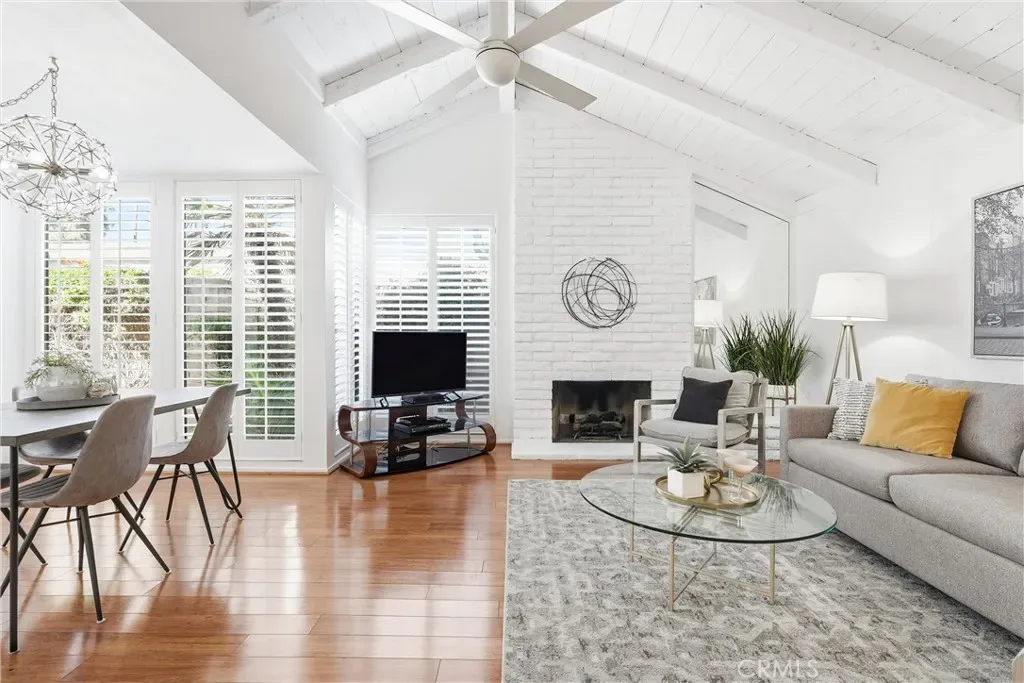 This beautifully updated single-story home is bright and inviting, featuring expansive floor-to-ceiling windows that fill the living space with natural light. Vaulted wood-beamed ceilings and a cozy fireplace add character and warmth to the open living and dining areas—perfect for relaxing or entertaining.