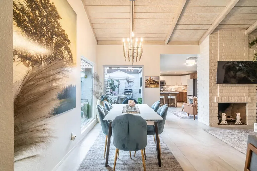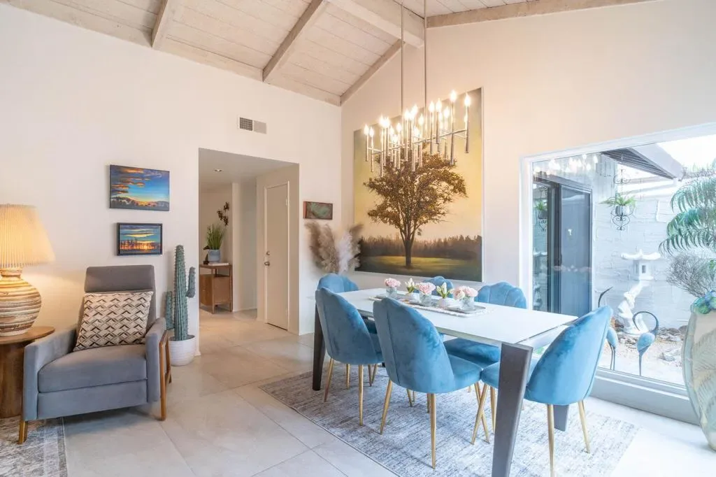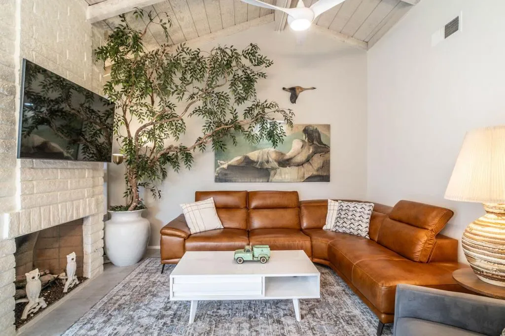 A stunning redesigned 2 bedroom, 2 bath condo showcases high-quality custom finishes throughout. Enjoy the feel of a single-family home with no shared walls. Located in the highly desirable Canyon Sands community in south Palm Springs. The open, light filled kitchen is perfect for entertaining, while the tastefully renovated bathrooms elevate the home’s modern appeal. New kitchen appliances, ceiling fans, water heater. Mountain view from the bedroom. Thoughtful upgrades include expansive large-format tile flooring, new windows and sliders. The living space seamlessly extends to a private, newly landscaped patio, creating an effortless indoor-outdoor lifestyle. The spacious living room showcases vaulted ceilings with exposed beams and a cozy fireplace. Features a pristine, attached two-car garage featuring epoxy flooring and ample storage. Residents enjoy beautiful landscaping and resort-style amenities including 7 salt water pools and spas, 5 tennis courts, and 3 pickleball courts with on-site management. Mature desert landscape, variety of trees: grapefruit, lemon, orange, and tangerine. Canyon Sands offers an on-site HOA known for its excellent management. HOA dues are $665/month (including water, trash, cable, roof, and WIFI). Land lease $134/month through 2061. Owners are permitted to rent their units for a minimum of 29 days.