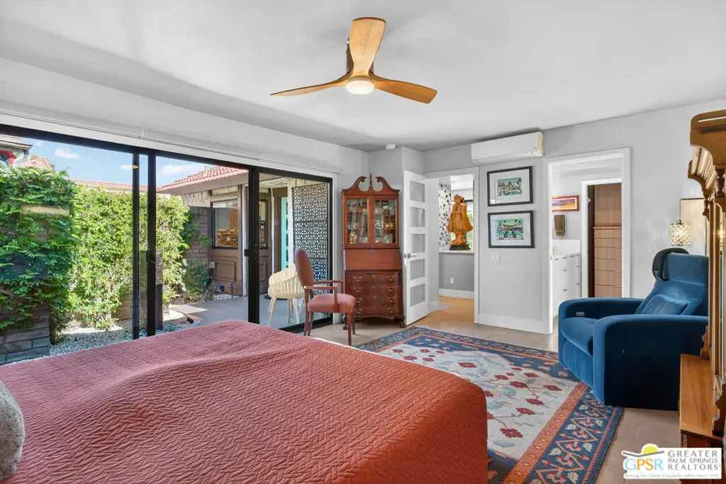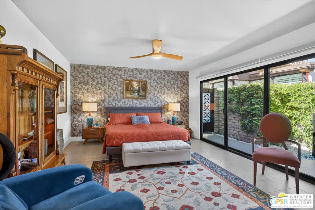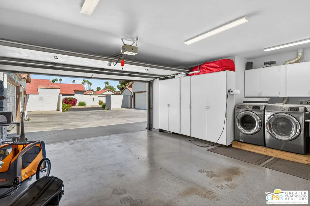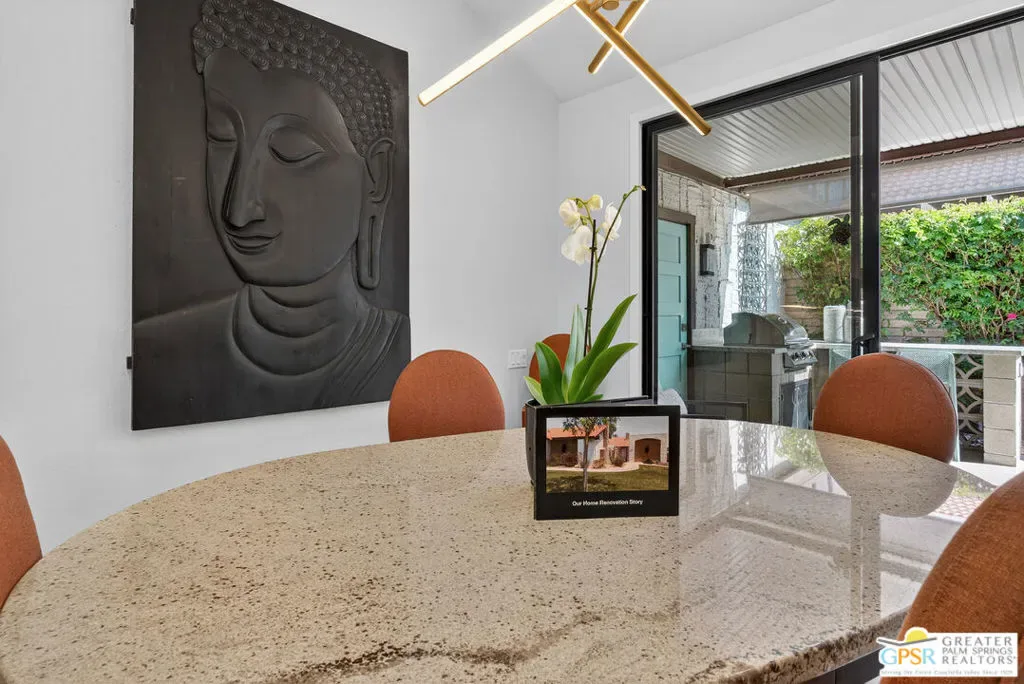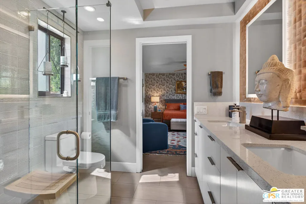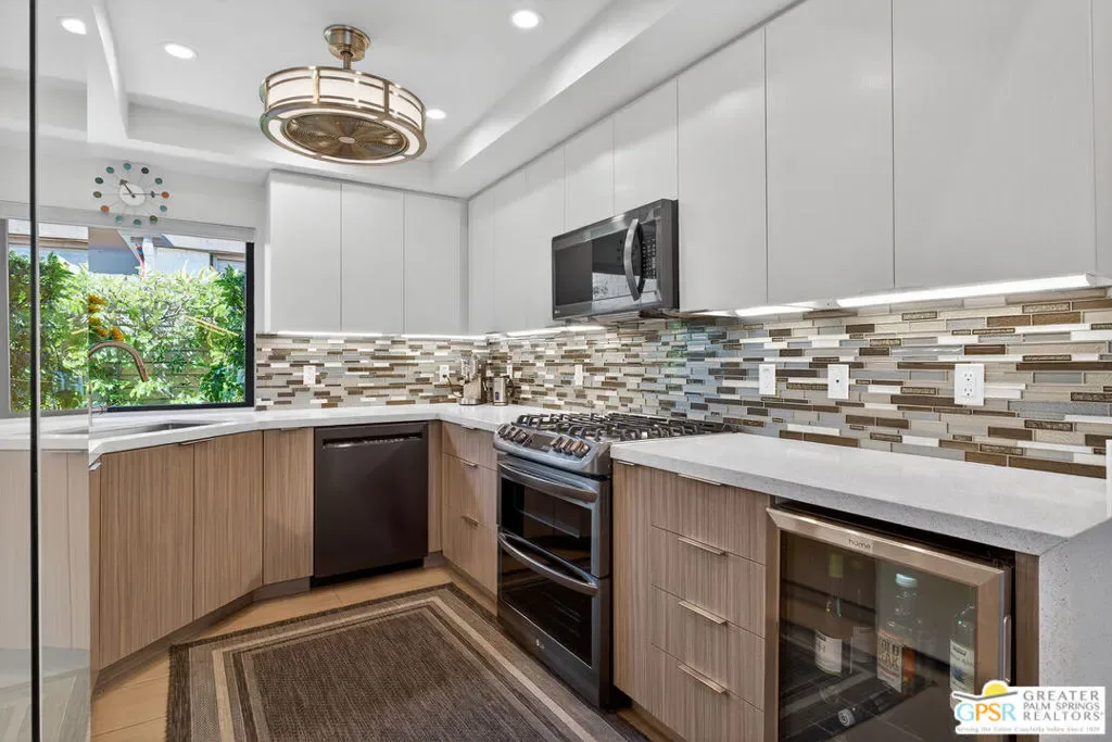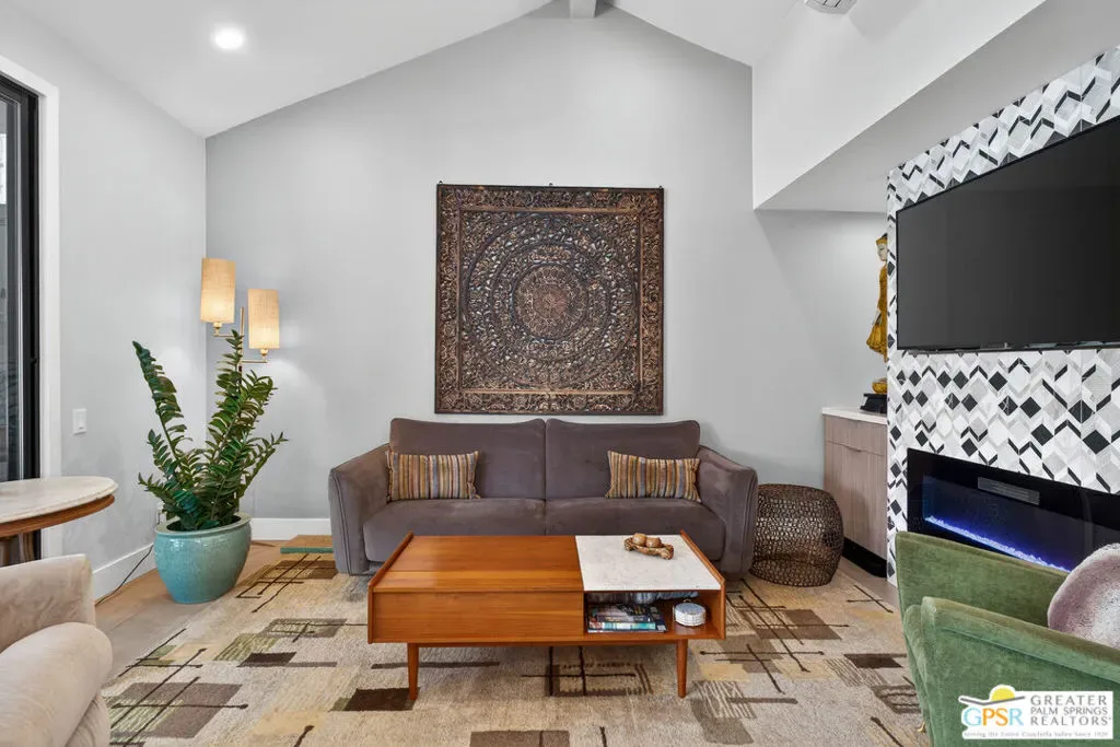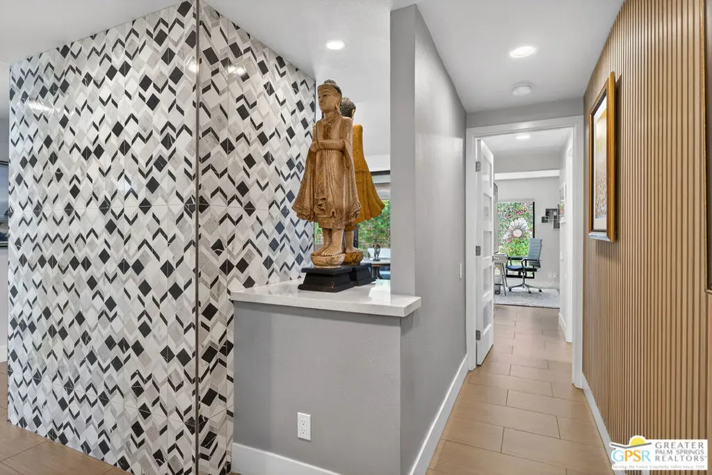 Located in desirable South Palm Springs, this extensively renovated single-level residence with an attached two-car garage offers a rare combination of thoughtful architectural redesign, modern systems upgrades, and high-quality custom finishes. Unlike many homes, this residence features no shared living-area walls, providing added privacy and comfort. Originally reimagined in 2020, the renovation went far beyond cosmetic updates. The interior was architecturally reconfigured to improve flow and functionality, including raising the hallway ceiling approximately six inches after duct removal, eliminating the original HVAC closet, expanding the secondary bedroom closet, and converting the second bedroom into a private en-suite retreat. All popcorn ceilings were removed, creating a clean and modern aesthetic throughout. The redesigned kitchen features custom two-tone cabinetry, soft-close drawers and doors, deep storage drawers, built-in spice storage, integrated trash and recycling, an LG gas range with double ovens, an under-counter beverage refrigerator, and a new KitchenAid dishwasher (2026). The expanded layout creates an ideal space for cooking and entertaining. Both bathrooms have been fully remodeled with custom cabinetry, extensive tile work, lighted mirrors, quiet exhaust fans, and built-in storage organizers. Modern comfort is ensured with energy-efficient mini-split HVAC systems installed in each bedroom and two in the great room, along with an upgraded electrical panel, new windows and sliding doors, and a gas water heater replaced in 2020. Interior features include a modern electric fireplace with tiled surround, recessed dimmable lighting, acoustic wood panel accents at the entry and hallway, remote-controlled window treatments, and custom closet organizers in both bedrooms. Matching indoor and outdoor tile flooring creates a seamless indoor-outdoor flow. Outdoor spaces were thoughtfully enhanced with an expanded entry walkway, landscape lighting, faux basalt fountain, rear aluminum patio cover, and built-in gas BBQ with granite counterperfect for enjoying the Palm Springs lifestyle. The finished garage includes a raised washer and dryer for easier access, a laundry sink, full wall built-in storage cabinetry, a steel ceiling storage rack, and LED lighting. This home represents a true architectural modernization rather than a simple remodel, offering upgraded systems, improved design, and move-in ready convenience in one of Palm Springs’ most desirable locations.