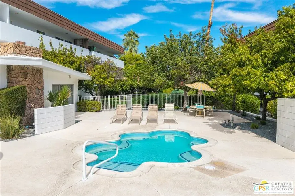 Welcome to Canyon View Condos, an iconic mid-century modern community designed by noted architects Wexler and Harrison and developed by Robert Fey. This highly sought-after enclave is celebrated for its timeless design, low-density setting, and ideal South Palm Springs location nestled between the mountains and one of the city’s most prestigious neighborhoods. Surrounded by dramatic mountain views and close to world-class hiking, golf, and downtown Palm Springs, this is desert living at its finest. This beautifully upgraded 2 bedroom, 2 bathroom condo offers approximately 1,163 square feet of light-filled interior space with classic mid-century lines and modern finishes. The open floor plan features large windows and sliding glass doors that fill the home with natural light while capturing stunning views of the surrounding landscape. The upgraded kitchen showcases quartz countertops, mosaic tile backsplash, stainless steel appliances, and sleek cabinetry that flows seamlessly into the dining area, perfect for entertaining while enjoying the views. The spacious living room features carpet flooring, recessed lighting, and dual sliders that open to an expansive east-facing patio overlooking lush green space and the sparkling pool. The primary suite also offers soft carpet underfoot, a slider to the patio, generous closet space, and a designer stone accent wall that adds texture and style. Tile flooring extends through the entry, kitchen, hallway, bathrooms, and guest bedroom, creating a clean, cohesive look throughout. The primary bath features a large walk-in shower with modern finishes. The guest bedroom is equally inviting with a statement stone feature wall and tongue-and-groove shiplap wood ceiling accented by recessed lighting. The guest bath offers a stylish shower and tub combination with updated fixtures. The private patio enjoys morning sun and afternoon shade, perfectly oriented to enjoy east-facing views while being protected from the harsh summer heat, helping reduce utility costs. The setting is tranquil, with the pool and greenbelt just steps away, creating an ideal indoor-outdoor living experience. Community amenities include a large swimming pool and spa, clubhouse, and on-site laundry facilities. Owners also have the option to install in-unit washer and dryer systems with HOA approval. The low monthly HOA fee covers Wi-Fi, cable TV, gas, water, sewer, and community amenities, providing exceptional value and convenience. Canyon View Condos remains one of Palm Springs’ most recognizable and desirable mid-century communities, celebrated for its architectural significance, serene setting, and proximity to everything the desert lifestyle offers. Whether as a primary residence, weekend retreat, or investment opportunity, this home captures the essence of Palm Springs modern living.