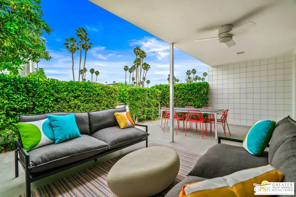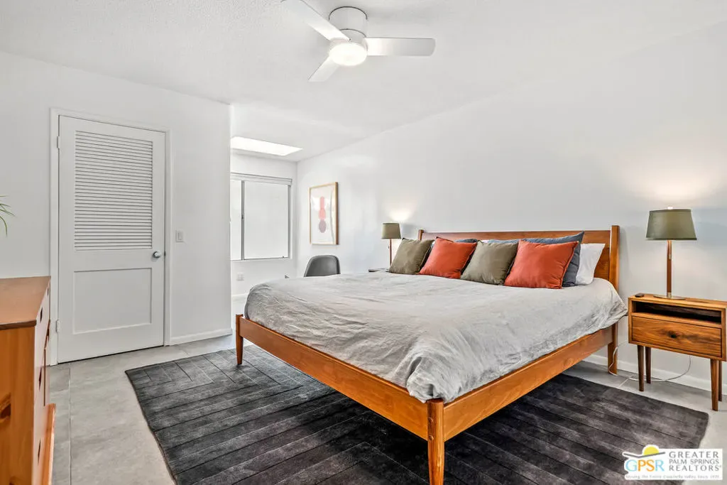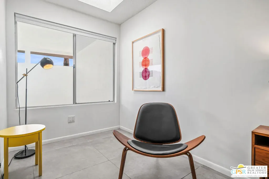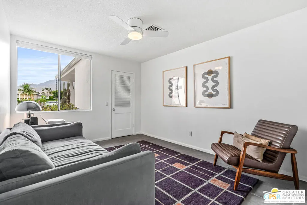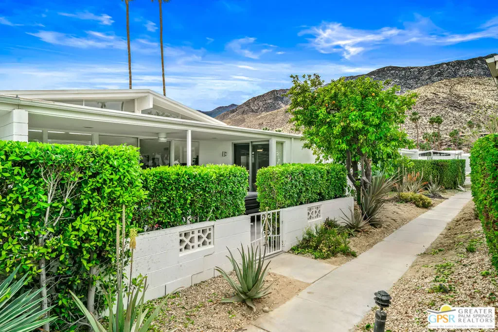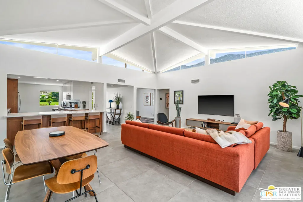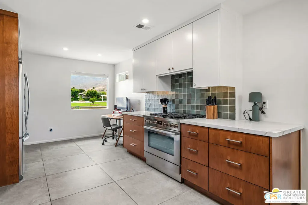 Welcome to 344 E. Avenida Granada, a beautifully updated midcentury modern condo in the highly sought-after Canyon View Estates neighborhood of South Palm Springs. This spacious 3-bedroom, 2-bathroom home offers over 1,600 square feet of thoughtfully designed living space, blending classic architectural charm with modern upgrades. Step through the new front door into a light-filled interior featuring new interior doors, updated window blinds throughout, and stylish finishes at every turn. The renovated kitchen is a true centerpiece, showcasing custom cabinetry, new countertops with an overhang for casual dining, a new skylight that fills the space with natural light, and upgraded lighting, including under-cabinet illumination. A suite of new appliances featuring a Whirlpool refrigerator, Bosch stove, and Sharp microwave drawer adds both functionality and sleek design. New tile flooring and a designer backsplash complete the space. Both bathrooms have been tastefully remodeled. The guest bathroom features new tile flooring, a modern countertop, and a walk-in tile shower, while the primary bathroom offers similar upgrades with elegant finishes and a spa-like feel. The guest bedroom has been enhanced with new tile flooring, a generously sized closet, and additional space ideal for a workstation or home office. The primary suite includes a custom California Closet system, providing ample storage and organization. Enjoy indoor-outdoor living with a private patio featuring newly installed tile, perfect for relaxing or entertaining in the Palm Springs sunshine. This is a rare opportunity to own a move-in-ready midcentury gem in one of South Palm Springs’ most iconic communities.