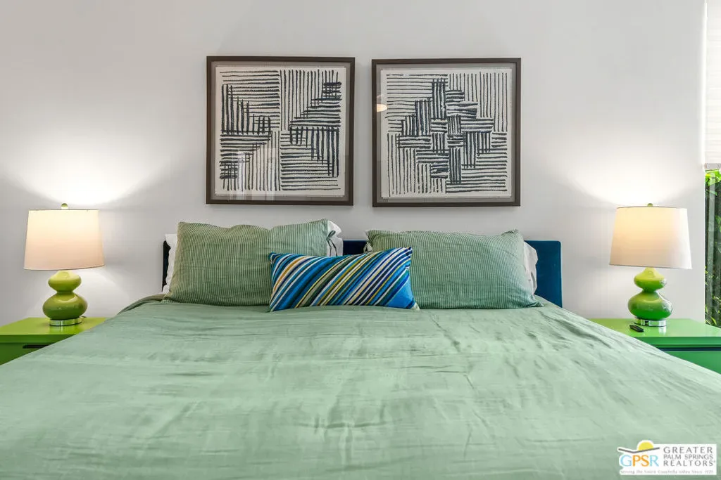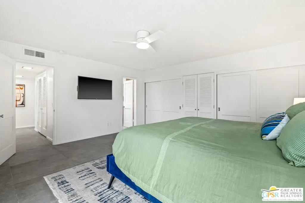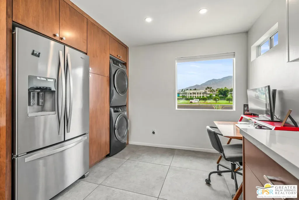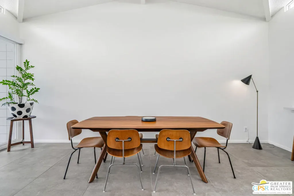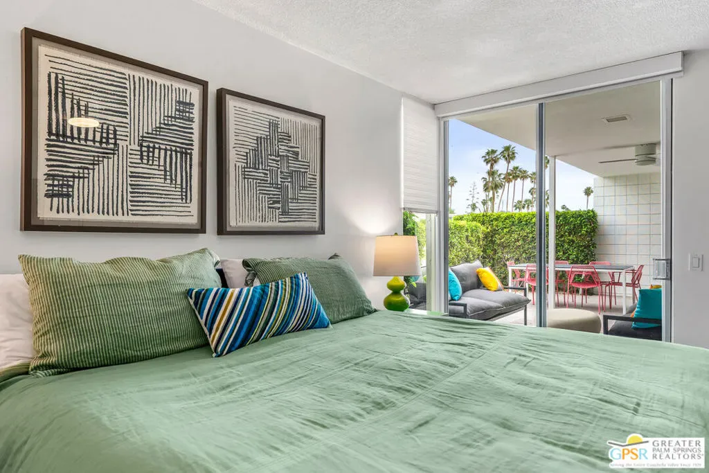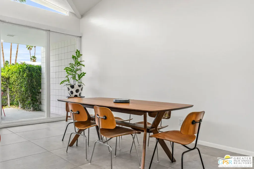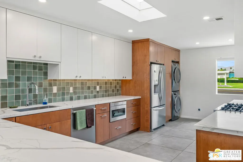Welcome to 344 E. Avenida Granada, a beautifully updated midcentury modern condo in the highly sought-after Canyon View Estates neighborhood of South Palm Springs. This spacious 3-bedroom, 2-bathroom home offers over 1,600 square feet of thoughtfully designed living space, blending classic architectural charm with modern upgrades. Step through the new front door into a light-filled interior featuring new interior doors, updated window blinds throughout, and stylish finishes at every turn. The renovated kitchen is a true centerpiece, showcasing custom cabinetry, new countertops with an overhang for casual dining, a new skylight that fills the space with natural light, and upgraded lighting, including under-cabinet illumination. A suite of new appliances featuring a Whirlpool refrigerator, Bosch stove, and Sharp microwave drawer adds both functionality and sleek design. New tile flooring and a designer backsplash complete the space. Both bathrooms have been tastefully remodeled. The guest bathroom features new tile flooring, a modern countertop, and a walk-in tile shower, while the primary bathroom offers similar upgrades with elegant finishes and a spa-like feel. The guest bedroom has been enhanced with new tile flooring, a generously sized closet, and additional space ideal for a workstation or home office. The primary suite includes a custom California Closet system, providing ample storage and organization. Enjoy indoor-outdoor living with a private patio featuring newly installed tile, perfect for relaxing or entertaining in the Palm Springs sunshine. This is a rare opportunity to own a move-in-ready midcentury gem in one of South Palm Springs’ most iconic communities.