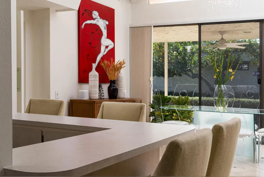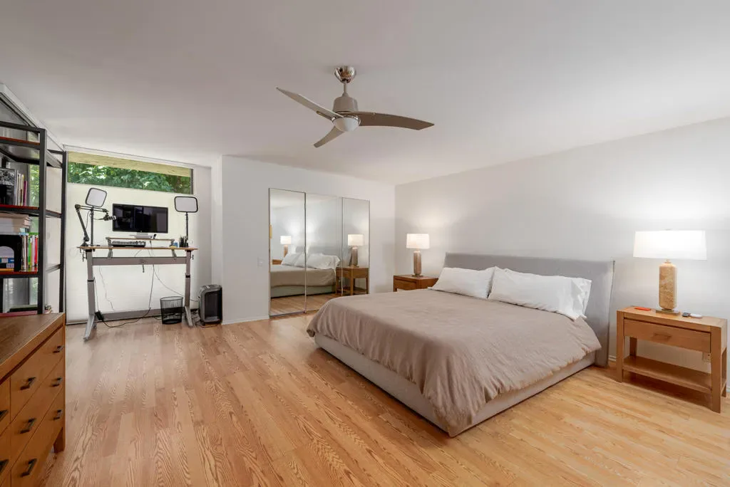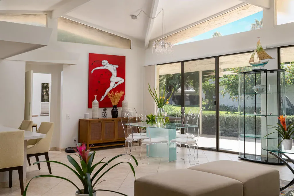 Great NEW PRICE! A true Mid-Century Modern gem in coveted South Palm Springs, Canyon Vista Estates captures the timeless architectural vision of Charles E. Du Bois, thoughtfully built by Roy Fey and set on FEE land (you own the land). This residence is one of only 26 homes in an intimate, low-density enclave defined by classic desert lines, manicured grounds, dramatic mountain views, two pools, spas, and a tennis court in the iconic Twin Palms neighborhood. Expansive Living and Dining spaces showcase soaring 12′ ceilings, clerestory windows, and tile flooring throughout. A comfortable Den with fireplace offers flexibility and can serve as a third bedroom. The sunken bar and generous patio set the stage for seamless indoor-outdoor living, with direct access from the Kitchen, Living Room, and Primary suite. The eat-in Kitchen features sleek countertops and stainless steel appliances. A spacious Laundry Room with abundant storage connects to the oversized two-car garage. Thoughtful bedroom separation enhances privacy, with both primary and guest suites offering en-suite baths and large walk-in closets. The primary bath is complete with dual vanities, a soaking tub, and separate shower. Lovingly maintained, this home presents an exceptional opportunity to reimagine and elevate to its fullest potential. Positioned on a premier corner lot, the property enjoys added privacy, natural light, and an open, airy ambiance. Canyon Vista Estates spans 8 acres, creating a boutique, resort-inspired lifestyle in the heart of South Palm Springs.