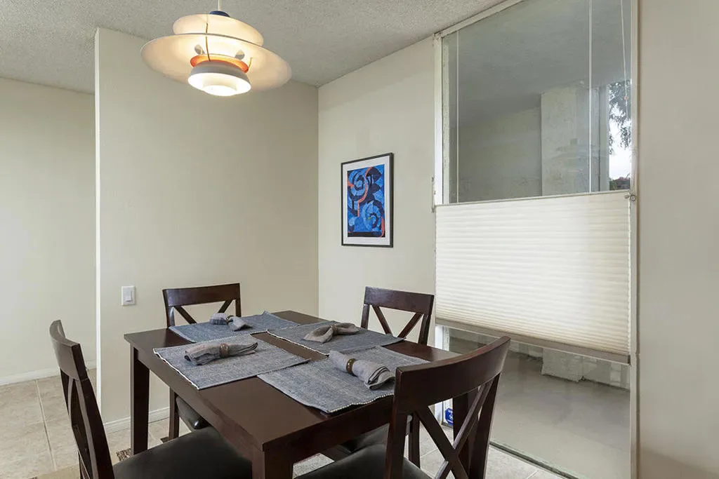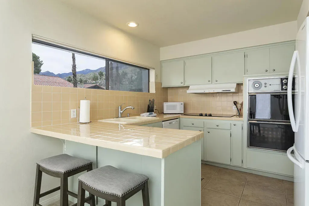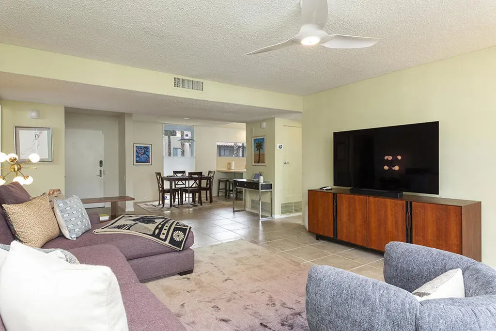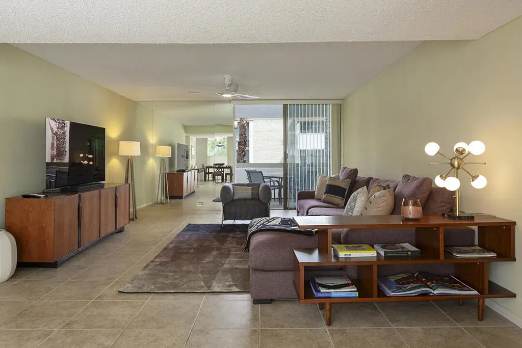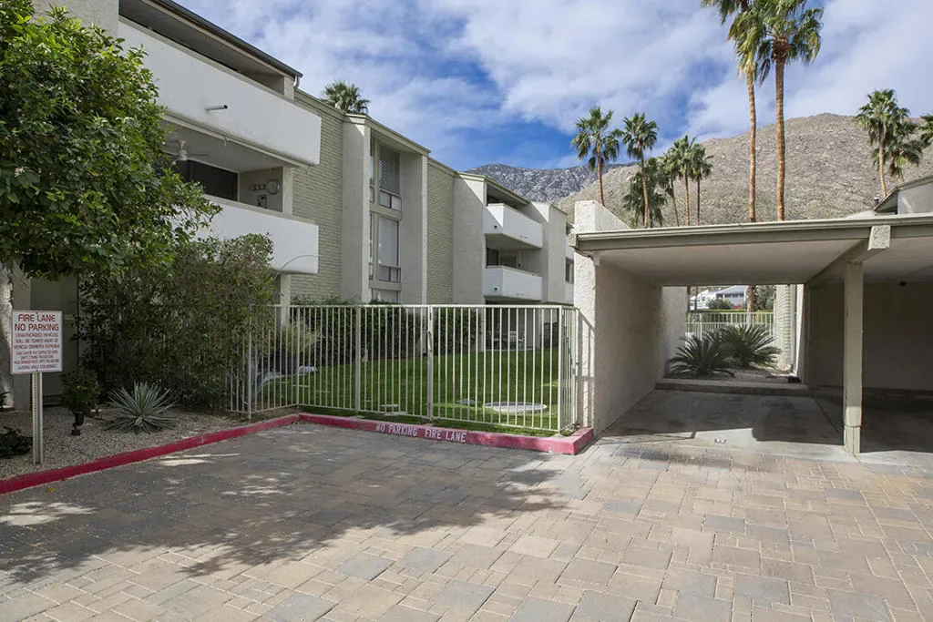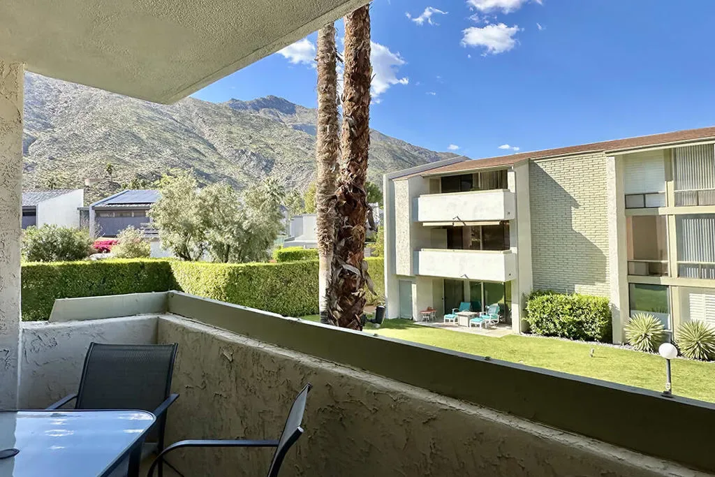 Located in the highly desirable South Palm Springs condo designed by renowned architect William F. Cody, AIA, captures the sophisticated spirit of classic mid-century design. It’s thoughtful, two-bedroom floor plan includes a large open-concept living room with sliding doors to a private patio with western mountain views.The kitchen reflects the clean lines and functional elegance that define Palm Springs modernism retaining its original mid-century cabinetry, tile work, and even the Gaffers & Sattler oven. There is a generously sized primary suite featuring a classic en-suite bath, large walk-in closet, and direct access to the private balcony shared with the living room. This private balcony offers sweeping views of the surrounding mountains as well as the community pool and spa, and includes a large storage closet.Tile flooring runs throughout the home, creating a clean and cohesive look that complements the mid-century design. The second, well-proportioned guest bedroom features a dramatic floor-to-ceiling window that frames views of the nearby mountains. Many of the home’s major systems and appliances have been updated, including the water heater, refrigerator, cooktop, and HVAC system.This single-level residence is located on the second floor of the three story structure with elevator access for convenience. The community offers a pool, spa, clubhouse, and laundry facilities, along with numerous fruit trees throughout the grounds for residents to enjoy. One covered parking space assigned and deeded. Additionally, the property is situated on fee simple land, meaning you own the land. Blending architectural pedigree, mountain views, and a prime South Palm Springs location, this home offers a refined take on the Palm Springs lifestyle.Additional Items and Amenities Suite of Nest devices, including the door bell, thermostat, front door smart lock, and smoke detectors Bedrooms both have ”smart” ceiling fans