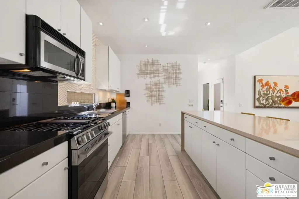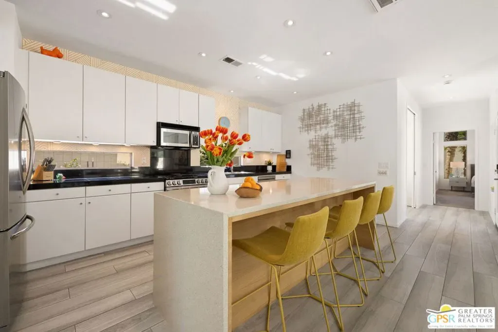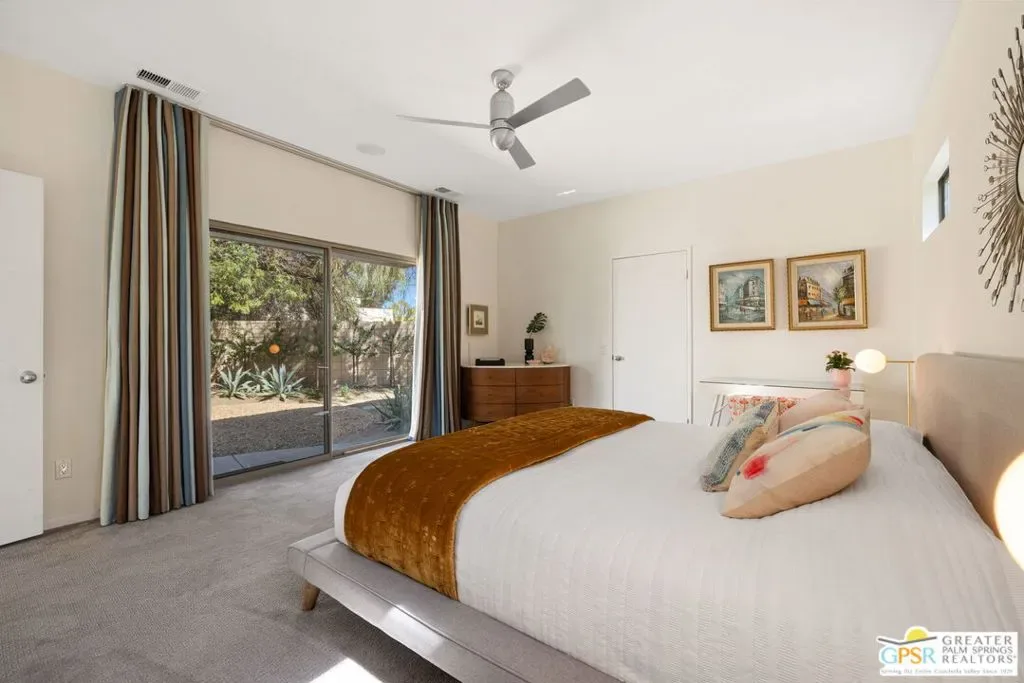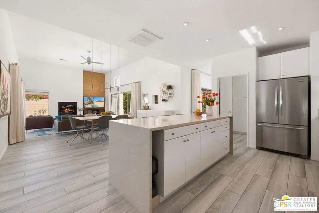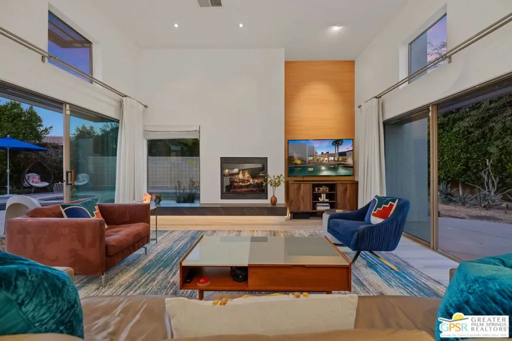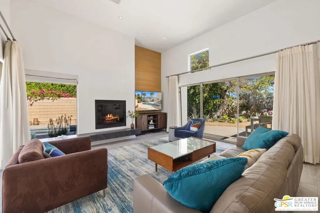 Set against the dramatic backdrop of Chino Canyon, this ultra-private modern retreat captures sweeping views of Mt. San Jacinto and the surrounding desert landscape. Defined by sharp architectural lines and professionally designed desert gardens, the home delivers a serene resort-style setting anchored by a saltwater pool and spa. Offered turnkey furnished with high-quality pieces from BoConcept and West Elm, the residence is ready to enjoy from day one with the added cost-savings advantage of no HOA or land lease. Inside, dramatic 12-foot ceilings, an open floor plan, and multiple sets of sliding doors create seamless indoor/outdoor living while filling the home with natural light. The living and dining areas center around a gas fireplace and connect effortlessly to the outdoor entertaining spaces and pool terrace. The spacious kitchen features a large island, updated appliances, and open sightlines ideal for gathering and entertaining. The bedroom layout offers excellent privacy. Two primary-style suites each enjoy direct access to their own baths, while a third flexible room with an Italian-made Murphy bed system and garden access functions beautifully as an office or guest suite. Outdoors, the property becomes a private desert sanctuary with mature landscaping and an impressive collection of 32 fruit-bearing trees and plants including lemon, grapefruit, mandarin, kumquat, lime, naval orange, avocado, guava, grapes, and more. Additional highlights include a detached two-car garage with striking glass-and-aluminum door, laundry room off the kitchen, and a whole-house self-flushing water filtration system. Modern design, mountain views, and exceptional privacy – this Chino Canyon retreat captures the essence of Palm Springs living.