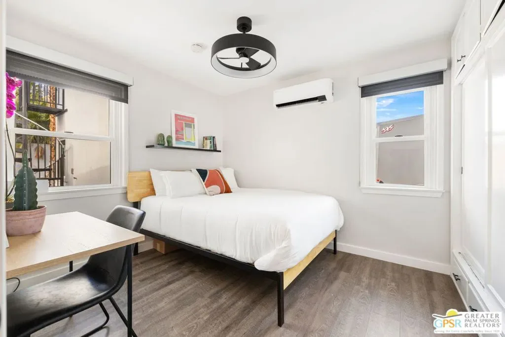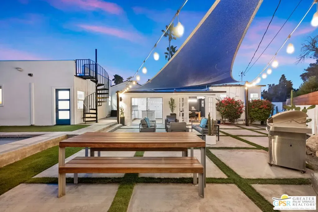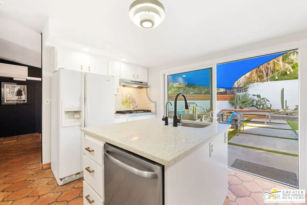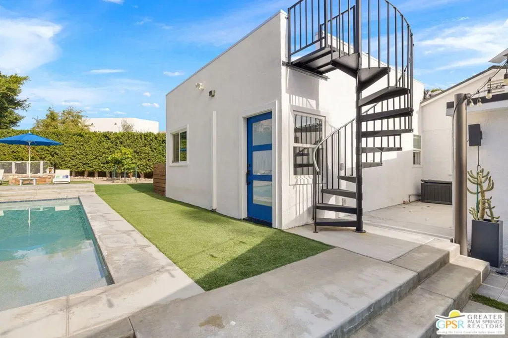 1940s ranch style living in Chino Canyon with sweeping mountain views and a true sense of place, all set within an exceptionally private setting. Nearly one third acre on a quiet street with an elevated approach creates a striking first impression, framed by swaying palms and dramatic desert peaks. 4 bedrooms and 3 baths including a substantial detached casita and excellent separation of bedrooms throughout. Thoughtful updates and freshly painted interior enhance the home’s classic character, complemented by a newer HVAC system for year round comfort. Fee Land (you own it) and currently eligible for the city’s SHORT TERM RENTAL permit add flexibility for full time, seasonal, or investment use. Big views of Little Tuscany, Chino Canyon, and surrounding mountains unfold from the rooftop deck, especially magical at sunset. A modernist breeze block detail sets the tone as you enter the living room featuring vaulted ceilings and a focal point fireplace. The kitchen with island and adjacent dining area open directly to the saltwater pool and patio, creating effortless indoor outdoor flow and multiple conversation areas. A commercial grade sunshade extends over the patio for comfortable outdoor living, while a whole house water treatment system and reverse osmosis system in the kitchen add an extra layer of quality and convenience. The bright primary suite offers large windows and direct access to the side yard and patio, while Guest Bedrooms 2 and 3 are positioned on the opposite end of the home for privacy. The casita delivers its own living area, kitchenette with breakfast bar, separate bedroom and bath, plus both front and rear doors with easy access to the pool. Low maintenance desert landscaping with lemon, lime, and grapefruit trees pairs beautifully with the setting. You’ll enjoy close proximity to Uptown Palm Springs and coveted neighborhoods including Little Tuscany and Vista Las Palmas. Once home to Hollywood actor Tom Neal, best known for his role in Detour, this property captures the enduring spirit of Palm Springs golden era living.