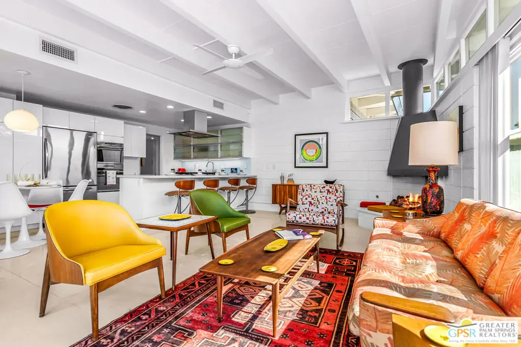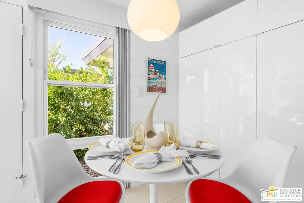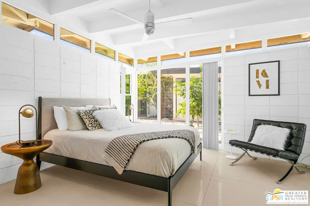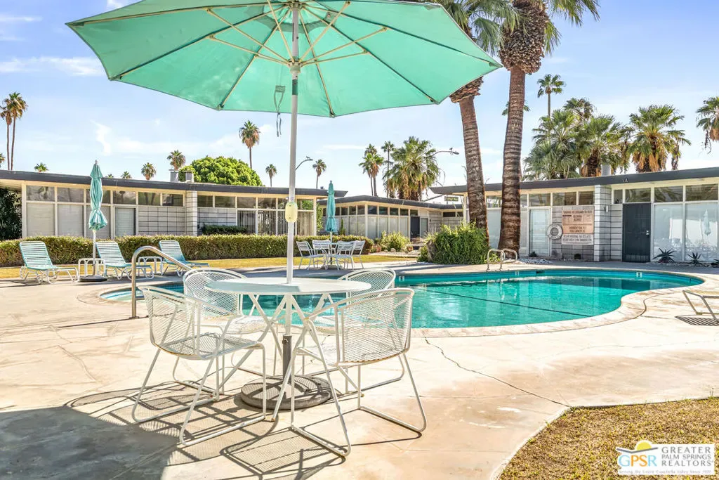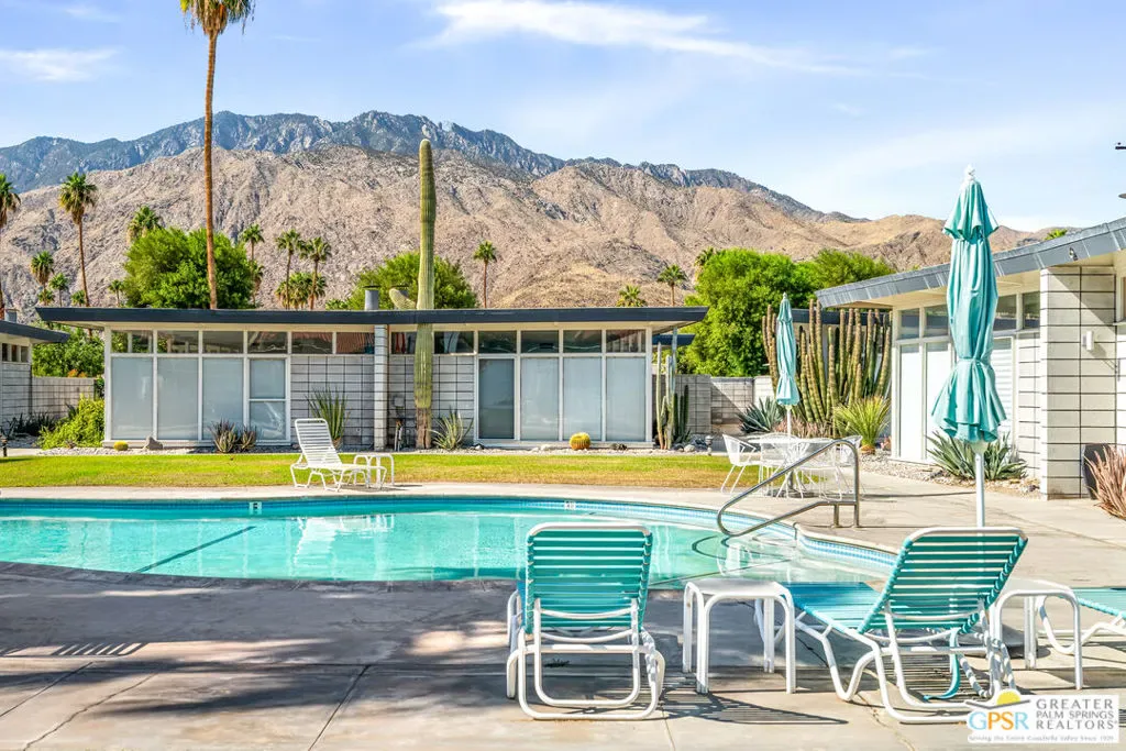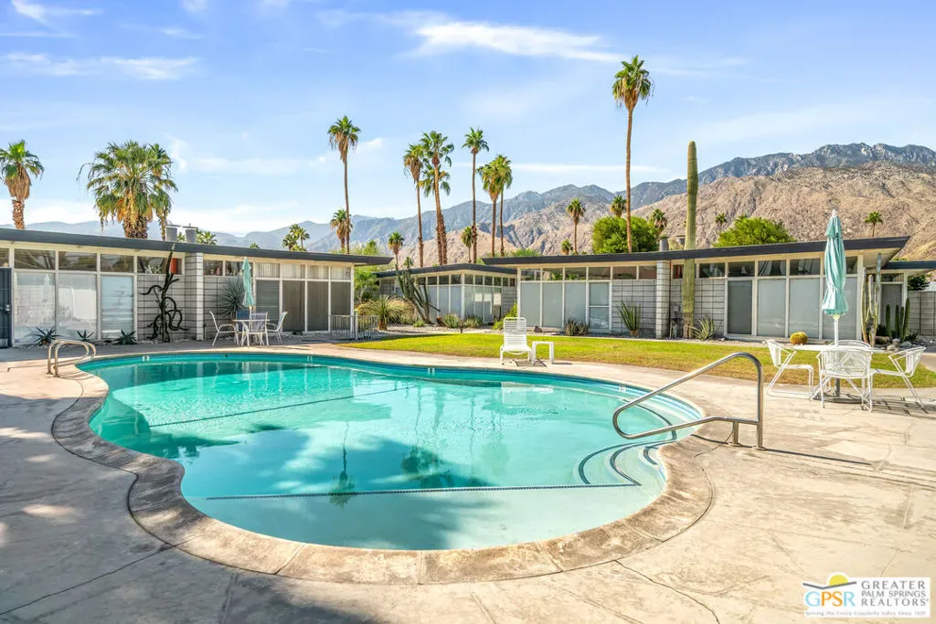 Outstanding opportunity to purchase at rarely available Desert Holly–a 14 unit, 8 building Historically Designated Mid-Century property (Mills Act reduced property taxes!) in the heart of Central Palm Springs-Sunrise Park designed and built by Long Beach builder & developer William J. O’Brien, Jr. and is sited close to downtown PS, PSP International and I-10. This stand-alone/detached home offers soaring walls of glass, original fireplace, renovated chef’s kitchen and baths. Stunning terrazzo tile floors, upscale appliances , designated parking, 2 private patios and is just steps away from the community pool. This property is currently being used as a successful seasonal rental. Would make a great primary residence, second home or continue its current use as a rental/investment property. Outstanding condition with pride of ownership abounding. Move in, unpack and enjoy!