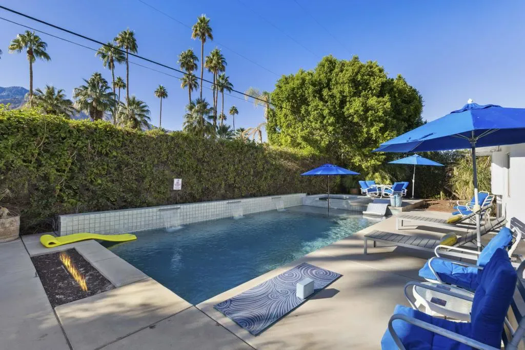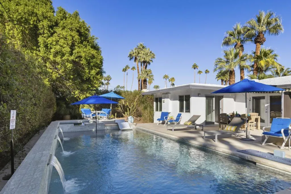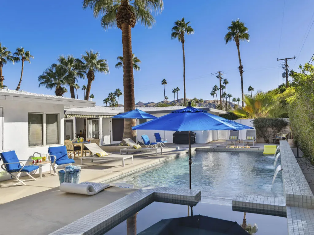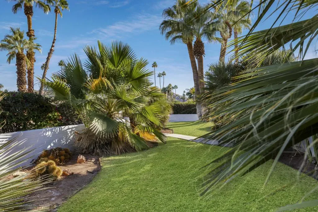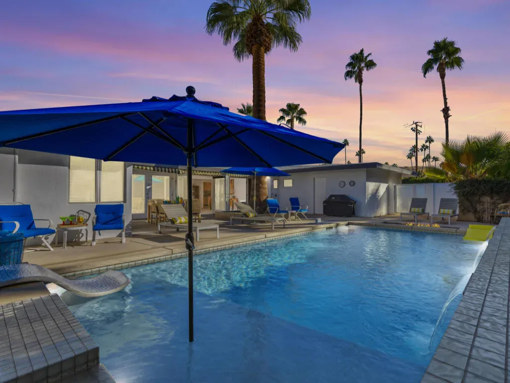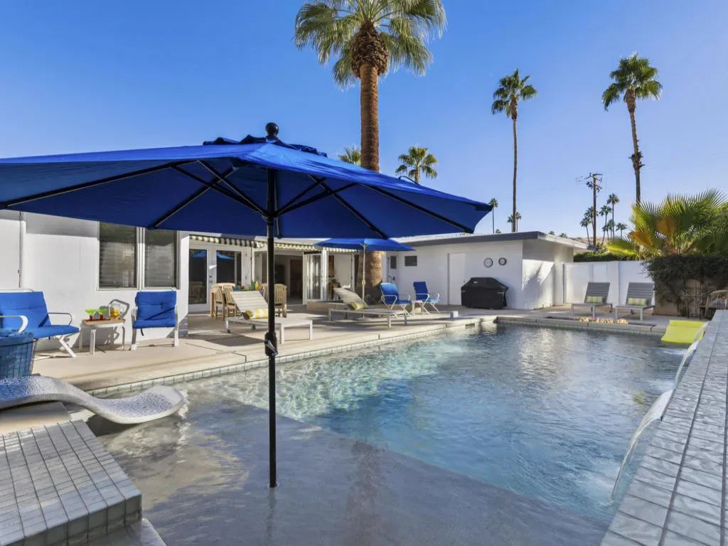 Fabulous Updated Mid-Century home on an oversized corner lot in Deepwell Estates! Expansive great room with white brick fireplace, large format tiles and a wall of glass French doors overlooking the backyard. The lushly landscaped backyard contains a gorgeous Saltwater pool with tanning ledge and waterfalls, spa, and firepit all with mountain views…plus its own bathroom! Kitchen with breakfast area, granite countertops, wood paneled cabinetry and stainless-steel appliances. There are 2 primary bedrooms that are both ensuite and open to the wrap around yard. A 3rd guest bedroom can also easily be an office. Large laundry room. Pool area with its own bathroom. Lush foliage and a white brick pony wall surround the front yard. Near Smoketree, Koffi South, and Ace Hotel!