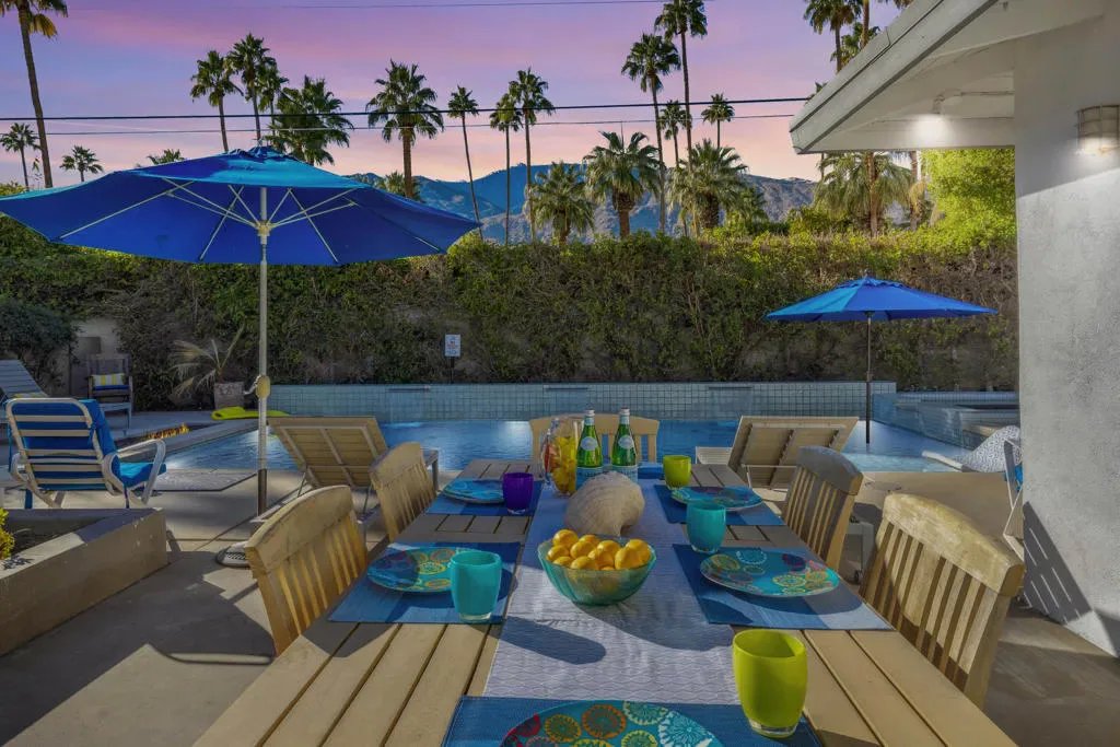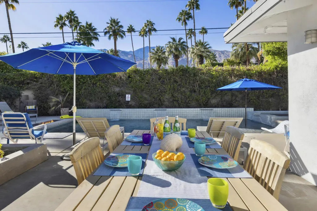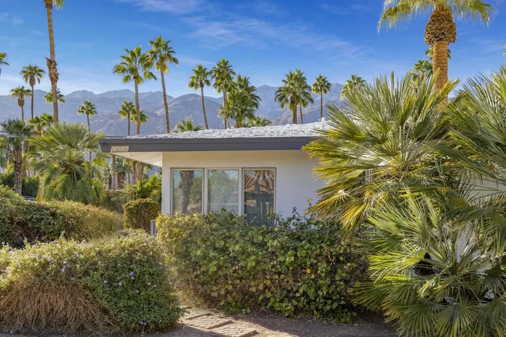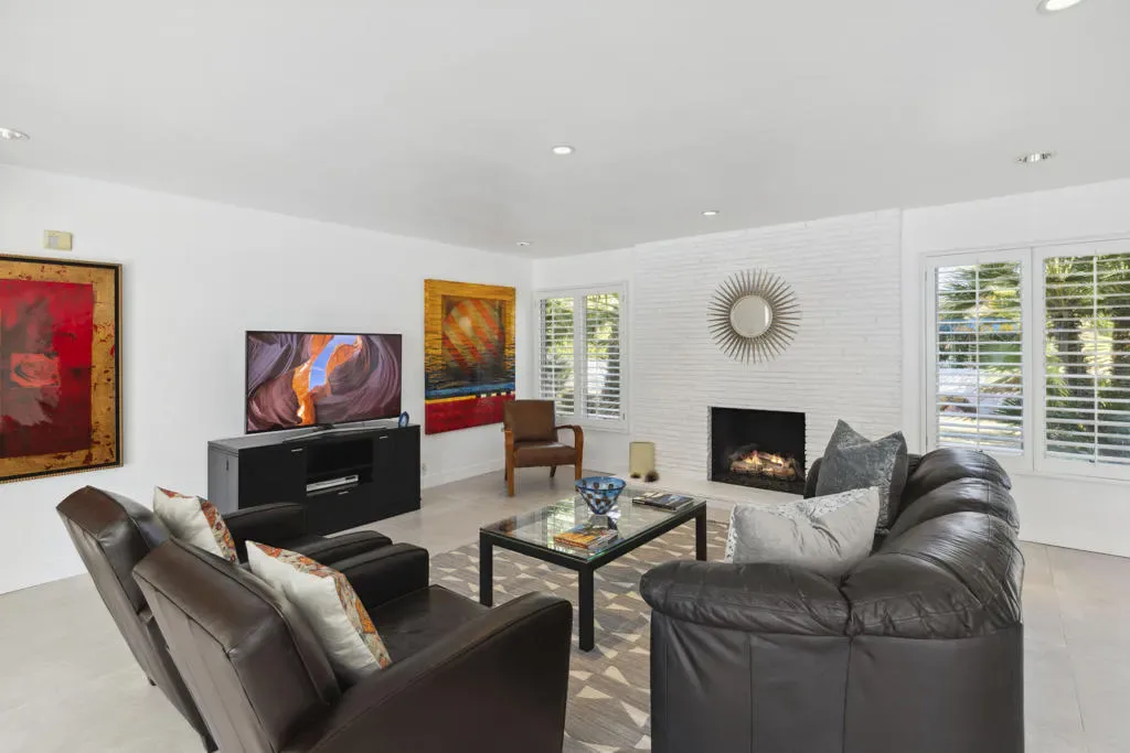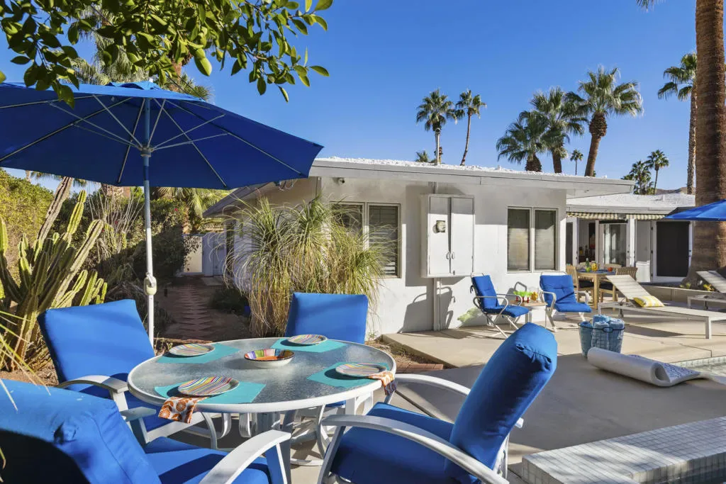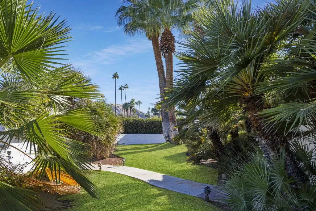 Fabulous Updated Mid-Century home on an oversized corner lot in Deepwell Estates! Expansive great room with white brick fireplace, large format tiles and a wall of glass French doors overlooking the backyard. The lushly landscaped backyard contains a gorgeous Saltwater pool with tanning ledge and waterfalls, spa, and firepit all with mountain views…plus its own bathroom! Kitchen with breakfast area, granite countertops, wood paneled cabinetry and stainless-steel appliances. There are 2 primary bedrooms that are both ensuite and open to the wrap around yard. A 3rd guest bedroom can also easily be an office. Large laundry room. Pool area with its own bathroom. Lush foliage and a white brick pony wall surround the front yard. Near Smoketree, Koffi South, and Ace Hotel!