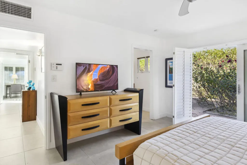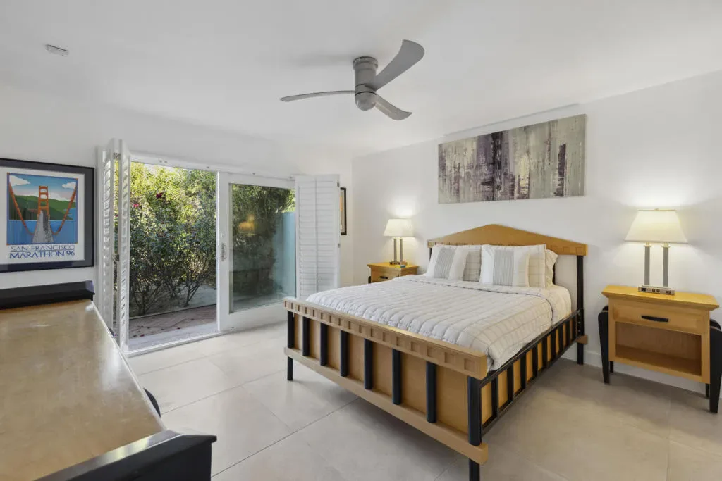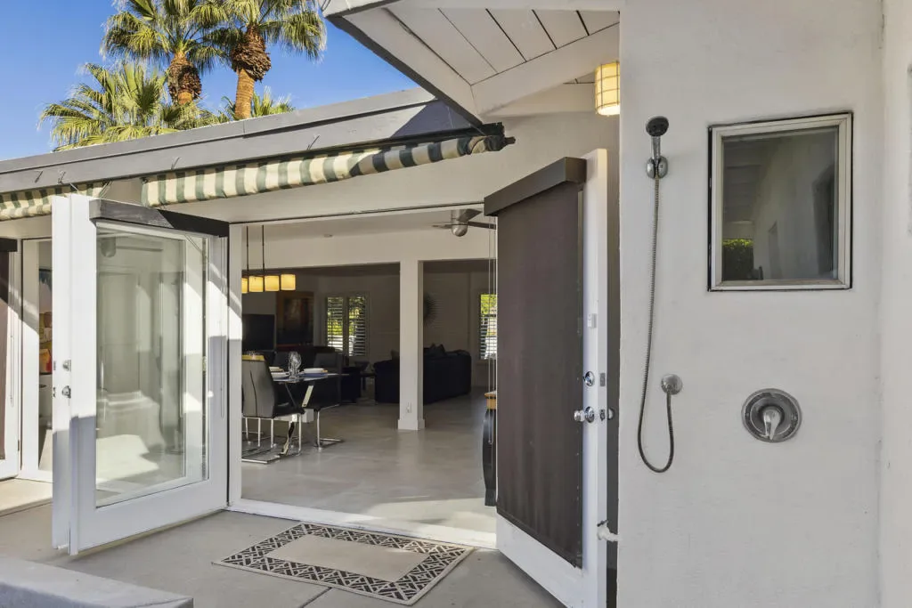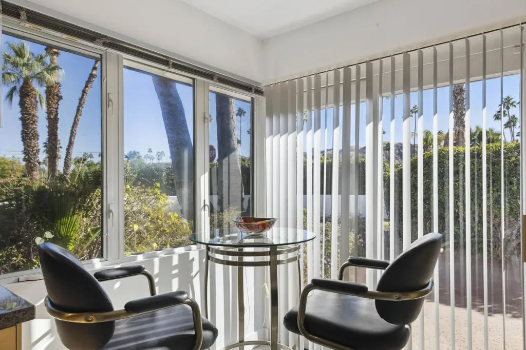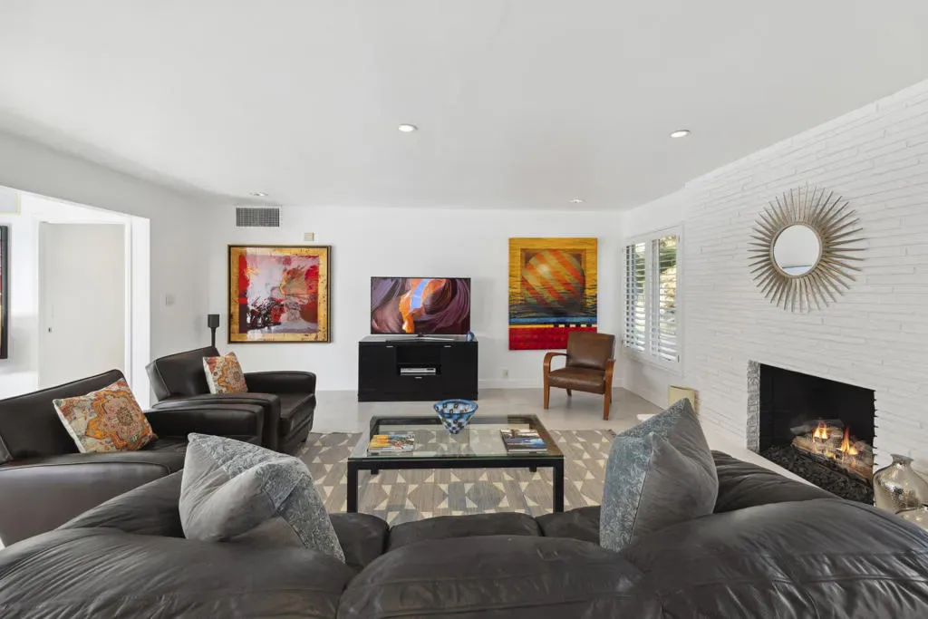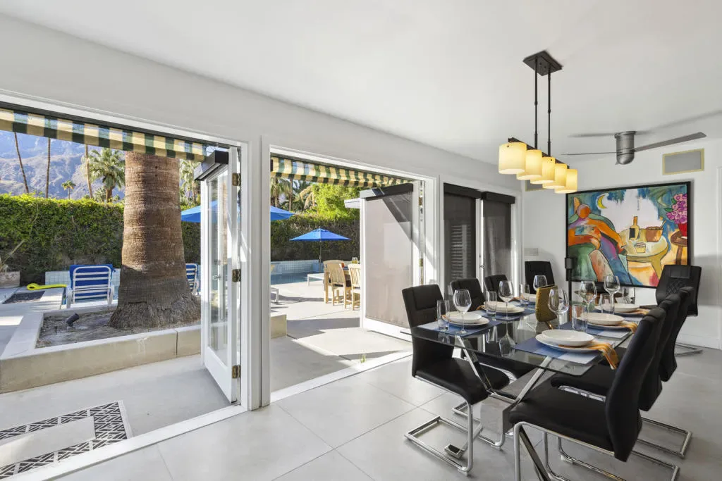 Fabulous Updated Mid-Century home on an oversized corner lot in Deepwell Estates! Expansive great room with white brick fireplace, large format tiles and a wall of glass French doors overlooking the backyard. The lushly landscaped backyard contains a gorgeous Saltwater pool with tanning ledge and waterfalls, spa, and firepit all with mountain views…plus its own bathroom! Kitchen with breakfast area, granite countertops, wood paneled cabinetry and stainless-steel appliances. There are 2 primary bedrooms that are both ensuite and open to the wrap around yard. A 3rd guest bedroom can also easily be an office. Large laundry room. Pool area with its own bathroom. Lush foliage and a white brick pony wall surround the front yard. Near Smoketree, Koffi South, and Ace Hotel!