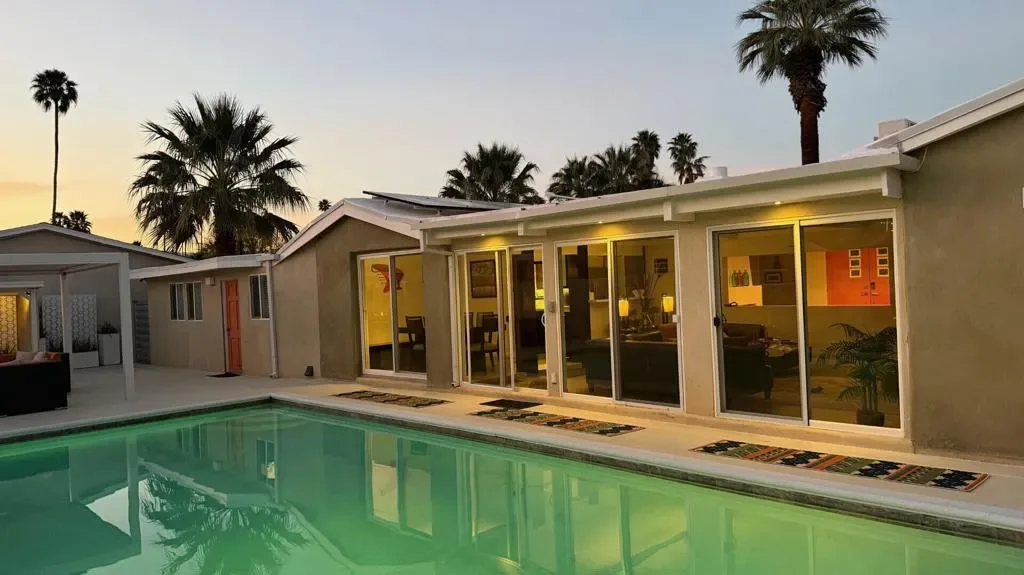 Rare Palm Springs Dual-Residence Estate with Resort Pool & Panoramic Mountain ViewsResort-style desert living on a .38-acre corner lot with two fully separate residences, huge pool, and panoramic mountain views–just blocks from Demuth Park and golf.Two beautifully remodeled, completely separate stand-alone residences sit on a sprawling 16,600 sq ft end-of-block lot, offering 8 bedrooms and 6 bathrooms with exceptional flexibility for a private compound, multi-generational living, or investment opportunity. There is almost triple the square footage of the surrounding neighborhood home lots. Each residence features its own driveway on different streets, providing privacy, convenience, and completely independent access.The elevated lot sits approximately 12 feet above the neighboring homes to the south, creating unobstructed 180 mountain views and a rare sense of privacy and openness. The lot is ”Fee land”, you own the lot. (no land lease) At the center of the property is a huge oversized resort-style pool, perfect for relaxing, entertaining, and enjoying the Palm Springs desert lifestyle.Located just a few blocks from Demuth Park–Palm Springs’ largest city park– offering brand new pickleball courts (under construction), 2 huge dog parks, tennis courts, soccer and baseball fields, playgrounds, and open green space. Several golf courses are also within walking distance. The new ”CV Link” Coachella Valley bike pathway trail runs right through the park.Additional property highlights include new roofs, owned and paid for solar system, solar-powered driveway gates, and a guest residence yard ready for future amenities such as a pickle-ball court, second pool, or additional outdoor entertainment space.Previously operated as a successful Estate vacation rental generating over $10,000 per month over the past two years it was rented. Furnishings and supplies may be available for a turn-key move-in or vacation rental opportunity.Live in one residence and rent the other, host family and friends in your own private desert compound, or continue its success as an income-producing retreat.Come have look in person soon. Call agent now to schedule a showing.