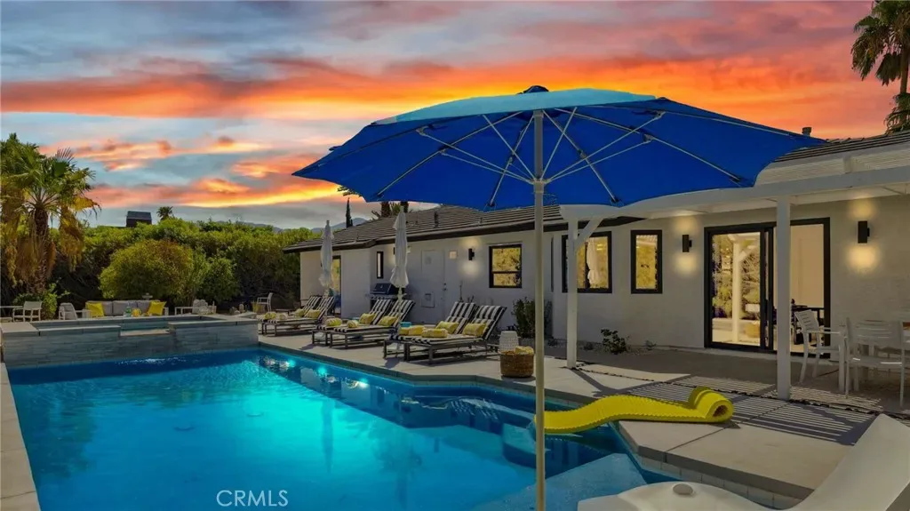 Step outside to your completely secluded, oversized backyard featuring a huge new saltwater pool, tanning shelf and 14-person spa; an 8-person outdoor dining area with infrared heat, Adirondack chairs surrounding a gas fire pit, cozy seating/working areas tucked into a zen fruit tree garden, outdoor games and ample space to relax and enjoy the beautiful Palm Springs sunrises and sunsets.