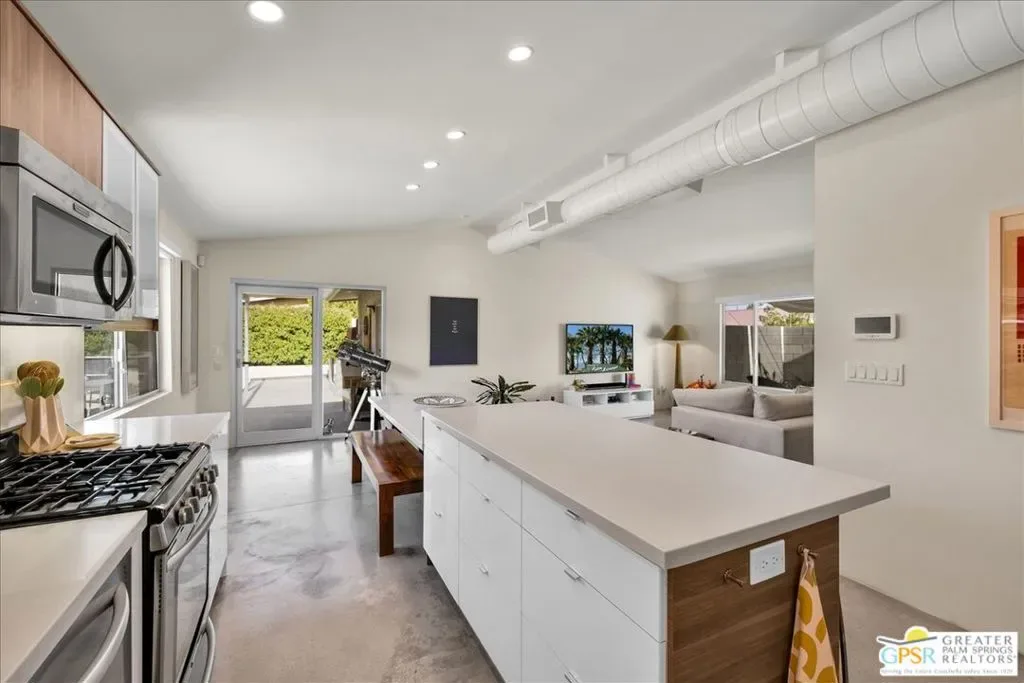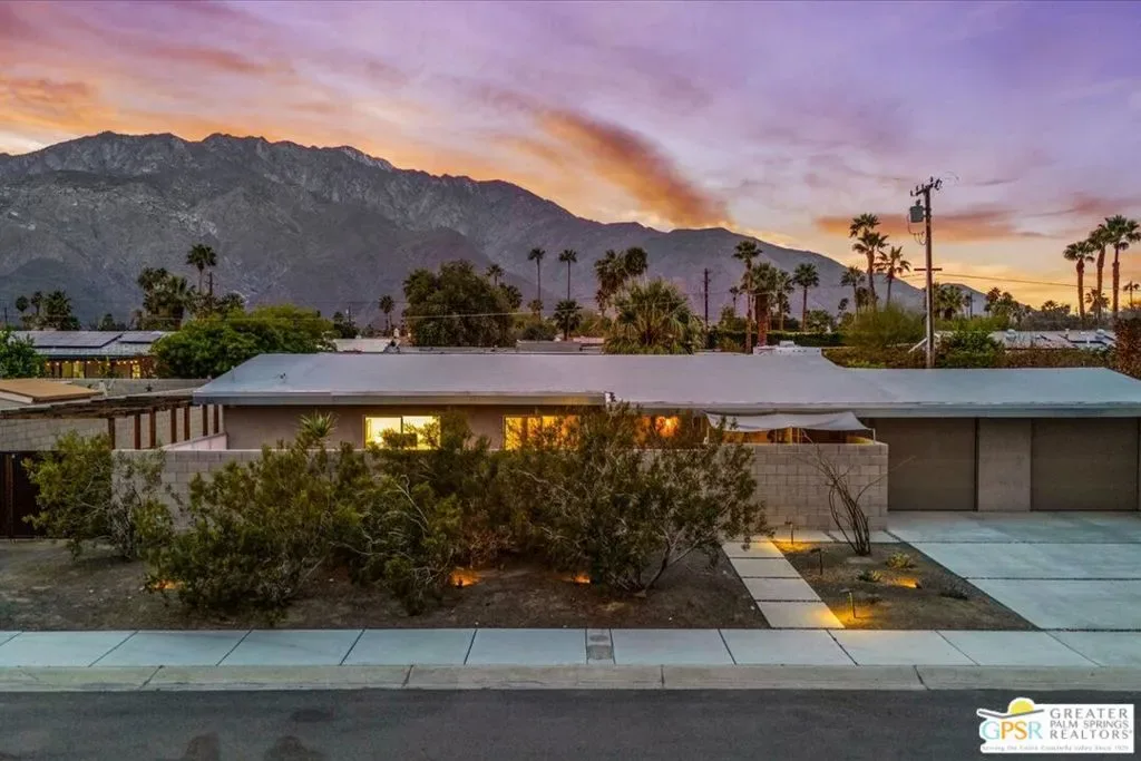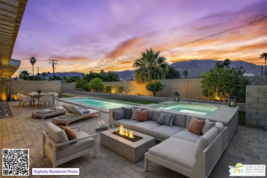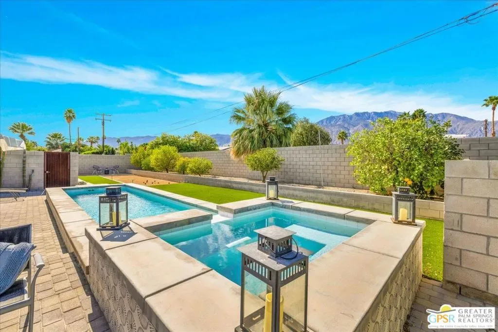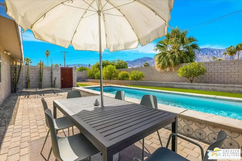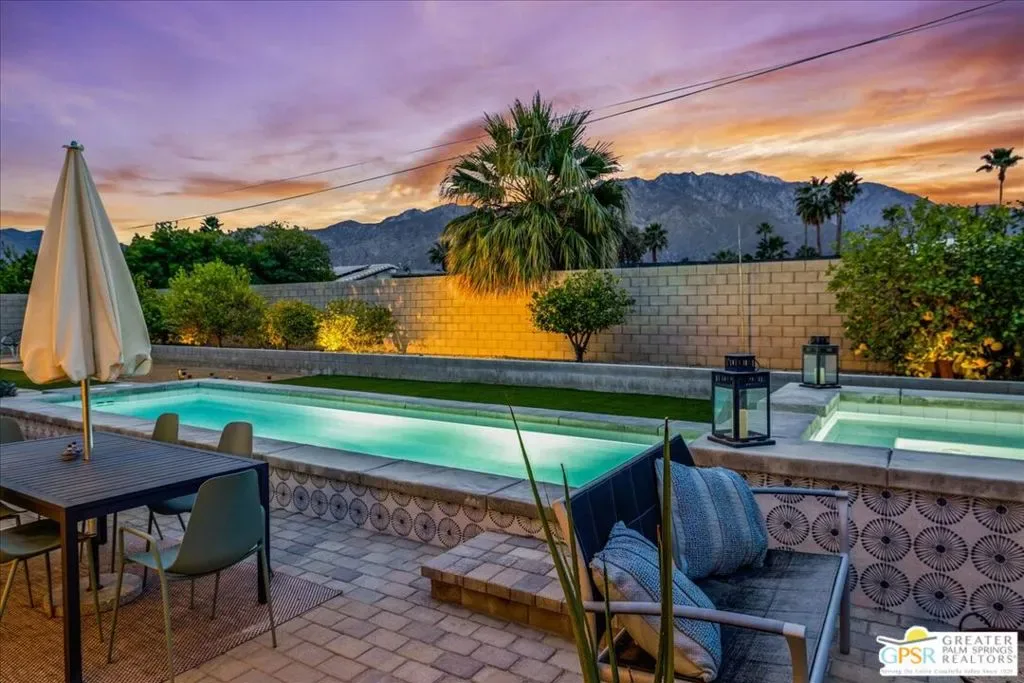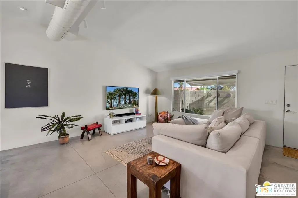 Striking 3BD/2BA industrial-modern residence offering 1,222 sq ft of thoughtfully designed living space, where a cohesive palette of steel, glass, stainless steel, and cinderblock carries seamlessly through both the interior and exterior. The home welcomes you with a private front patio and aloe garden, leading into interiors featuring finished exposed concrete floors, high ceilings, and exposed ductwork for a bold architectural feel. Custom built-in shelving anchors the living area, while a central surround sound system throughout the home enhances everyday living. The kitchen is a standout with a large quartz island, new cabinetry, stainless steel appliances, recessed lighting, and ample storage. One guest bedroom includes built-in desk space, while the third bedroom is currently used as a home office; blackout shades are installed in all bedrooms. The primary suite features sliding glass doors to a private seating patio, a walk-through closet, and a spa-style walk-in shower. The guest bath includes a walk-in shower, modern vanity, and in-unit laundry. Outdoor living is exceptional with a saltwater pool and spa, natural gas fire pit, bocce court, built-in outdoor grill, private outdoor shower, raised garden boxes, mature fruit trees, and flexible space that may accommodate RV parking. The home was recently updated with an emphasis on design and performance and includes an owned solar electric system with 16 panels, a 200-amp electrical panel, high-efficiency HVAC, and double-pane energy-efficient doors and windows with custom shades. Four additional solar panels, previously used for solar water heating, along with a whole-house evaporative cooler, have been disconnected by the current owner but remain in place should a future owner wish to utilize them. Additional features include ample storage and a ventilated two-car garage. A rare opportunity to own a design-forward, energy-efficient home with exceptional indoor-outdoor living in Palm Springs.