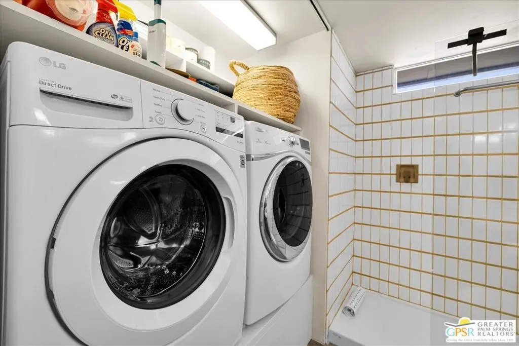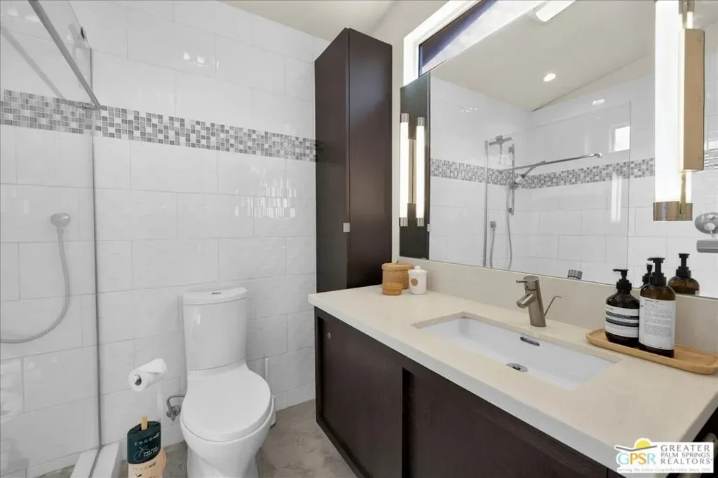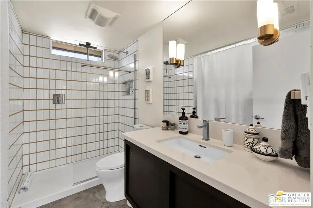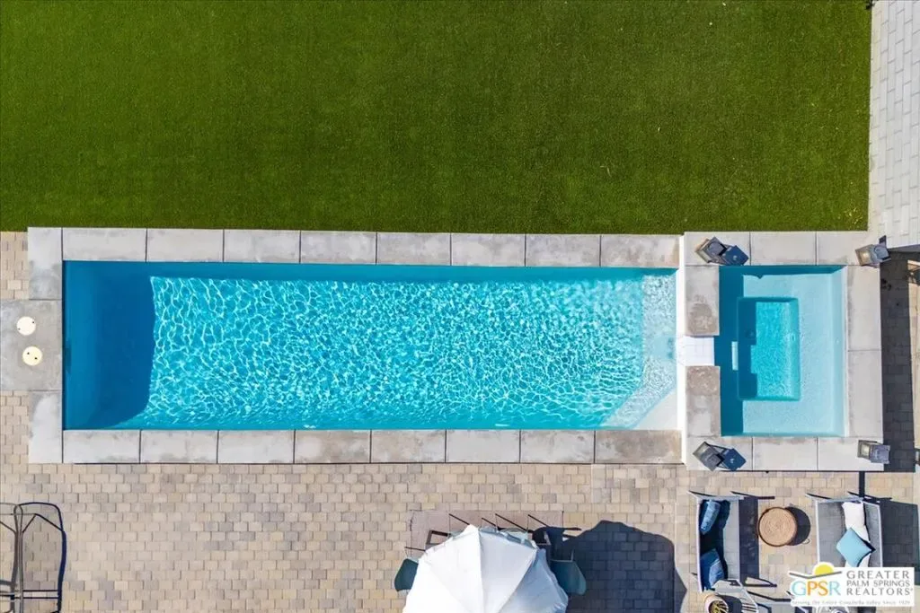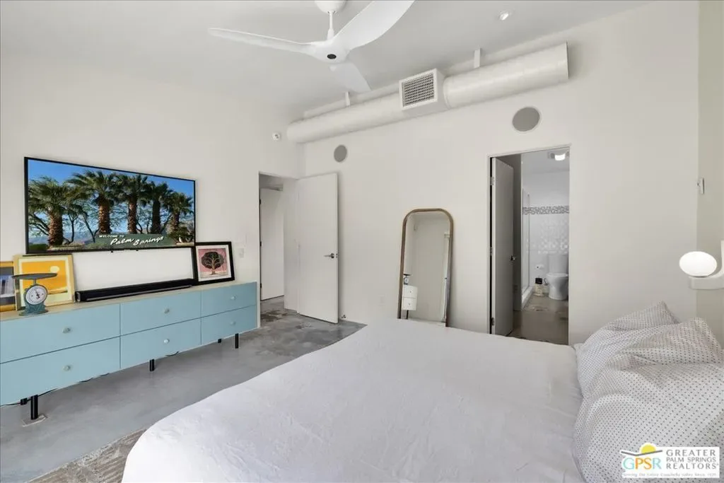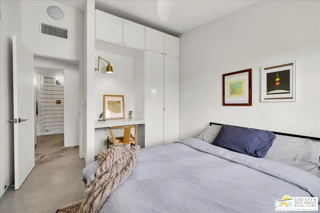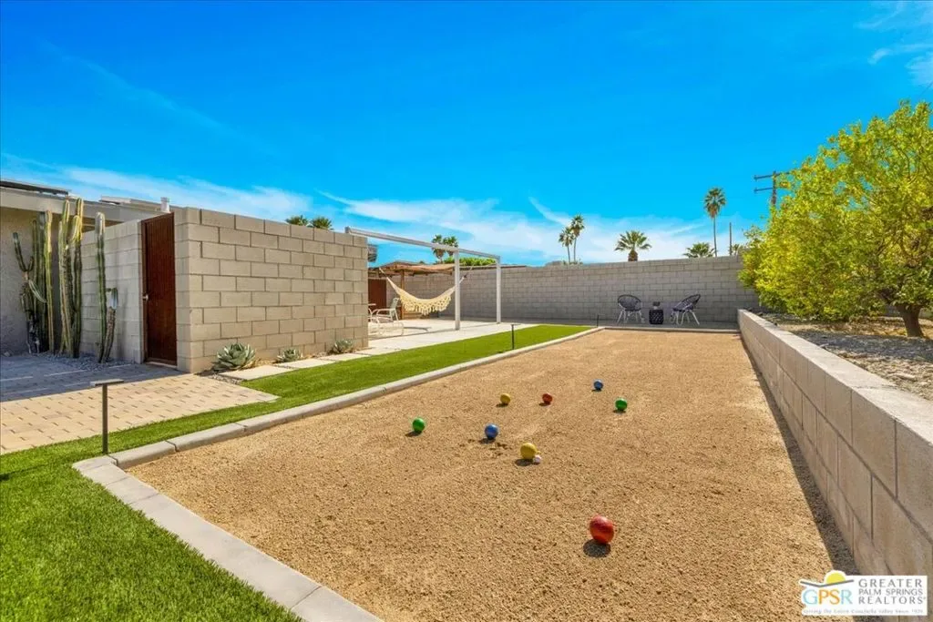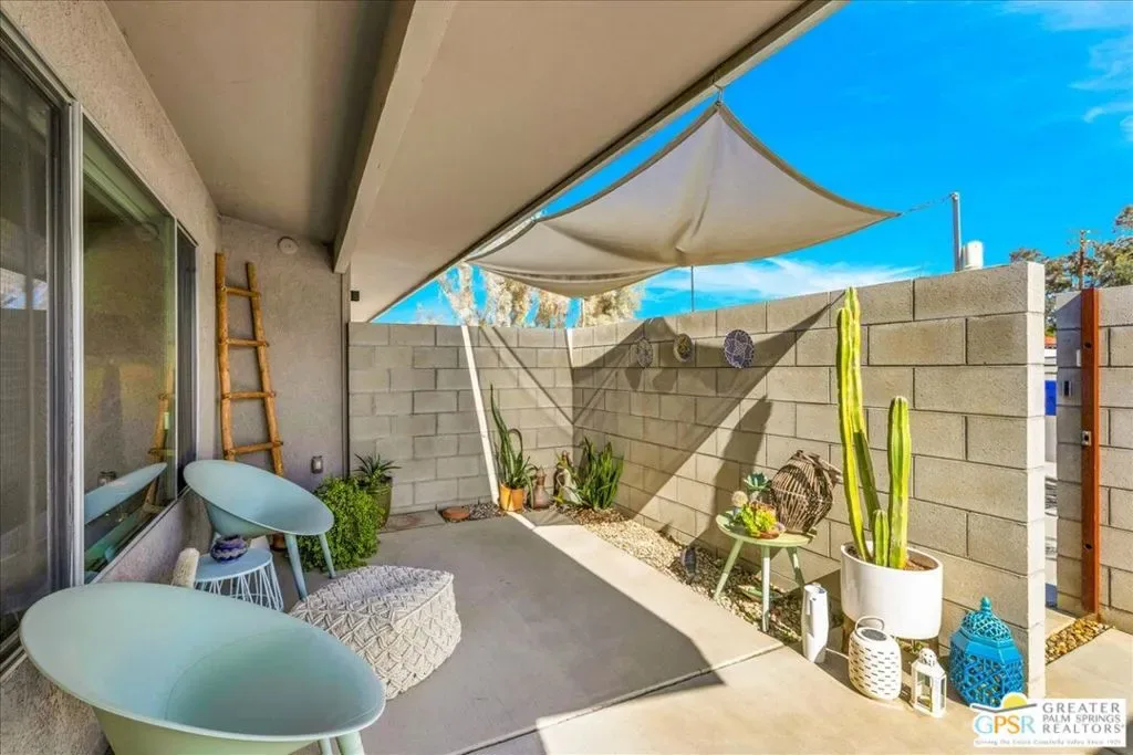 Striking 3BD/2BA industrial-modern residence offering 1,222 sq ft of thoughtfully designed living space, where a cohesive palette of steel, glass, stainless steel, and cinderblock carries seamlessly through both the interior and exterior. The home welcomes you with a private front patio and aloe garden, leading into interiors featuring finished exposed concrete floors, high ceilings, and exposed ductwork for a bold architectural feel. Custom built-in shelving anchors the living area, while a central surround sound system throughout the home enhances everyday living. The kitchen is a standout with a large quartz island, new cabinetry, stainless steel appliances, recessed lighting, and ample storage. One guest bedroom includes built-in desk space, while the third bedroom is currently used as a home office; blackout shades are installed in all bedrooms. The primary suite features sliding glass doors to a private seating patio, a walk-through closet, and a spa-style walk-in shower. The guest bath includes a walk-in shower, modern vanity, and in-unit laundry. Outdoor living is exceptional with a saltwater pool and spa, natural gas fire pit, bocce court, built-in outdoor grill, private outdoor shower, raised garden boxes, mature fruit trees, and flexible space that may accommodate RV parking. The home was recently updated with an emphasis on design and performance and includes an owned solar electric system with 16 panels, a 200-amp electrical panel, high-efficiency HVAC, and double-pane energy-efficient doors and windows with custom shades. Four additional solar panels, previously used for solar water heating, along with a whole-house evaporative cooler, have been disconnected by the current owner but remain in place should a future owner wish to utilize them. Additional features include ample storage and a ventilated two-car garage. A rare opportunity to own a design-forward, energy-efficient home with exceptional indoor-outdoor living in Palm Springs.