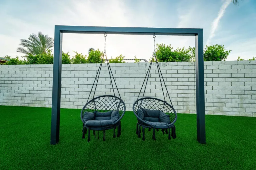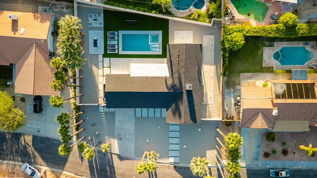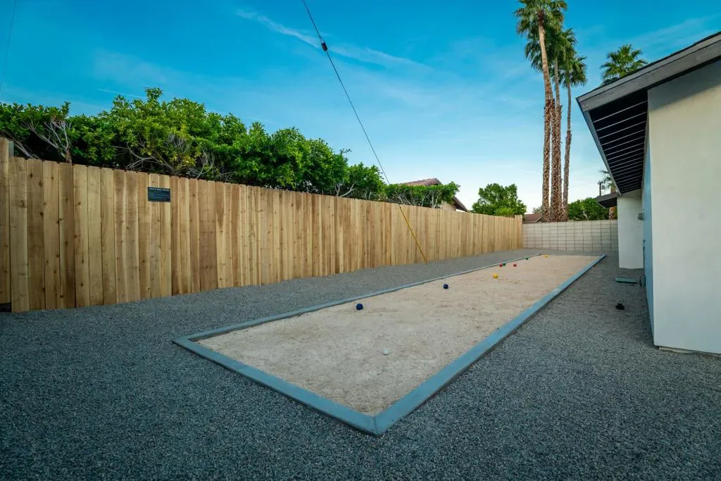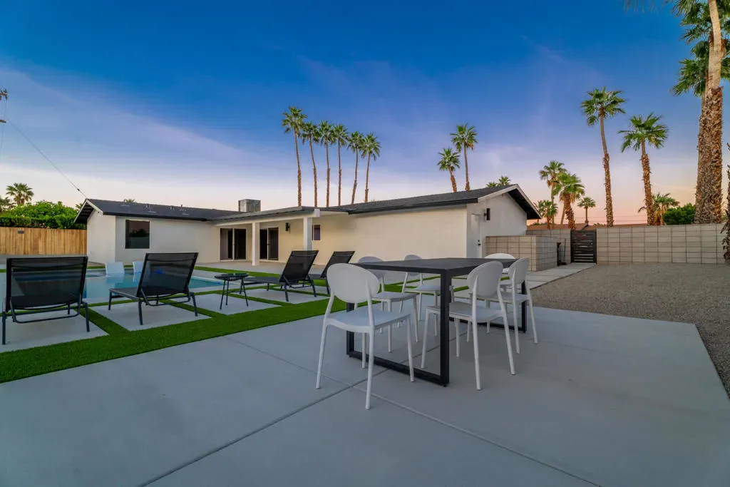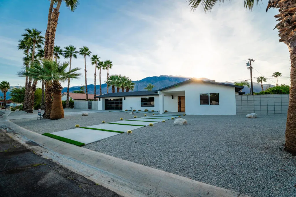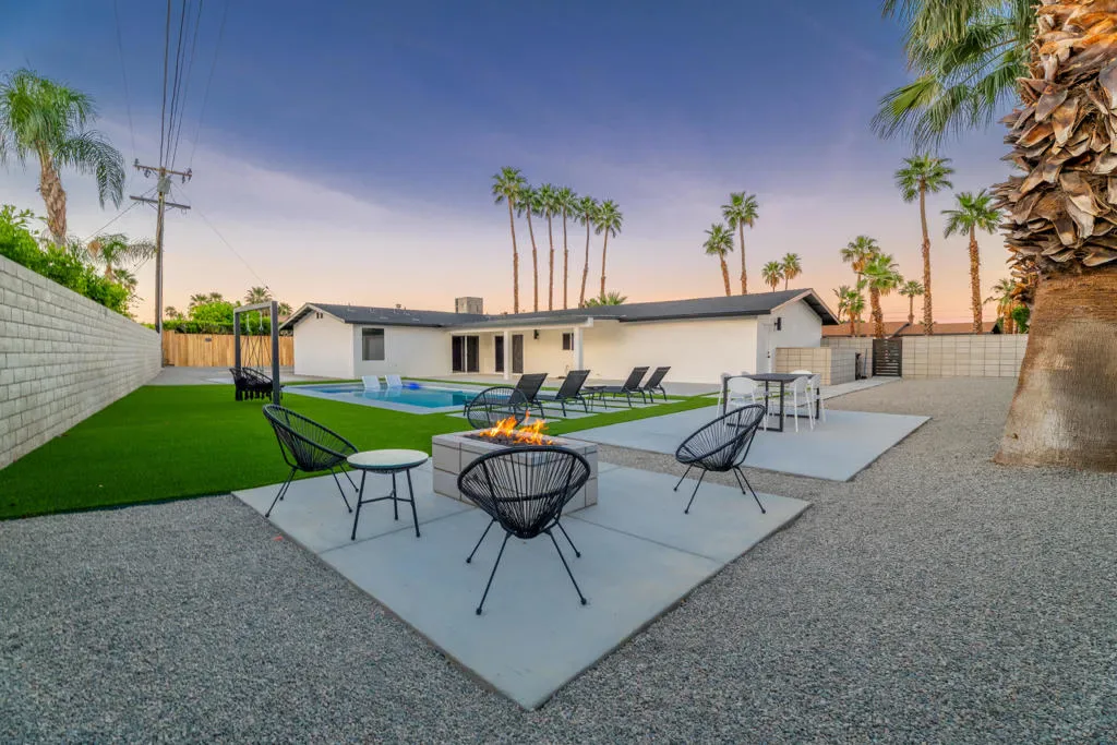 Stunning fully renovated home in the highly sought-after Desert Park Estates neighborhood of Palm Springs. This beautifully reimagined 3-bedroom, 2.5-bath residence offers approximately 1,927 sq ft of thoughtfully designed living space on an expansive 12,197 sq ft lot. Extensively remodeled with high-end finishes throughout, the home features a permitted reconfigured floor plan including an expanded primary suite with a luxurious new bath, custom closet, and added powder room. Interior highlights include custom cabinetry, quartz countertops, designer bathrooms with Italian tile, Hansgrohe fixtures, and elegant Venetian plaster accents. The home is complete with new dual-pane windows, smooth acrylic stucco exterior, Level 5 drywall finish, new flooring, doors, lighting, and a full electrical rewire with LED lighting and dimmers. A new 5-ton HVAC system and upgraded plumbing provide modern efficiency and comfort. The resort-style backyard is a true private retreat, showcasing a brand-new pool and spa, bocce ball court, fire pit, custom swings, and multiple outdoor entertaining areas. Over 6,000 sq ft of new concrete and hardscape, synthetic turf, updated landscaping, and a secure gated entry complete this exceptional outdoor space. Additional upgrades include a new roof, garage improvements, and extensive exterior enhancements throughout. Ideally located near shopping, dining, golf, and vibrant downtown Palm Springs, this property offers the perfect blend of luxury, comfort, and modern desert living. Whether as a full-time residence or a stylish desert getaway, this home truly captures the essence of Palm Springs living.
