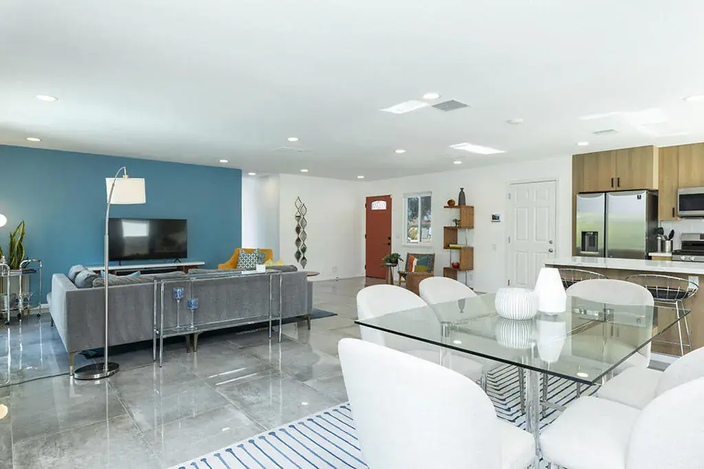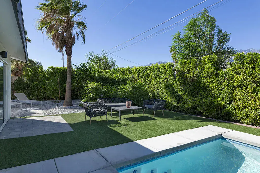 Experience luxury desert living at its finest with this fully updated and stylish 3-bedroom, 2-bathroom home offering a resort-style backyard and beautiful mountain views. Situated on a generous corner lot, this immaculate property is perfect for both entertaining and relaxing in true Palm Springs style.From the moment you enter, modern design and comfort greet you. Updated windows and doors fill the home with natural light while showcasing the gleaming tile flooring, designer color palettes, and surrounding mountain scenery. The flexible layout includes a spacious living area and a secondary sitting area ideal for lounging or reading.The open kitchen features light wood cabinetry, a full suite of stainless-steel appliances, a sleek tile backsplash, and a dining counter with a waterfall edge. Adjacent to the kitchen is a welcoming space with a fireplace currently serving as the dining area, which is ideal for gatherings and conversation. From here, sliding glass doors connect the interior to a private resort-inspired backyard complete with a sparkling pool, raised spa, and multiple seating areas. Several lounging zones feature low-maintenance artificial turf and there is a cozy gas firepit for evening enjoyment. A stylish dining pergola with bistro string lighting adds a touch of romance to outdoor entertaining.The primary suite opens directly to the backyard and offers a tranquil retreat with mountain views, ample closet space, and a beautifully updated en-suite bathroom. Two additional bedrooms are located at the front of the home with bright eastern exposure, accompanied by a designer hall bath featuring modern tile and fixtures.Additionally, there is an attached two-car garage with stacked laundry. The side yard provides RV parking in case your Airstream needs a home. For buyers seeking economic flexibility, this property qualifies for a junior rental permit through the City of Palm Springs, allowing up to six short-term rentals annually and unlimited stays of 30 days or longer–making it a perfect option for those wishing to offset living expenses with rental income.