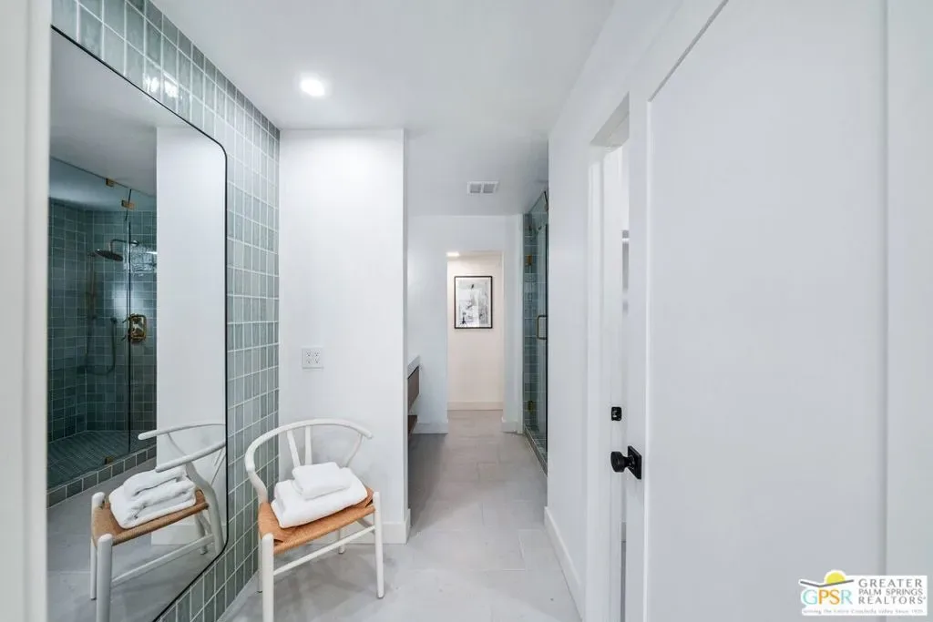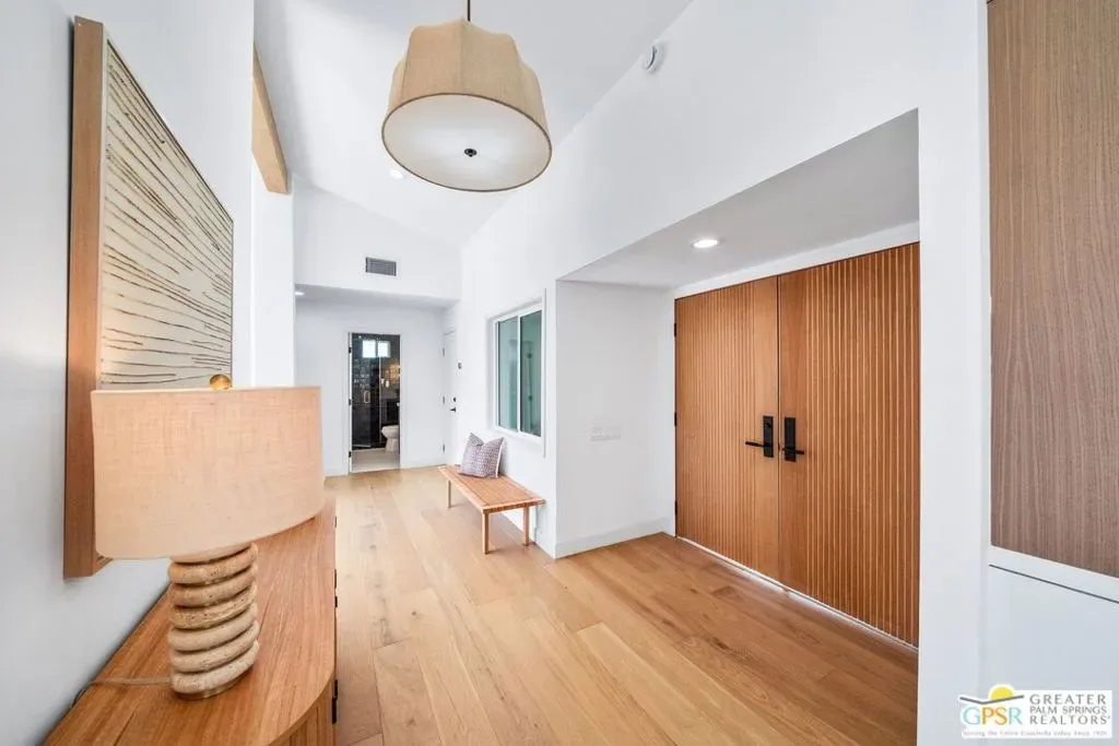 Set against a panoramic backdrop of Mount San Jacinto, this beautifully reimagined Palm Springs luxury retreat delivers the desert’s most sought-after combination: a true private resort setting, dramatic sit-down views, and a rare double-lot opportunity approximately .45 acre of outdoor living, entertaining, and future potential. Renovated from top to bottom with a refined, design-forward palette, the home features engineered white oak flooring and a showpiece great room with soaring vaulted ceilings and white-oak wrapped beams, anchored by a striking fireplace. Oversized picture windows and French doors create an effortless connection to the outdoors, with pool, spa, and mountain views enjoyed right from the living room the quintessential “view-side” experience. At the heart of the home, the chef’s kitchen impresses with custom cabinetry, built-in Signature appliances, and an expansive island designed for gathering. A separate dining area and wine bar complete the entertaining flow, all finished with clean lines, warm wood accents, and elevated hardware/lighting. Designed for comfort and privacy, the residence offers three luxe suites plus a fourth bathroom, each finished with spa-level style and designer tile from Bedrosians Tile & Stone. One suite features a true resort-inspired bath with a dedicated shower-and-soaking-tub room, while the remaining baths showcase beautiful walk-in showers crisp, modern, and impeccably detailed. Two suites open directly to the pool deck for seamless indoor-outdoor living; the third suite opens to its own private patio with easy access to the resort yard. Step outside to your own desert oasis: a sparkling heated pool and spa (fully renovated with Pebble Tec finish and new equipment), a bocce ball court, and expansive grounds framed by fresh hardscape and landscape improvements ideal for sun, stars, and unforgettable gatherings. Additional upgrades include multi-zone air conditioning, a custom courtyard entry, custom garage door, EV charging in the garage, and owned solar paid in full (not leased) for modern efficiency. Rare double-lot offering: Two residential lots sold as one offering exceptional flexibility for a future second residence or potential lot split. And for year-round livability, the home’s orientation captures the magic of desert light winter sun and bright interiors while keeping the summer months comfortable.