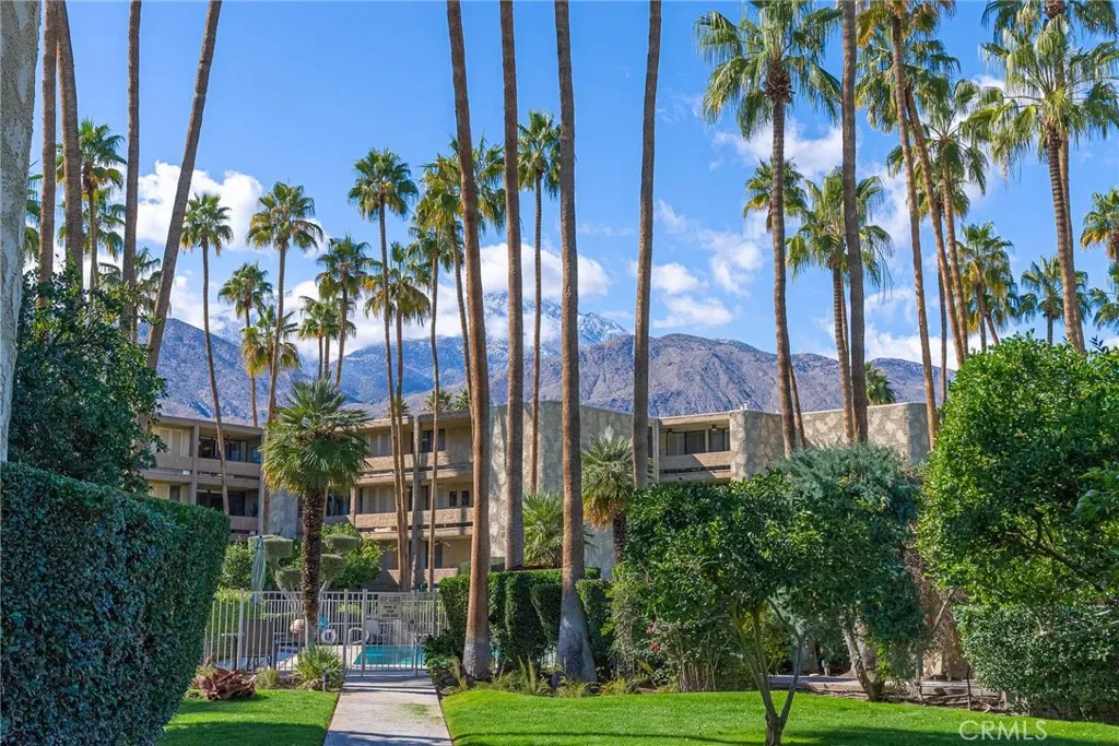Welcome to The Diplomat—an iconic South Palm Springs address—where double doors open to a spacious two-bedroom home designed for effortless desert living. Floor-to-ceiling windows showcase incredible mountain and palm views, bathing the space in natural light and creating an inviting indoor-outdoor atmosphere. The extended galley kitchen is functional, featuring dual French-door stainless refrigerators, ample cabinetry, and a built-in office nook ideal for remote work or everyday planning. A mirrored wet bar connects seamlessly to the open living and dining area, where upgraded lighting sets the perfect mood for relaxing evenings or entertaining guests. The primary suite is a true retreat with double sinks, a walk-in closet plus an additional slider closet, and peaceful views. A well-positioned guest bedroom and nearby three-quarter bath add flexibility for visitors, hobbies, or a home office. Enjoy the ease of secure underground parking with elevator access, just steps from your front door. Developed by renowned builder Robert Grundt, The Diplomat is admired for its striking sculptural architecture, lush landscaped open space, and resort-style amenities, including a sparkling pool and spa. The HOA includes Spectrum TV with premium channels, Wi-Fi internet, water, and trash, making ownership refreshingly low-maintenance. Just across the street from Smoke Tree Village, you’ll have markets, boutique shops, a pharmacy, and local restaurants right at your fingertips.