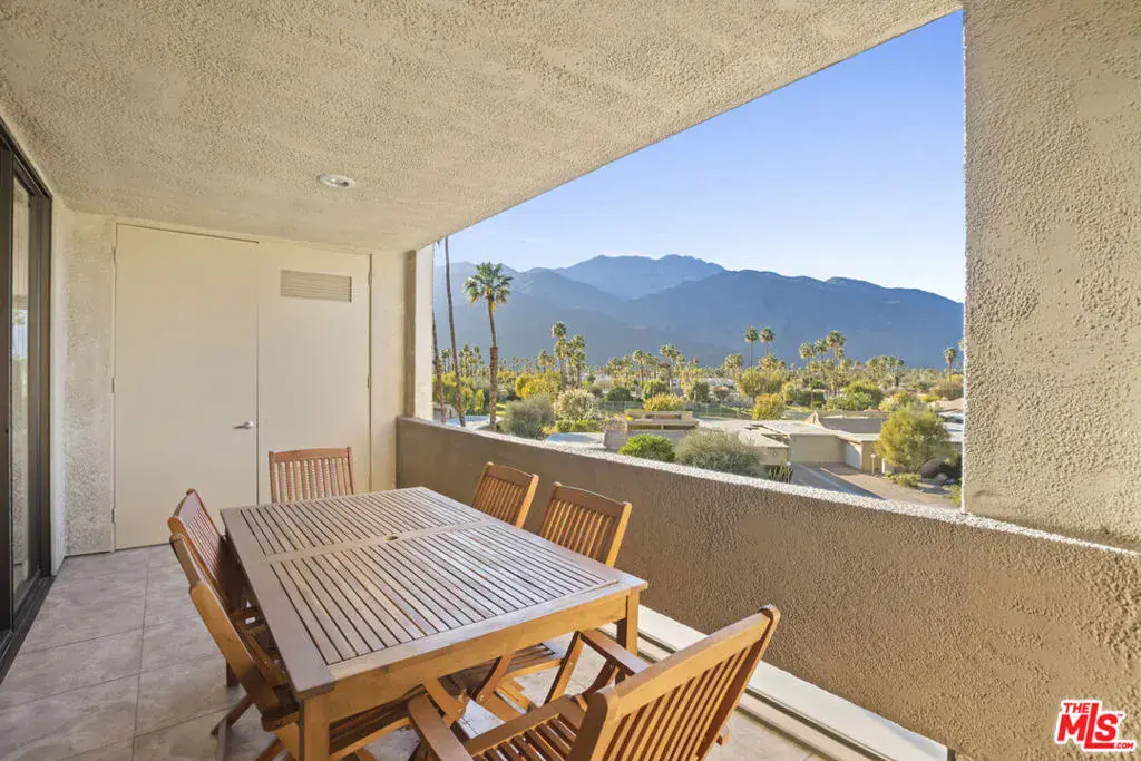 THE MESMERIZING VIEWS FROM EVERY ROOM WILL BLOW YOU AWAY! This 2 bedroom and 2 bathroom updated 3rd floor penthouse unit with approximately 1,850 square feet is being sold turnkey and is fully furnished with solid wood furniture in a neutral and beachy vibe and color palette to naturally blend in with the beautiful surroundings. The unit features travertine floors in the common areas, floor to ceiling sliding doors, new carpeting in the bedrooms and stone floors in the bathrooms. The expansive living room features 2 sofas that are convertible into chaise lounges as well as queen beds (not pull out sofas), a 75″ TV that also displays artwork and a mountain viewing seating area. There is also an original, working 1953 vintage Palm Springs pinball machine to complete that true Palm Springs vibe. The spacious kitchen features ample white washed wood cabinetry and newer stainless steel appliances and a wet bar. There is ample storage throughout the interior and exterior of the unit including a cedar lined closet. This 3RD floor penthouse level unit offers jaw dropping 180+ degree unobstructed views encompassing the Santa Rosa Mountains to the south, the San Jacinto Mountains from the southwest, west and the northwest all the way to the windmills. In addition to the very large interior square footage, there are huge covered and tiled outdoor galleries totaling approximately 465 square feet which are perfect for taking in the majestic views, relaxing, entertaining and al fresco dining. The year-round sunsets are truly spectacular and the perfect close to your day. Laundry closet located on the dining gallery located adjacent to the interior dining room. Only one common wall. The Diplomat HOA features secure app controlled entry, elevator access including to the rare, gated underground parking with assigned space, guest spaces and approximately 5 acres of gated, lushly landscaped and maintained grounds which include a heated swimming pool and spa. All of this plus walking distance to popular restaurants, bars, grocery stores, retail shops, banks and just a short drive to the rest of beautiful Palm Springs. Owner financing possible for qualified buyers and is preferred by the owner. Listing broker is the owner.