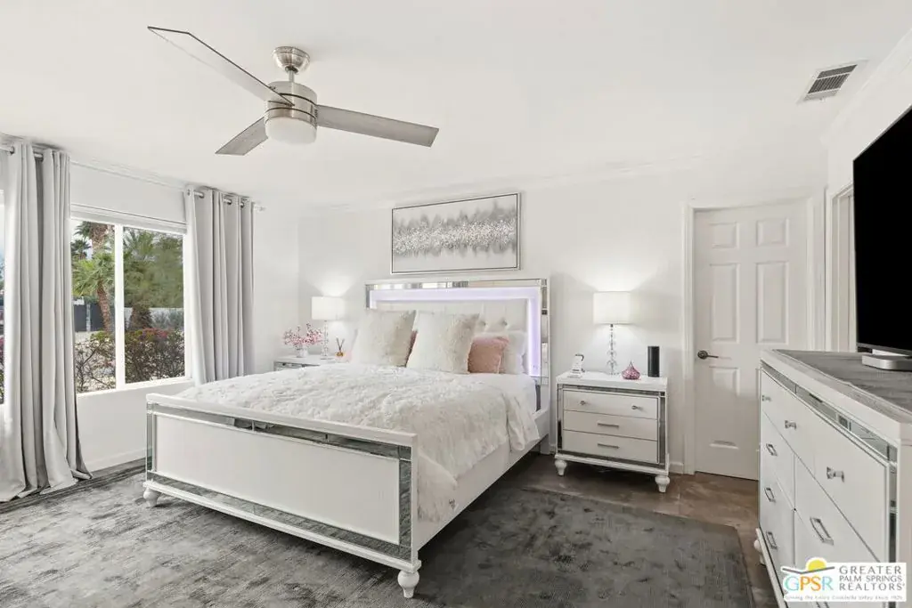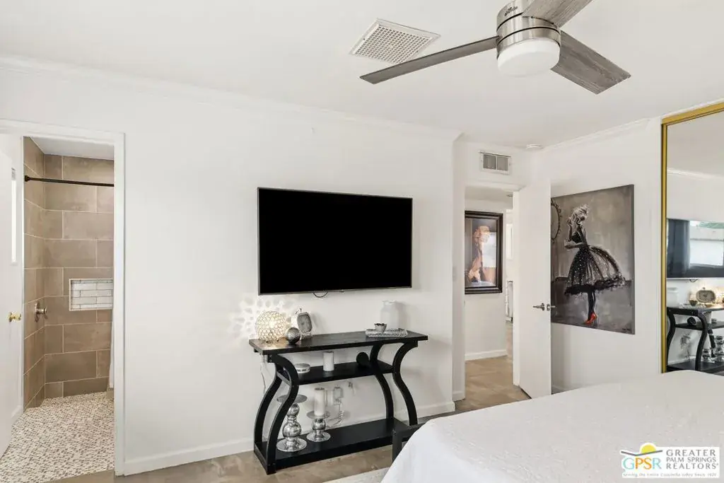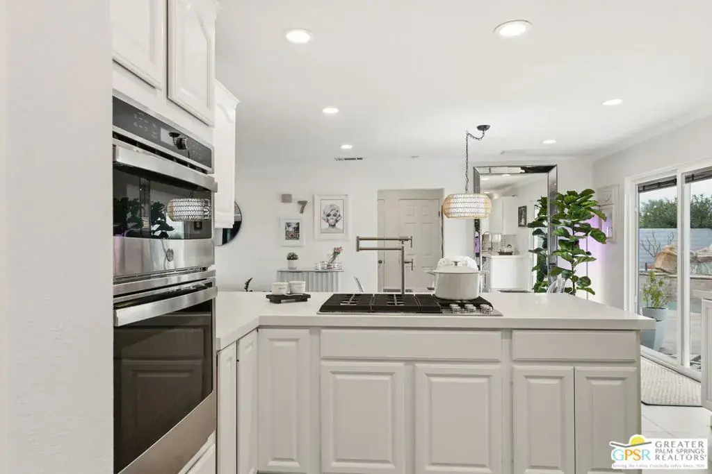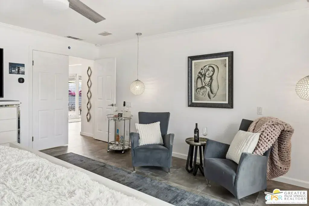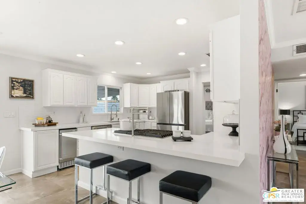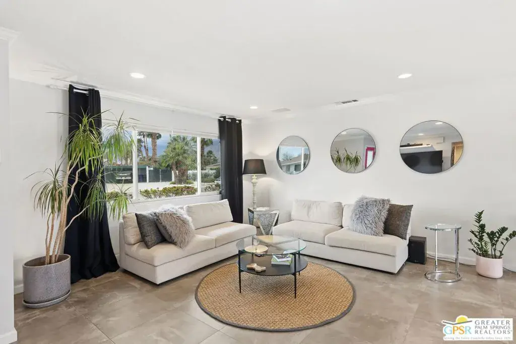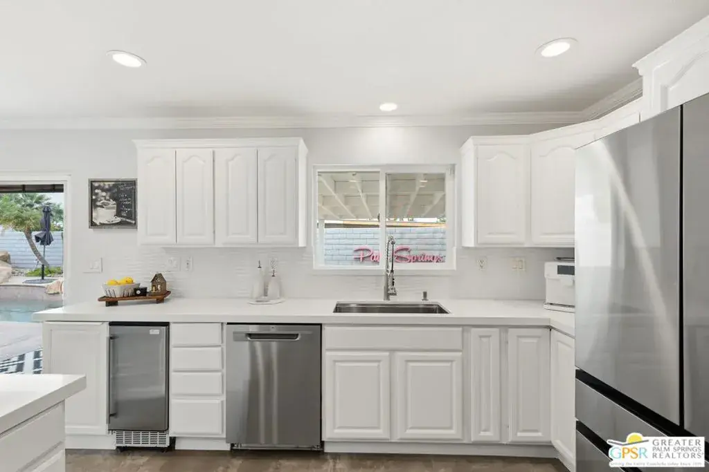 Live the Palm Springs lifestyle in this beautifully updated mid-century ranch home located in the heart of iconic El Rancho Vista Estates. This 3-bedroom, 4-bathroom home with detached casita and owned solar on land you own blends classic ranch-style architecture, modern comfort, and a fun, easy indoor-outdoor vibe all framed by wonderful mountain views. Inside, the light-filled living spaces showcase the relaxed appeal of mid-century ranch design, with clean lines, comfortable proportions, and an effortless flow that’s perfect for both laid-back living and lively gatherings. The spacious living and dining areas connect seamlessly to the backyard, where the mountain backdrop adds to the home’s unmistakable Palm Springs charm. The renovated kitchen is both stylish and functional, featuring new quartz countertops, a new backsplash, and new stainless steel appliances including a pot filler and built-in icemaker, along with ample cabinetry and generous prep space for cooking, entertaining, or casual everyday living. The home offers two primary suites, providing excellent flexibility for hosting guests or multi-generational living. The larger primary suite serves as a true retreat with abundant space, great natural light, a private en-suite bathroom, and a massive walk-in closet. An third guest bedroom adds further versatility for visitors, workspace, or hobbies, while the detached casita is ideal for guests, a home office, or creative studio. Outdoors, the private backyard is designed for enjoying the desert lifestyle, featuring a brand-new pergola, a large pool and spa with waterfall, and plenty of room for lounging, dining, entertaining, or letting pets roam and play. Surrounded by wonderful mountain views, it’s a space made for both quiet mornings and festive Palm Springs evenings. With owned solar, new exterior paint, a water filtration system, numerous upgrades throughout, classic mid-century ranch character, and a location in one of Palm Springs’ most recognizable and sought-after neighborhoods, this home delivers style, personality, and the true spirit of desert living.