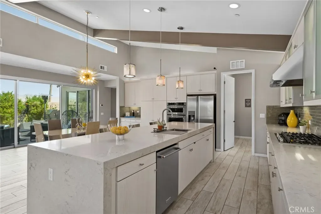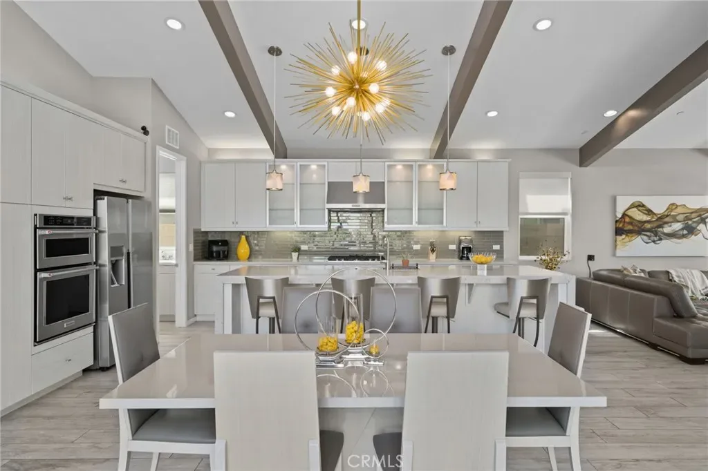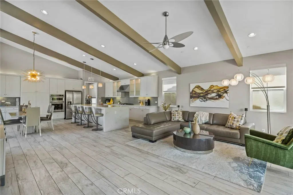 Step inside to an open-concept floor plan filled with natural light, soaring ceilings with exposed beams, and clean contemporary finishes throughout. The spacious kitchen features sleek cabinetry, a large center island with seating, and seamless flow into the dining and living areas—ideal for both everyday living and entertaining.