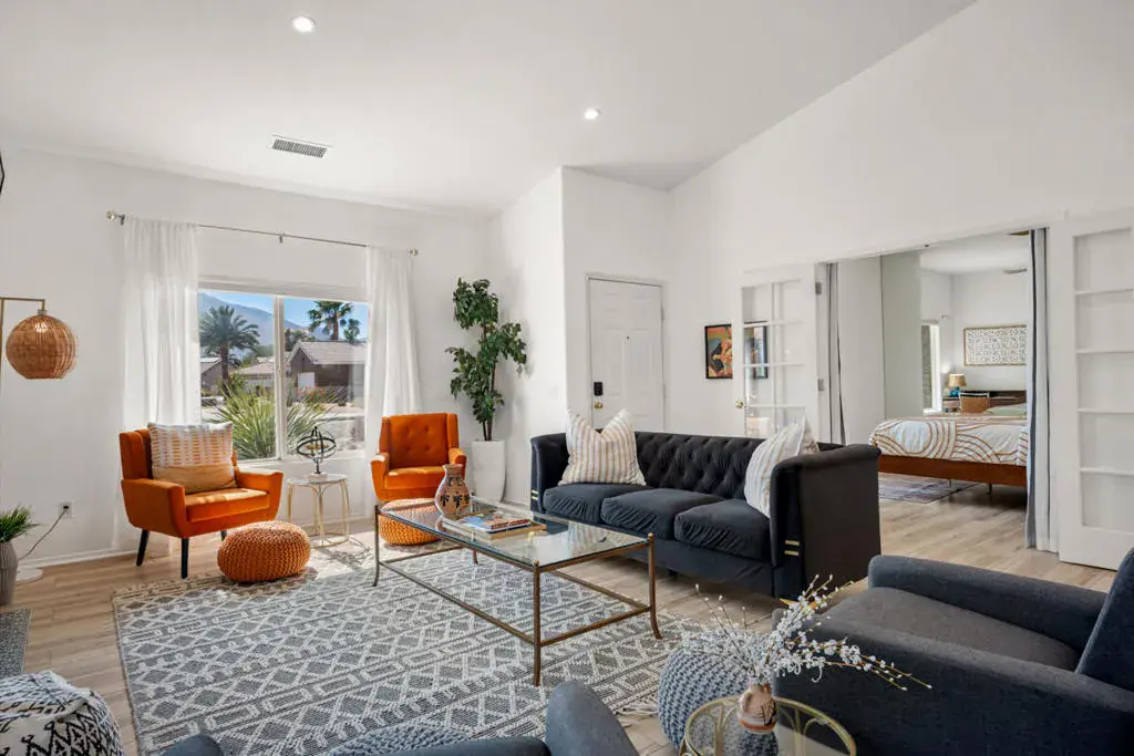 Best Deal in Palm Springs! Enjoy breathtaking west-facing mountain views from this beautifully appointed 4-bedroom, 2-bath home in the highly sought-after Flora Vista neighborhood. From the moment you enter, soaring ceilings, abundant natural light, and a cozy fireplace create a warm and inviting atmosphere ideal for both relaxing and entertaining. The spacious living room showcases stunning mountain views, providing a dramatic backdrop for everyday living. The remodeled, chef-inspired kitchen features modern appliances, sleek countertops, and custom cabinetry, opening seamlessly to a comfortable family room perfect for gatherings. The primary suite is a true retreat with high ceilings, dual-sink vanity, walk-in shower, and separate soaking tub–ideal for unwinding after a long day. Additional highlights include a dedicated laundry room with newer washer and dryer and direct access to the attached two-car garage. Step outside to your private backyard oasis, complete with a sparkling pool and spa and a covered patio ideal for outdoor dining or relaxing evenings under the desert sky. Perfect as a full-time residence, desert getaway, or investment property, this home delivers comfort, style, and exceptional value. Don’t miss the opportunity to make it yours!