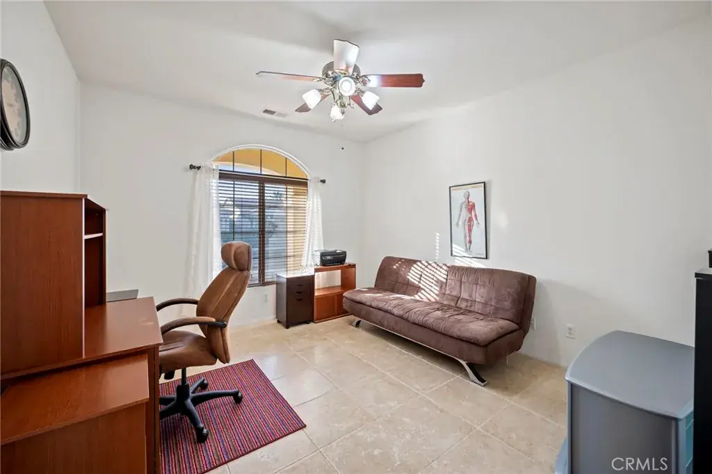 Discover serene desert living in this single-family residence located within a private gated 55+ community. This home is situated on a quiet corner lot and features low-maintenance desert landscaping with breathtaking mountain views. Inside, the inviting open floor plan is defined by elegant arched corridors and durable tile flooring throughout the living areas. The main living and dining space offers a cozy corner fireplace, perfect for everyday comfort. The functional kitchen features white cabinetry, a large center island, and Whirlpool appliances. The layout includes a third bedroom with a large arched window, serving as an ideal home office. The primary suite provides a private retreat with dual vanities, a separate soaking tub and shower, and two spacious walk-in closets. Outdoor living is simplified with a spacious concrete backyard and a covered patio for shaded relaxation. Residents enjoy access to a community pool and spa, and the community grounds are beautifully landscaped and well-maintained. Additional features include a dedicated laundry room with a utility sink and a finished 2-car garage. Recent updates include a new HVAC system, water heater, and garage door with motor, offering added peace of mind for years to come. This move-in-ready property is where low-maintenance living and resort-style comfort finally come together.