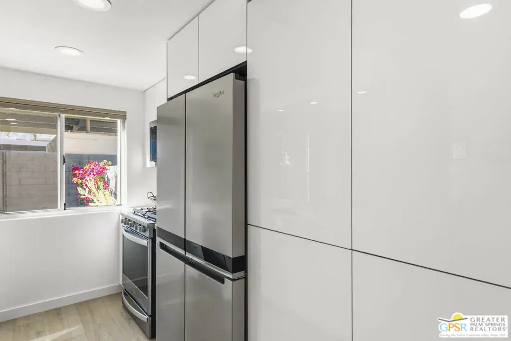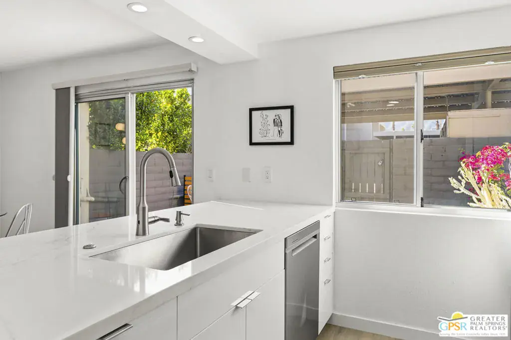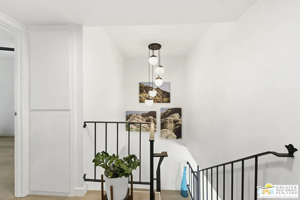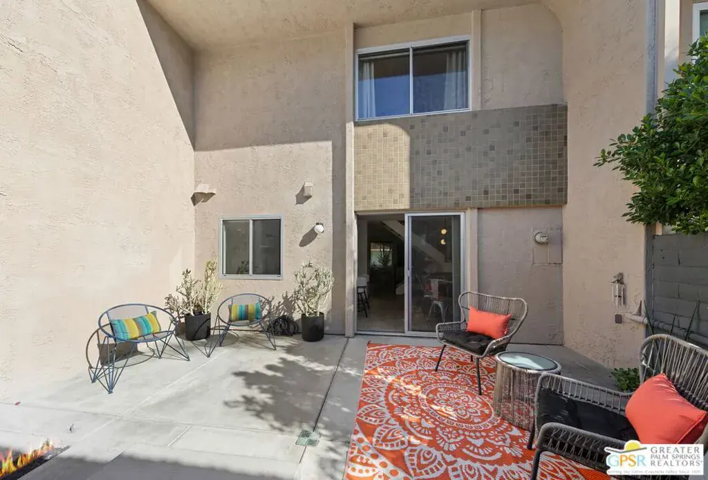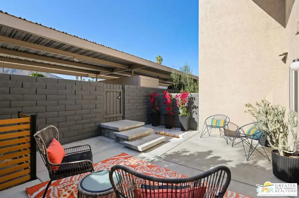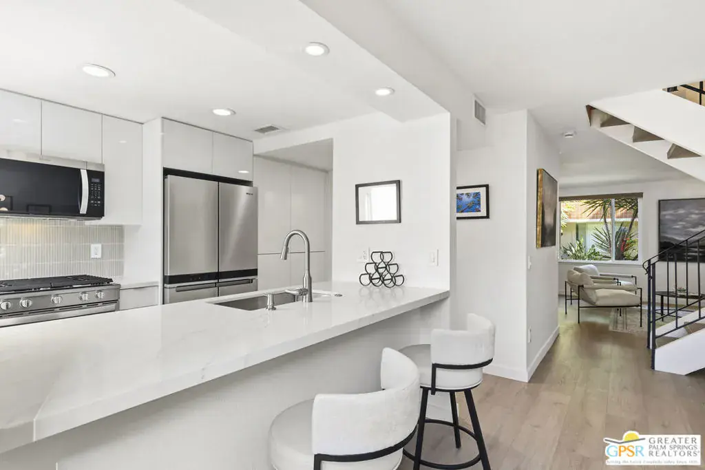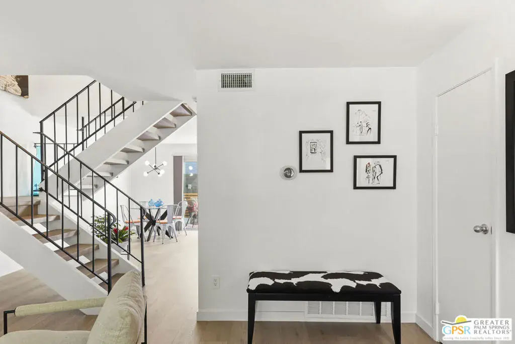 Welcome to 250 E Via Escuela #C in the gated Indian Canyon Gardens community. This is your opportunity to own a fully renovated, high end remodel with a show-stopping staircase with open risers that separates the living and dining areas. Newly installed luxury vinyl plank flooring throughout, freshly painted throughout, all new electric plugs, switches, dimmers and screwless switch plates. The kitchen has white, high gloss, flat panel cabinetry with a gorgeous backsplash, stunning quartz counters and brand new stainless appliances. Nearby is the laundry area with a top loading washer and matching dryer. The newly renovated powder room completes the first floor. Upstairs the primary bedroom has been remodeled, has mountain views and has newly added primary bath with large format porcelain tile and Hans Grohe fixtures. To complete the primary suite is a thoughtful closet organization system. There are 2 additional bedrooms and a renovated guest bath with the same high end finishes. Brand new 18 SEER HVAC system, brand new Navien Tankless hot Water heater, dual pane windows throughout, ceiling fans in each of the bedrooms, plus new window coverings make for a very energy efficient condo. This well appointed home includes the furniture and furnishings with some exclusions. Outside, your private west facing patio space is perfect for relaxing and entertaining. Benefit from two side by side carport parking spaces and adjoining storage both with direct access to your patio. Dive into one of two sparkling pools or unwind in the spas within this well maintained and landscaped community. With its prime location, sought-after amenities, and low HOA fees, this Palm Springs retreat is ready for you to call home!