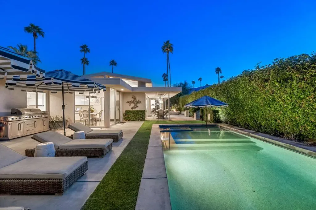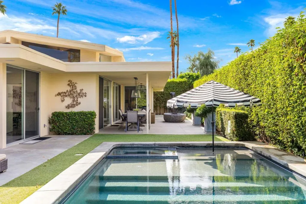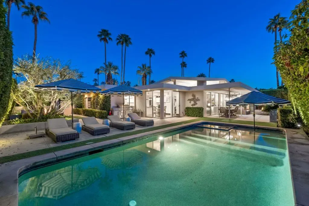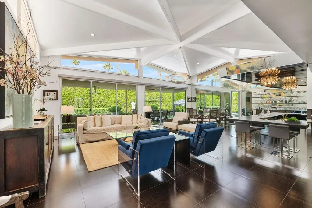 PRICED to sell! CLASSIC 70’s Palm Springs home selling with FURNISHINGS INCLUDED! FEE LAND and NO HOA in the Canyon Palms section of Indian Canyon. This stunning showplace is on a corner lot and no wires. Private pebble pool & spa, patios and retreat areas. Massive granite fire features and manicured sculpture gardens with olive trees and custom lighting to delight you and your guests. Ideal for outdoor dining. Offering generous square footage (over 2,700) with 2 LARGE bedrooms, PLUS a den or media room (bedroom option) and 3 baths. Outdoor shower, just for fun! Design and enhancements by the former International Creative Director for Ralph Lauren and concept creator of Williams Sonoma Home. Carefully curated, this home is stately and chic throughout, the quality is obvious. Beautiful selections of porcelain tiles, granite and stone. Don’t miss one of the most impressive and dramatic residential bars in all of Palm Springs! Bosch stainless appliances, updated windows and doors, leak defense and water treatment systems. TOTAL foam roof refresh completed in 2026! This exceptional home is elegant and sophisticated. No work to be done, just relax, entertain and enjoy! Mere minutes to downtown, airport, Indian Canyon golf, and Smoke Tree.